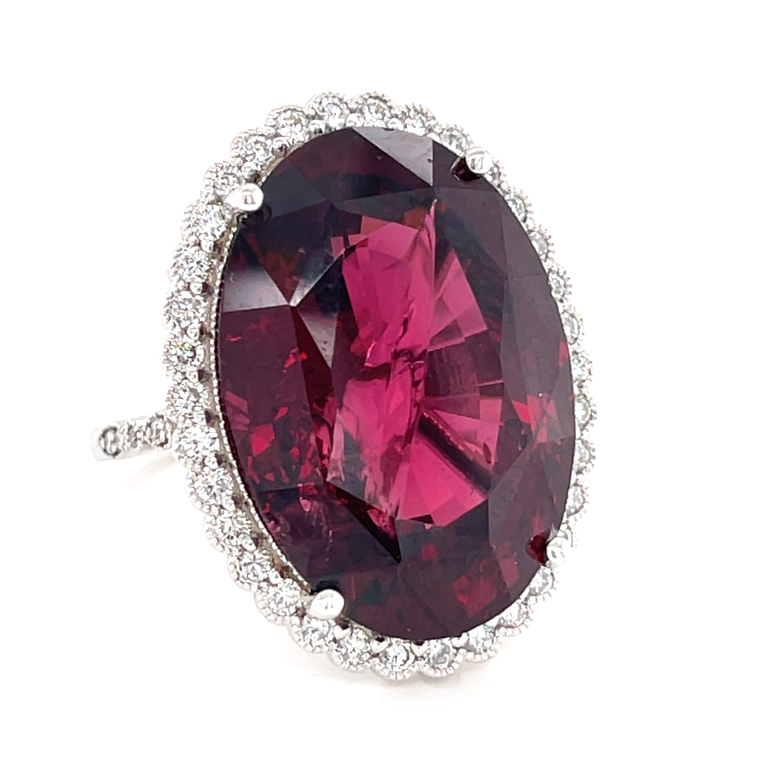 18k White Gold & 37.3ct Oval Garnet Ring w/ 0.75ct Diamond Halo, Size 7.