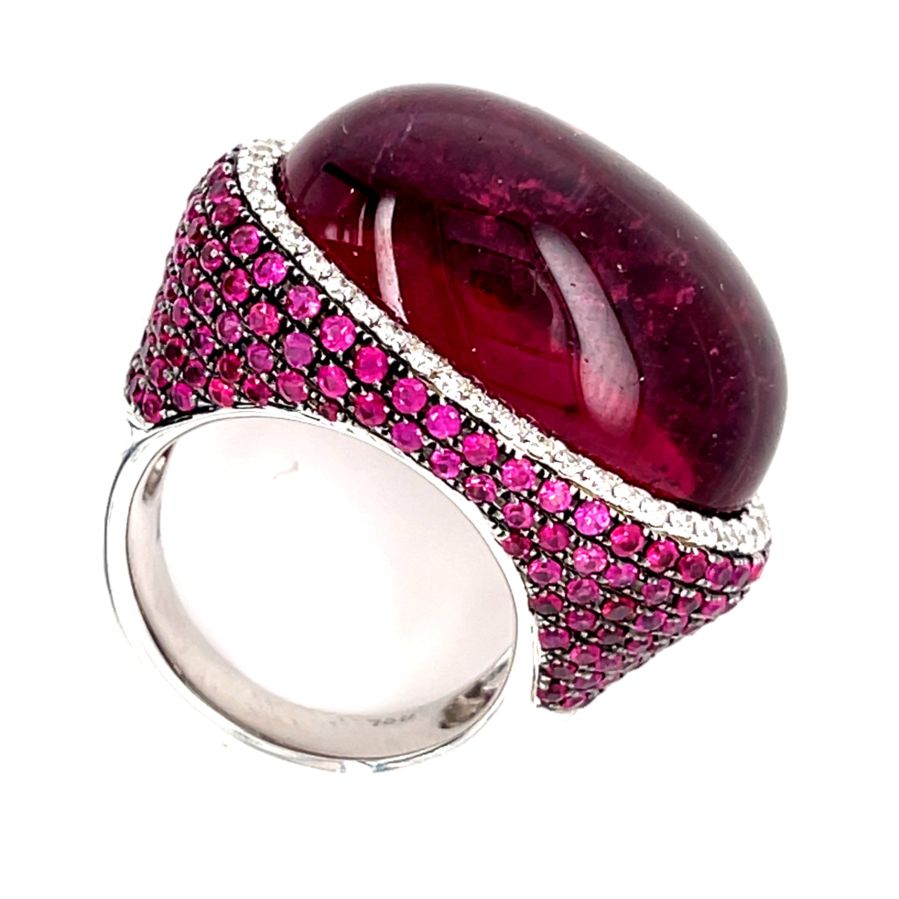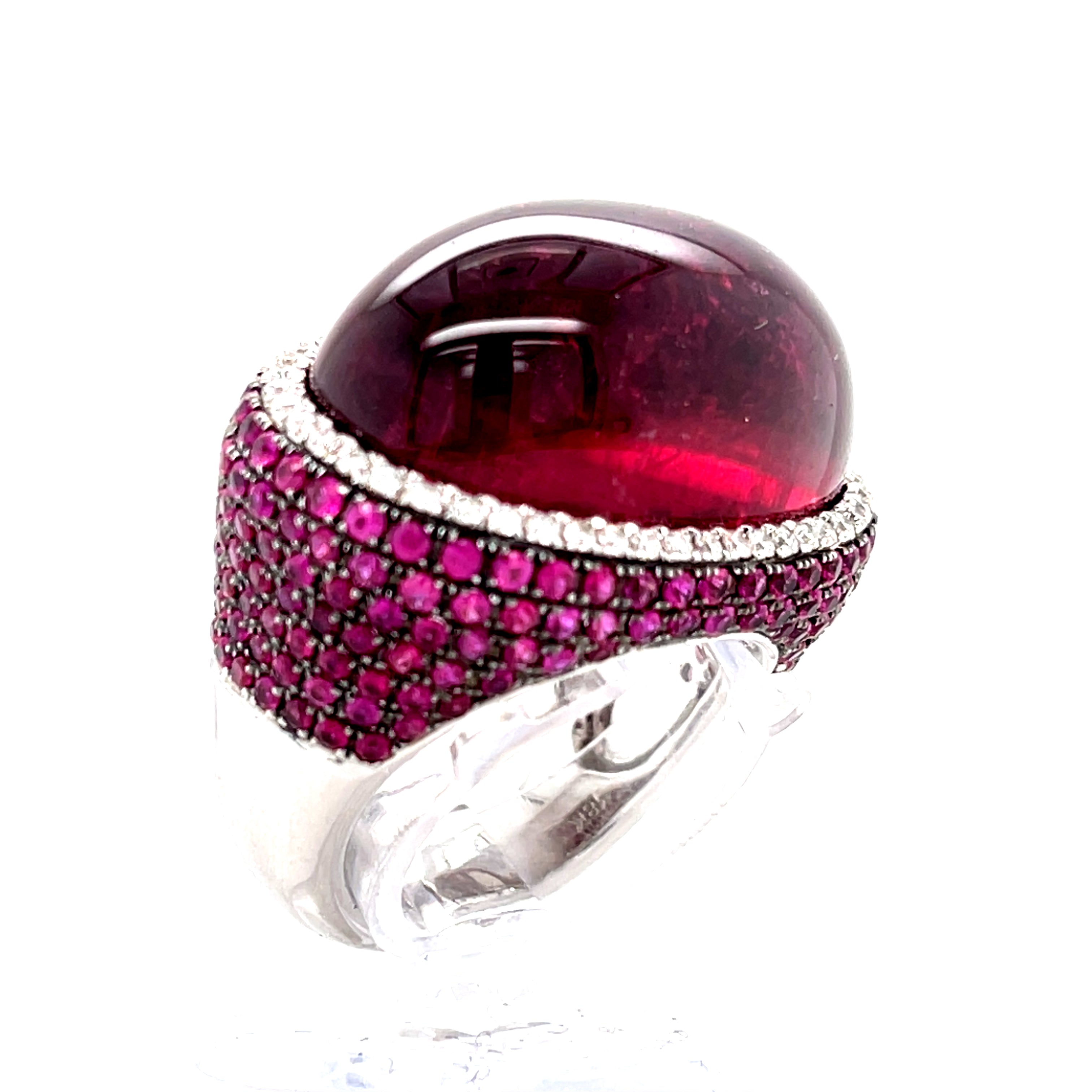 18k White Gold & Rubellite Tourmaline Cabochon Ring w/ Diamond, Ruby Accents, Size 7.