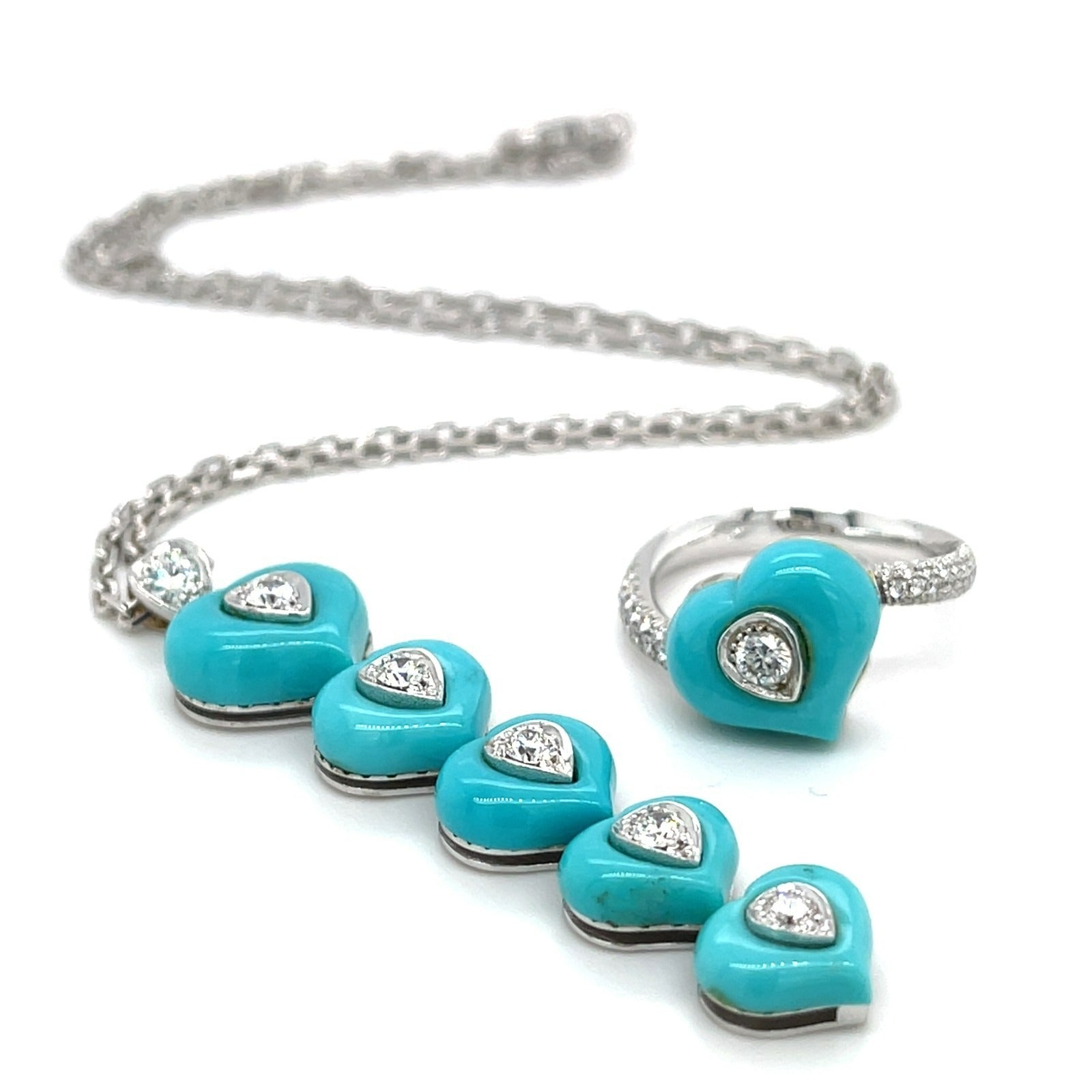 18k White Gold & Turquoise Heart Jewelry Set w/ 1.5ct Diamonds, Necklace (16") and Ring (Size 7)