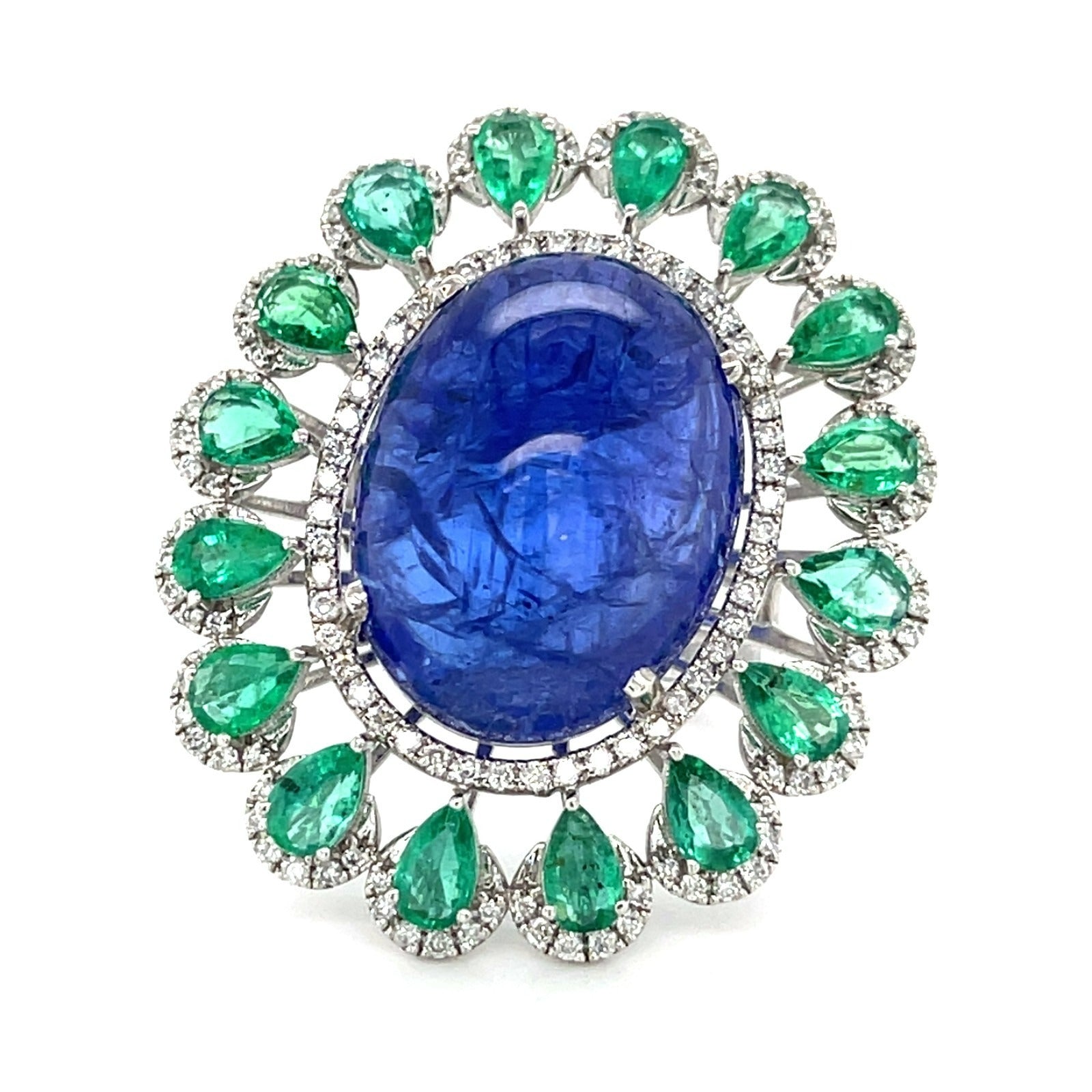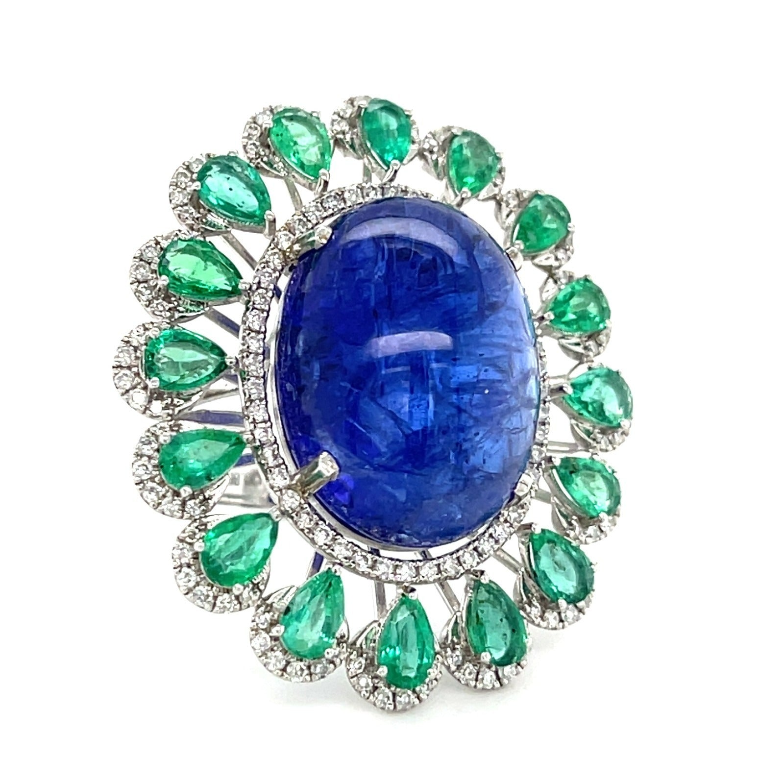 18k White Gold & Tanzanite Cabochon Ring w/ Emerald, Diamond Accents, Size 6.5