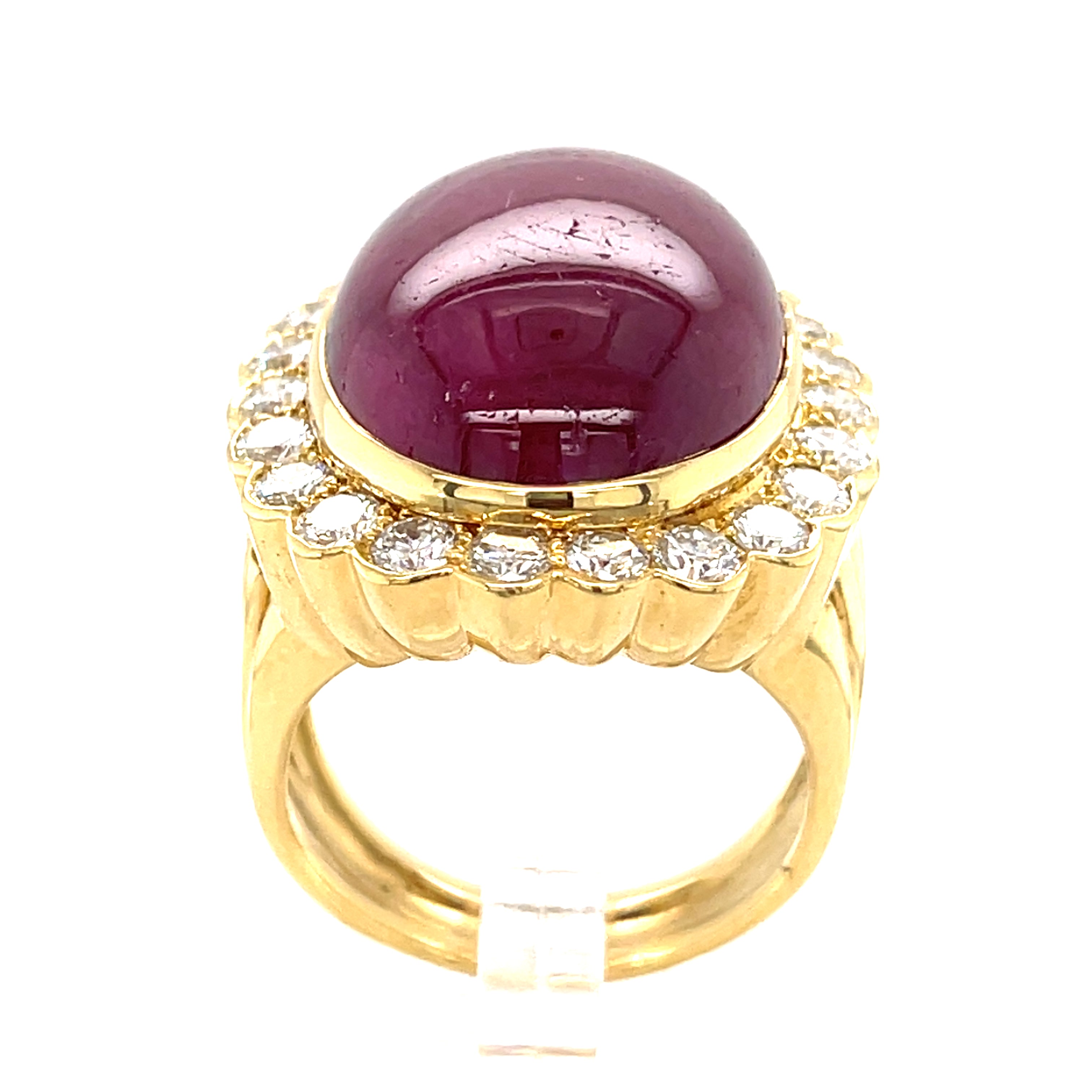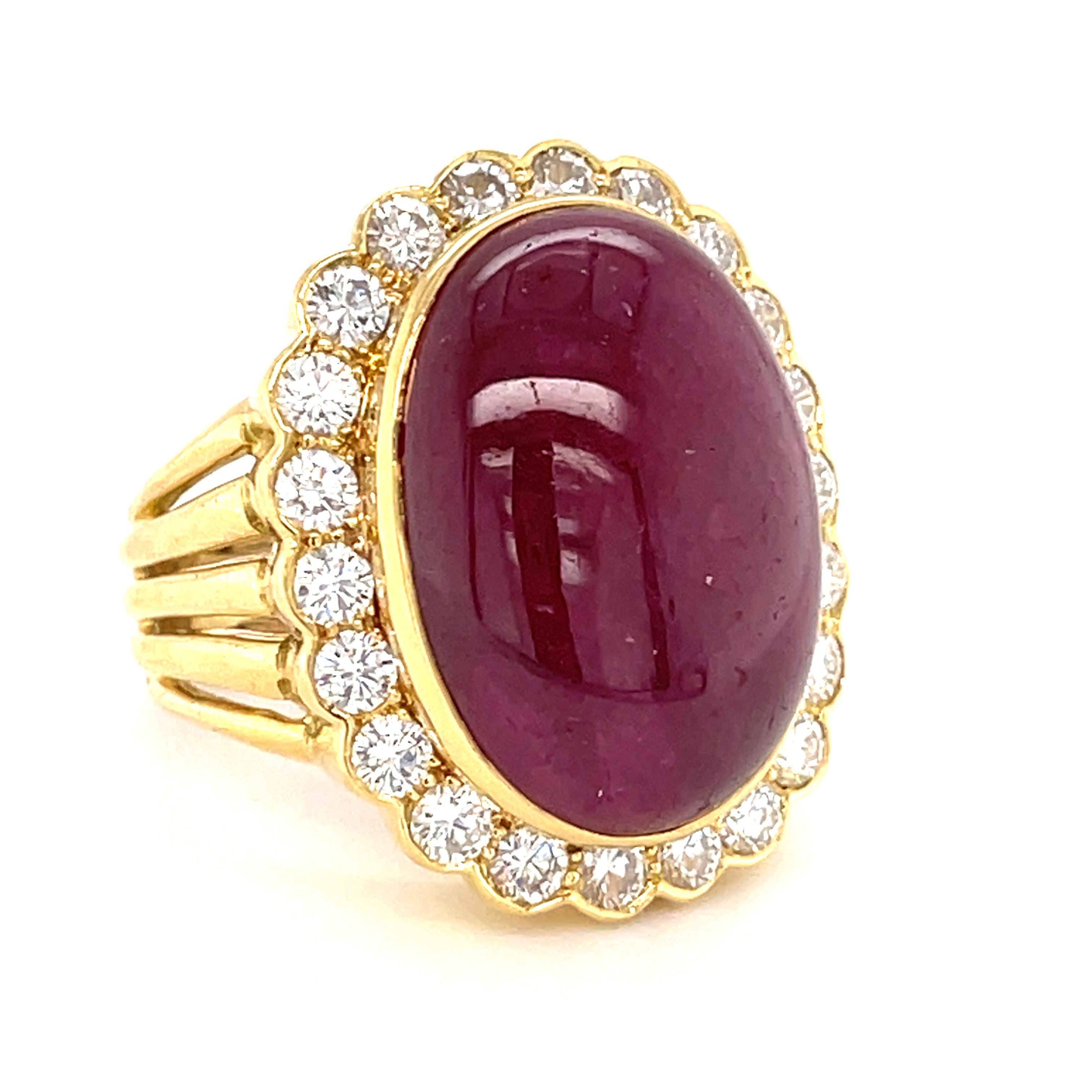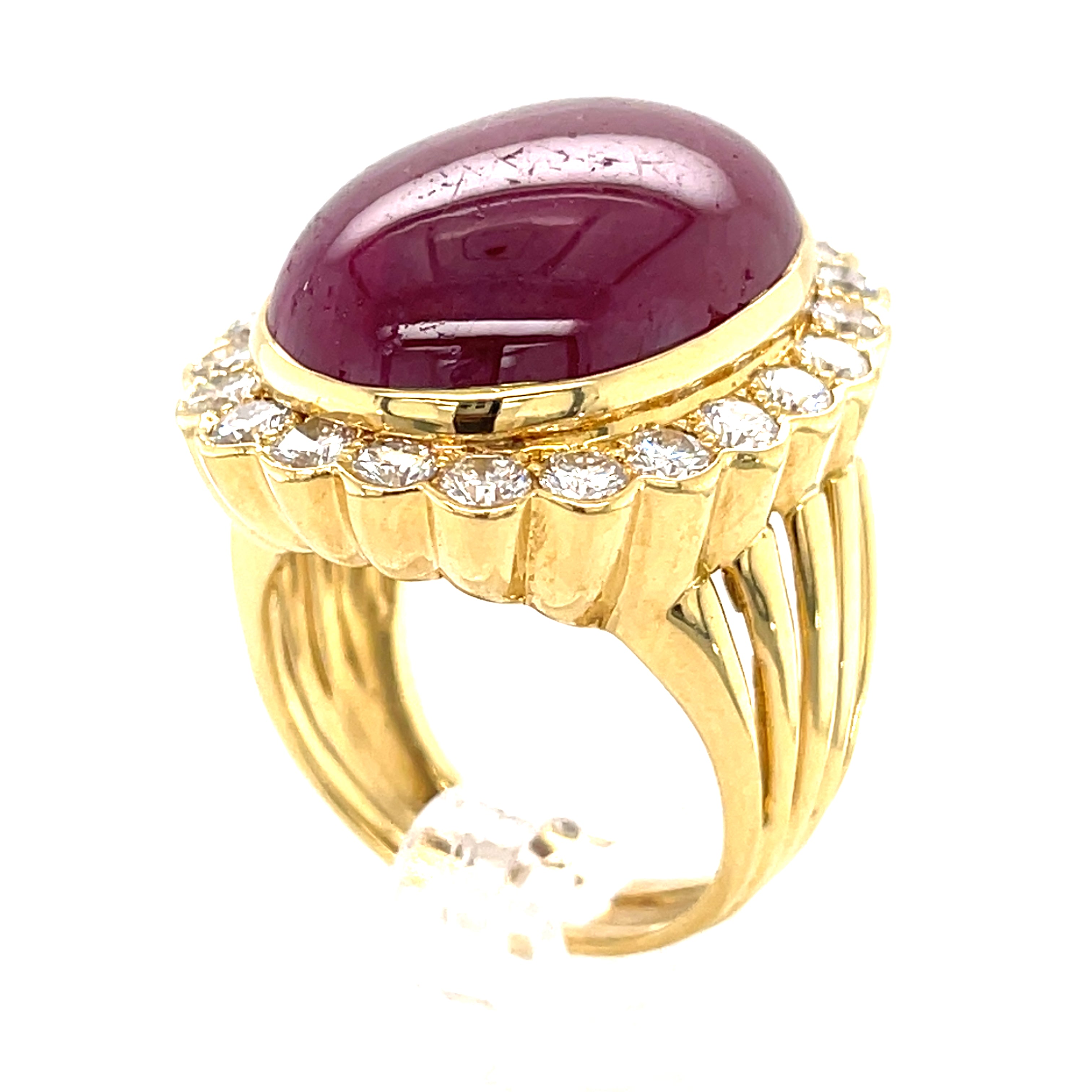 18K Yellow Gold & 35.7ct Ruby Cabochon Ring w/ 2.2ct Diamond Halo, Size 10.