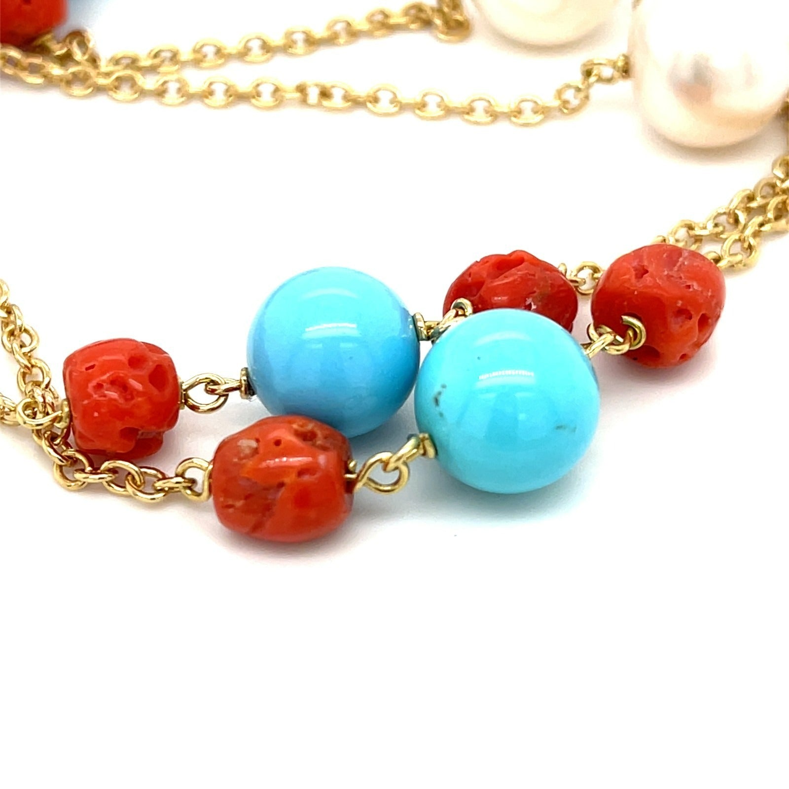 18k Yellow Gold & Cultured Pearl Chain Necklace w/ Turquoise and Coral Beads, Length 38"