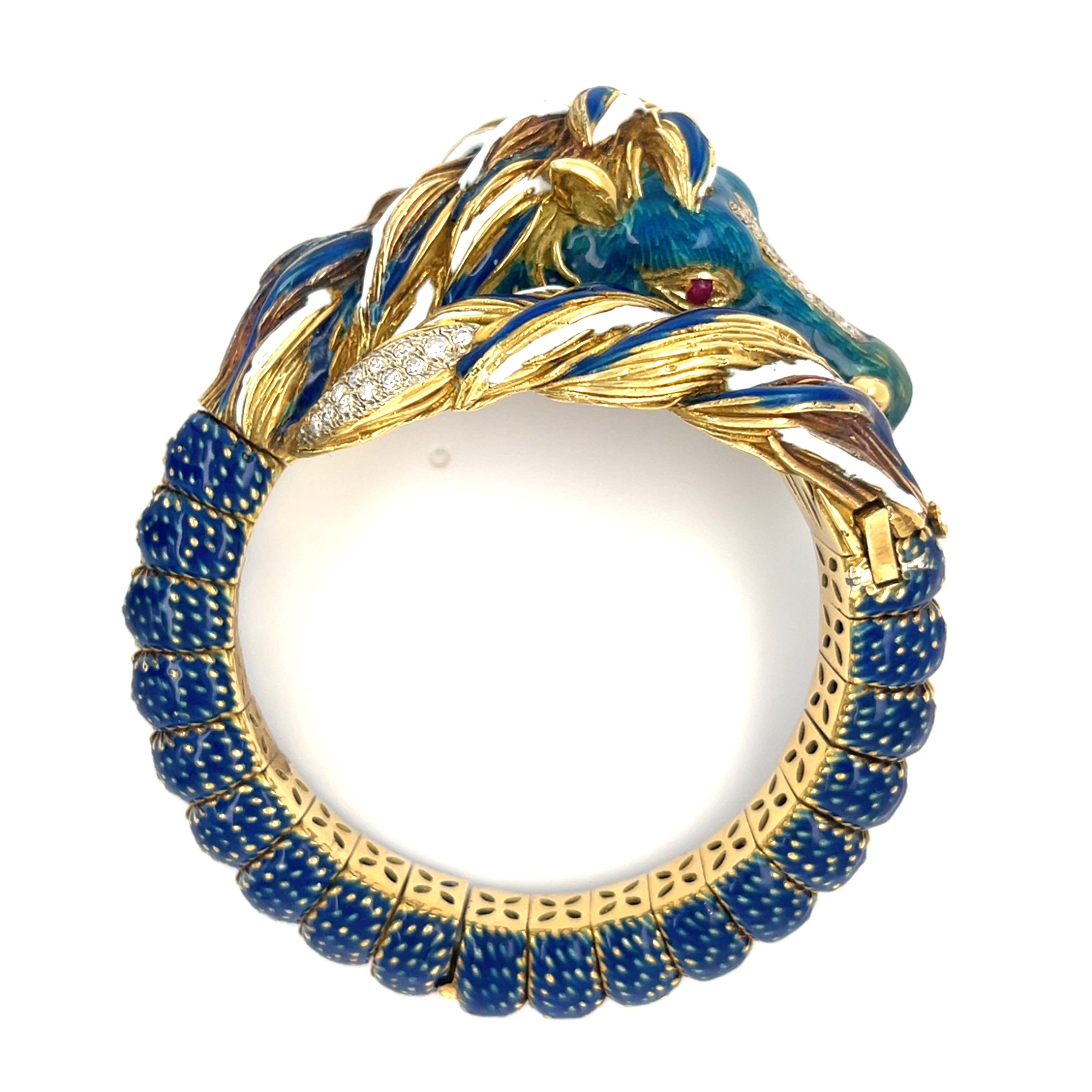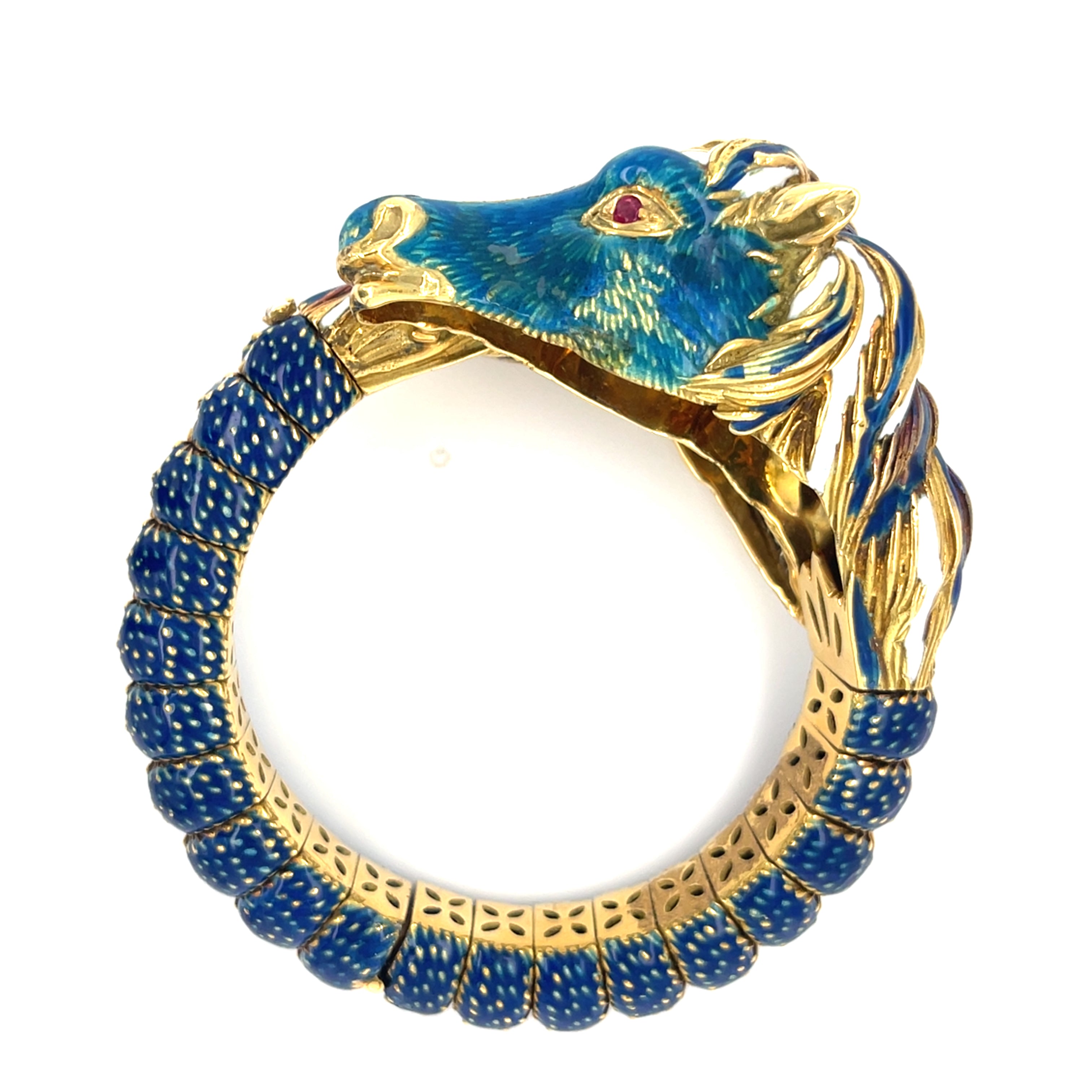 Frascarolo 18k Yellow Gold Diamond, Ruby, and Enamel Horse Bangle 1960s