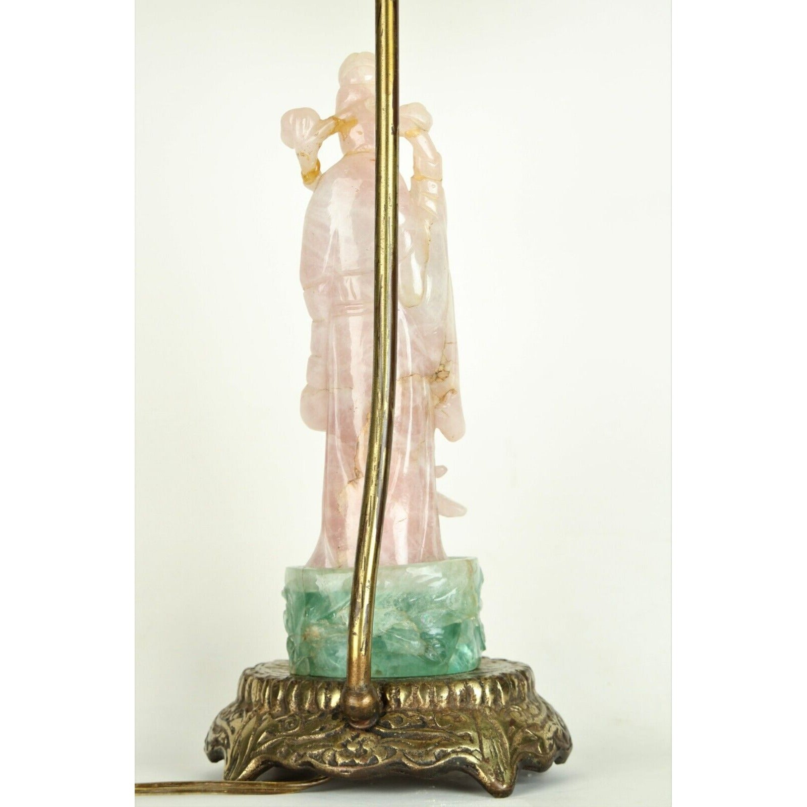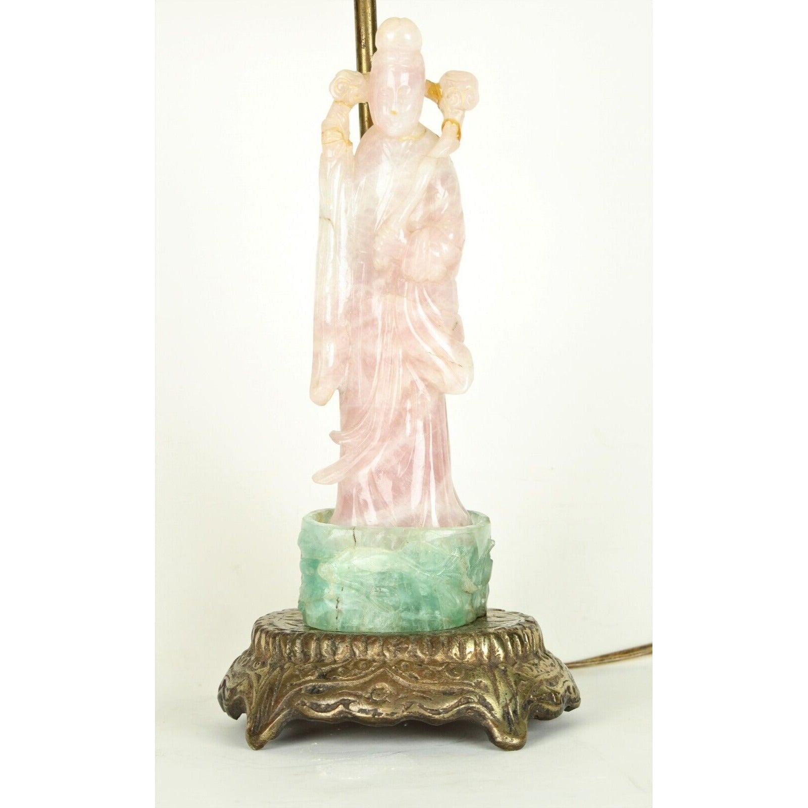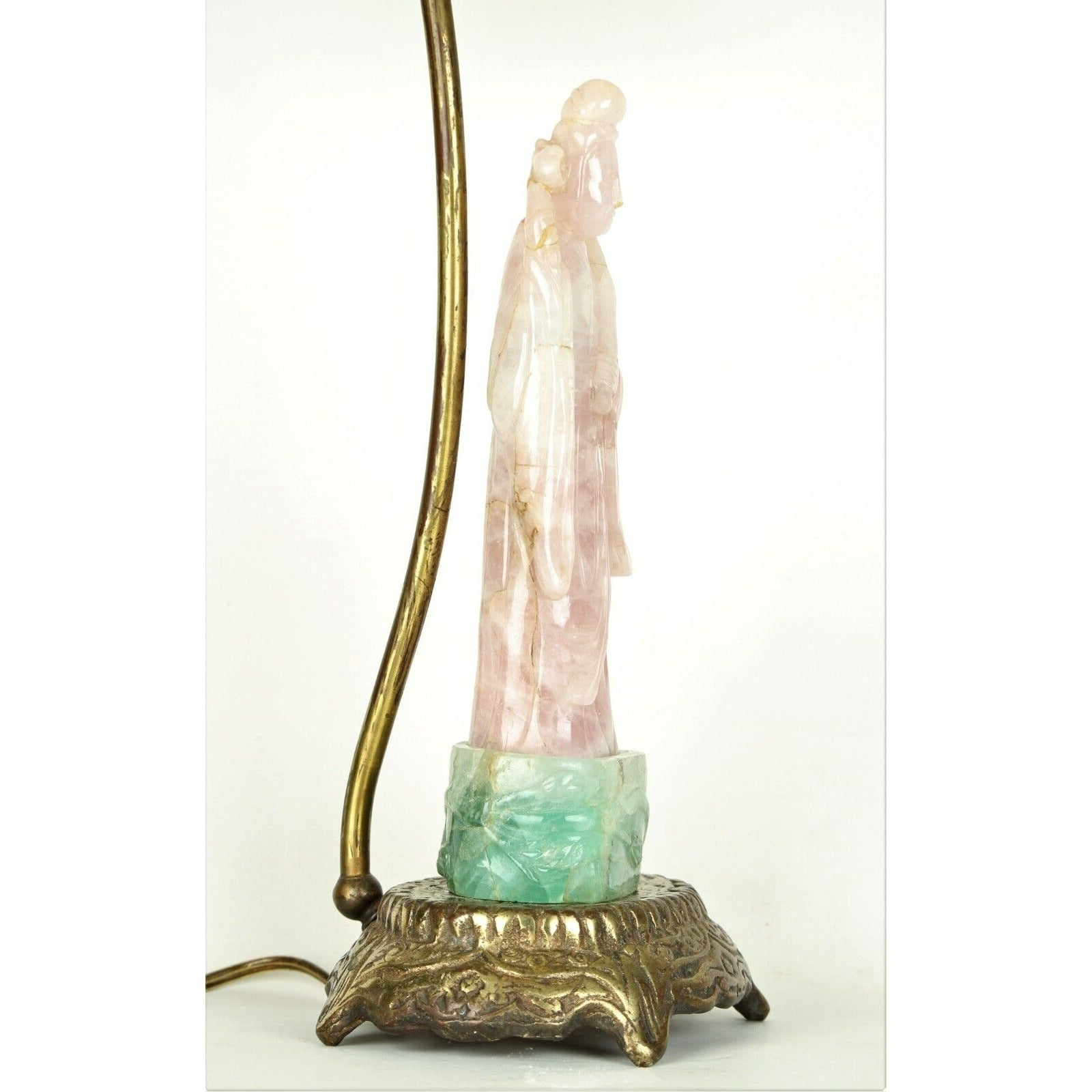 Guanyin Table Lamp 20th Century Chinese Carved Rose Quartz and Green Fluorite