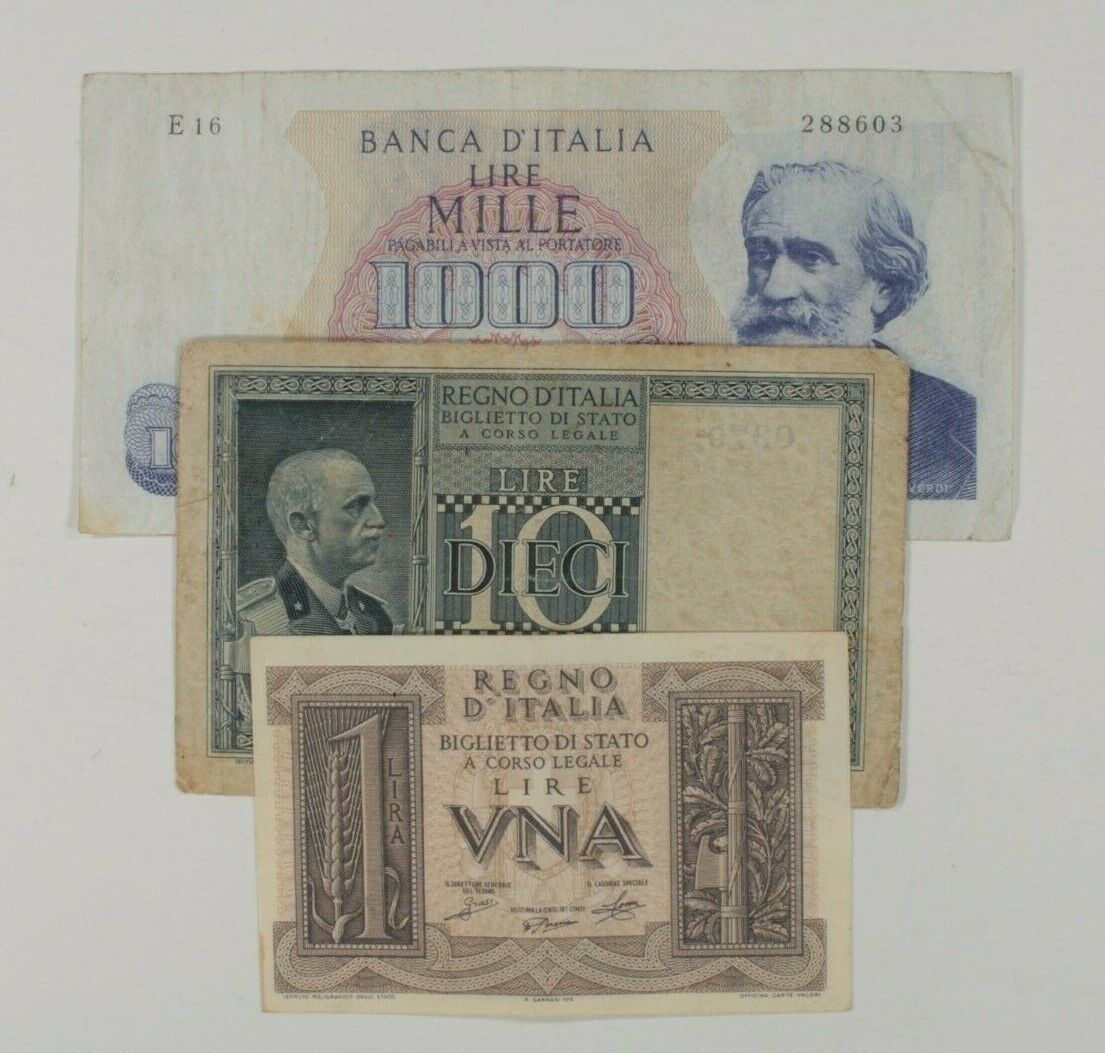 Italy 3-Notes Currency Set // Regno d'Italia 1 &10 // Banca d'Italia 1000 Lire
