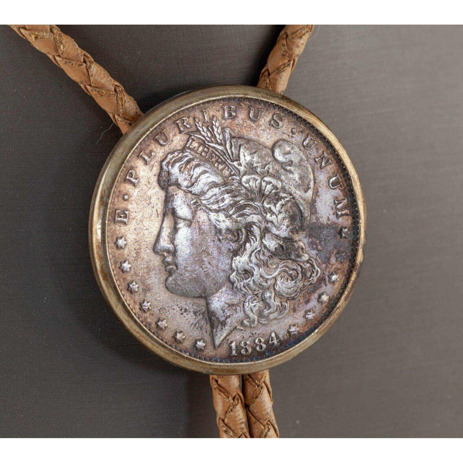 Morgan Dollar Bolo Tie with Braided Tan Leather and Aglets