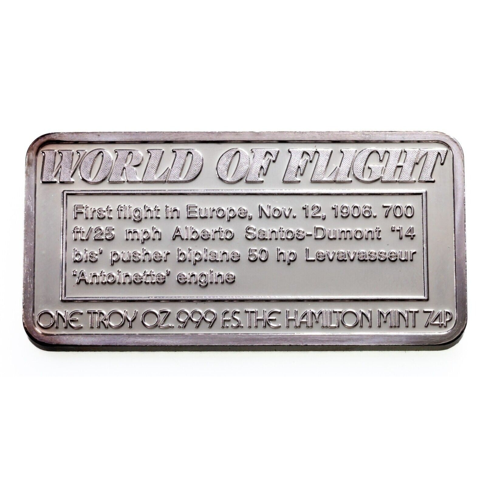 Santos Dumont "14 BIS" - World of Flight Hamilton Mint 1 oz. Silver Art Bar 1974