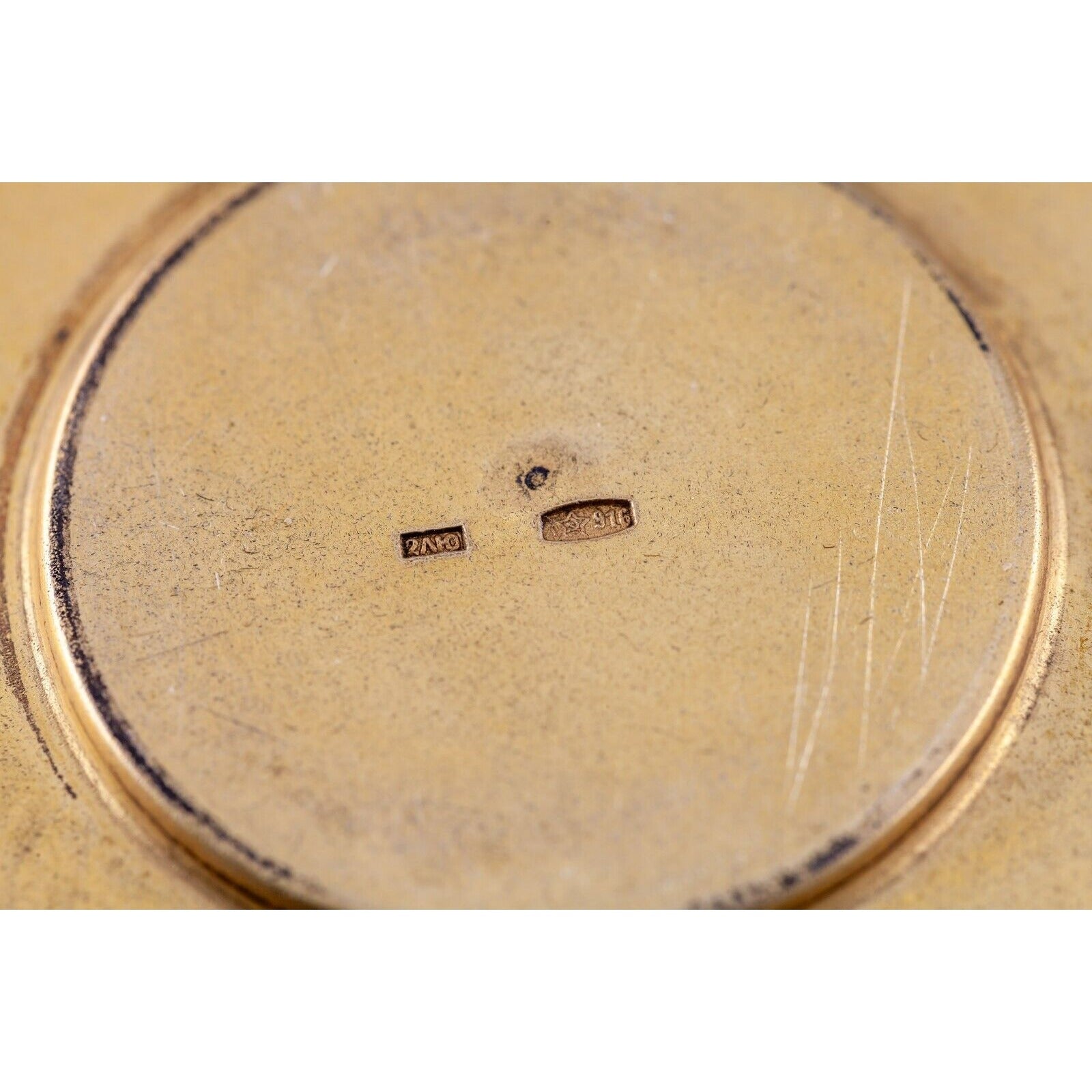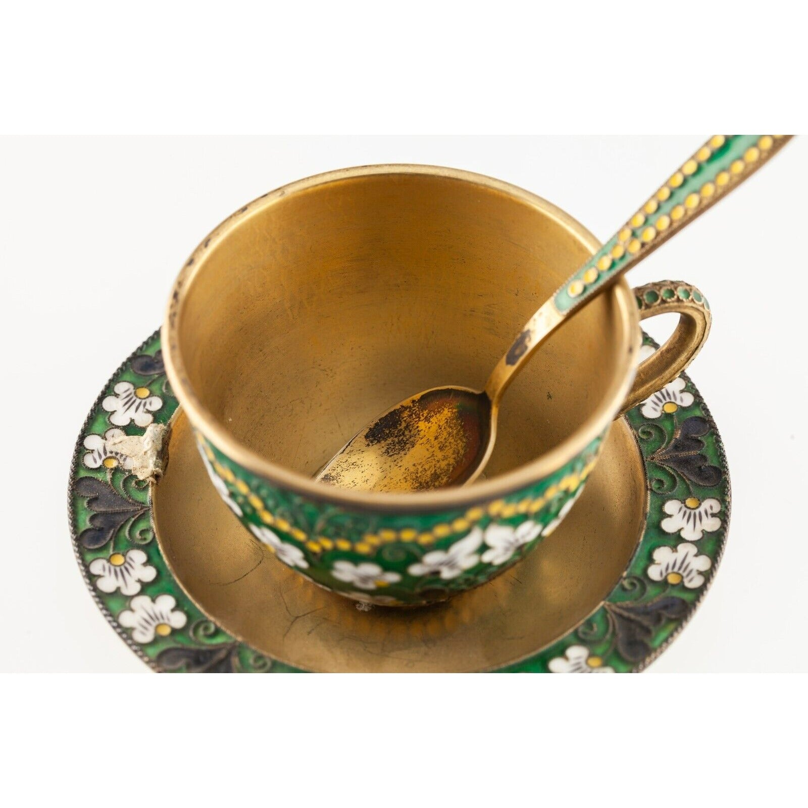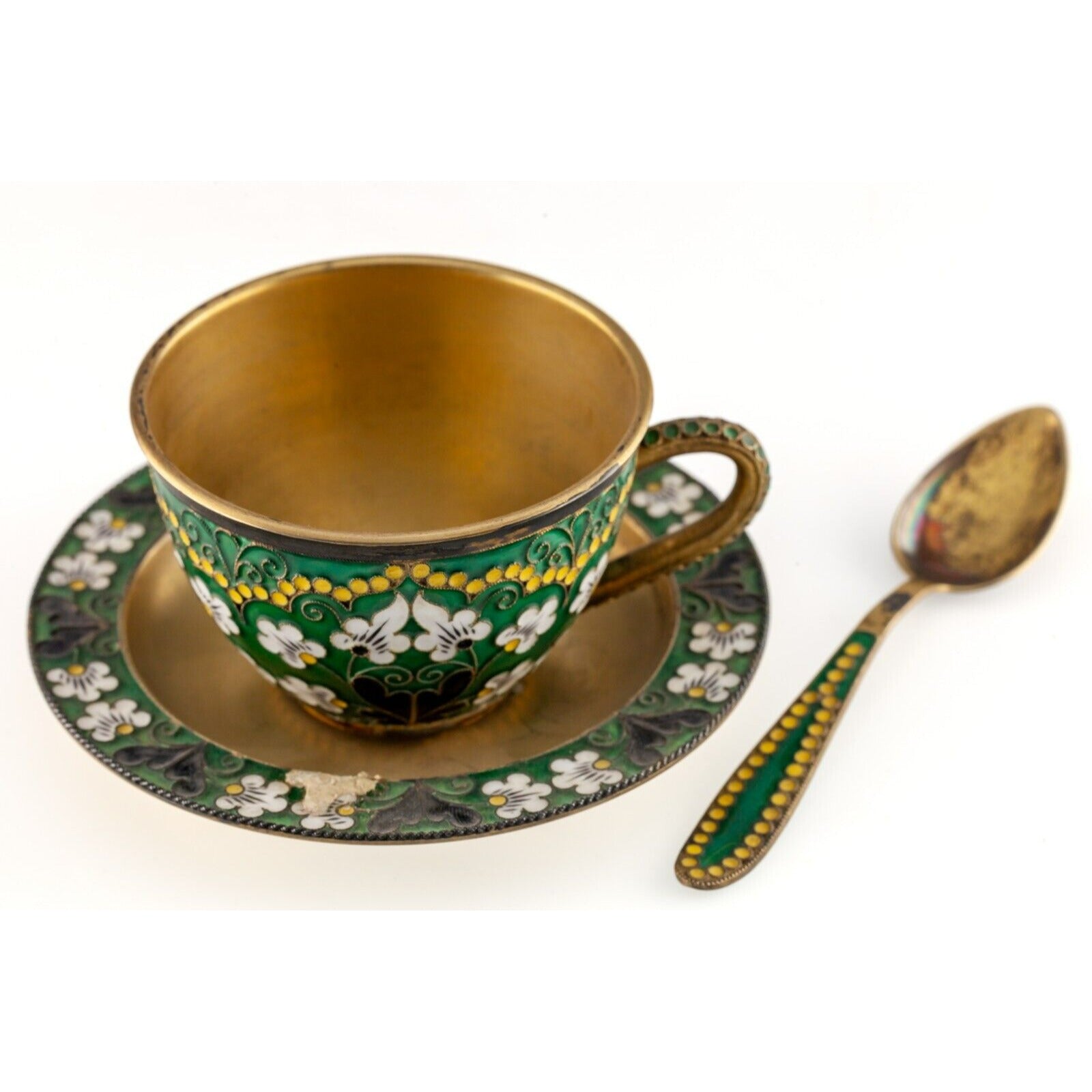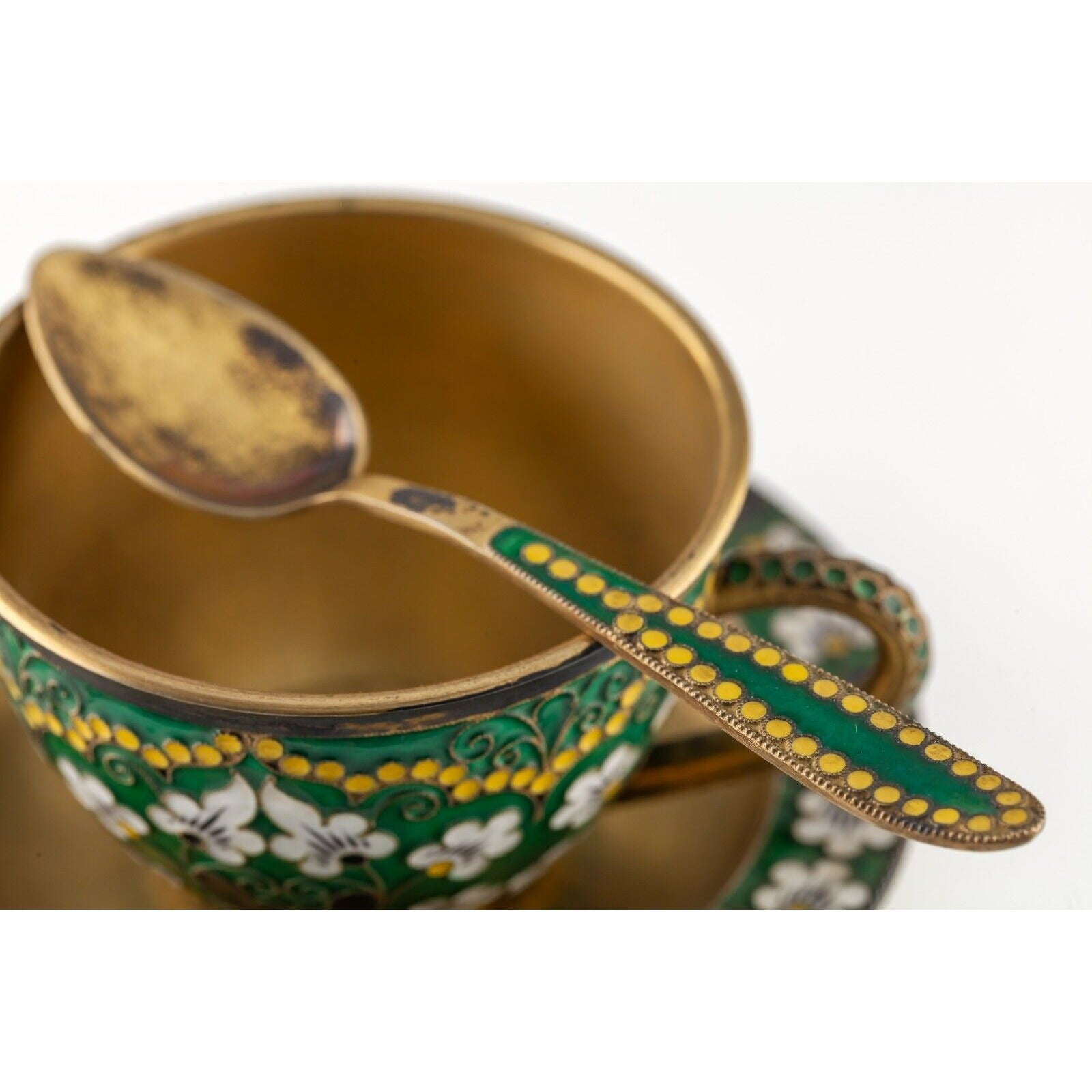 Soviet Russian Gilt 916 Silver Enamel Cloissone Tea Cup, Saucer, and Spoon 1950s