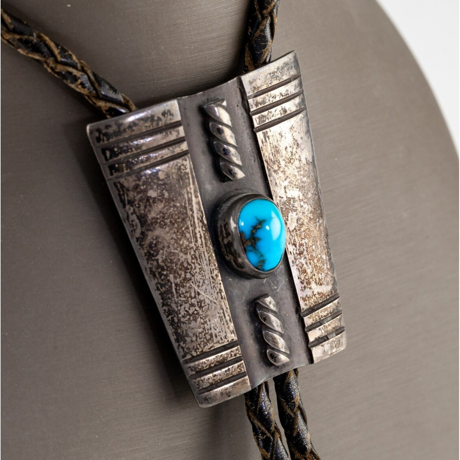 Sterling Silver Trapezoid Plaque Turquoise Bolo Tie with Braided Leather Strap