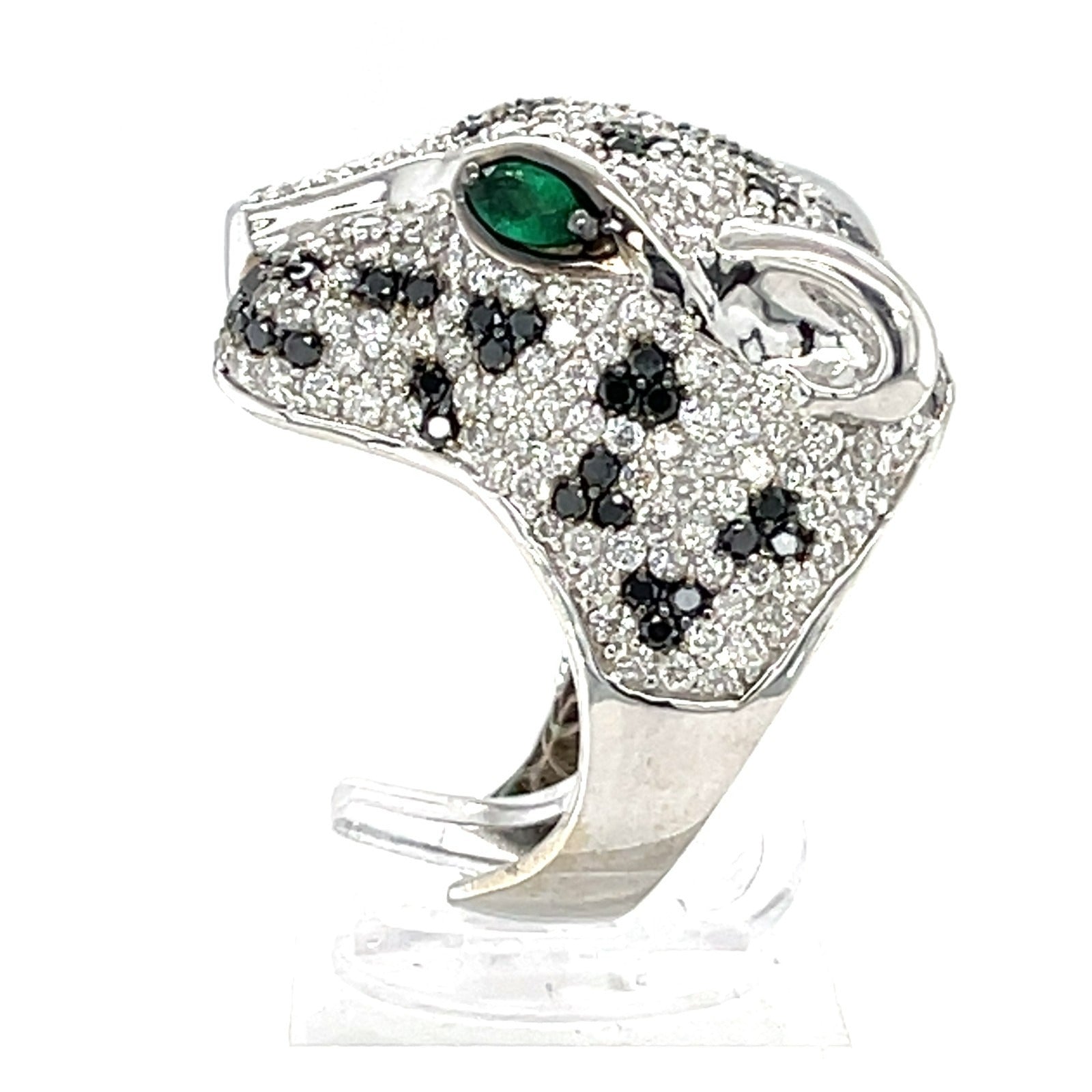 14K White Gold Panther Ring w/ 6.25ct Black & White Diamonds, Emerald Eyes, Size 7.25