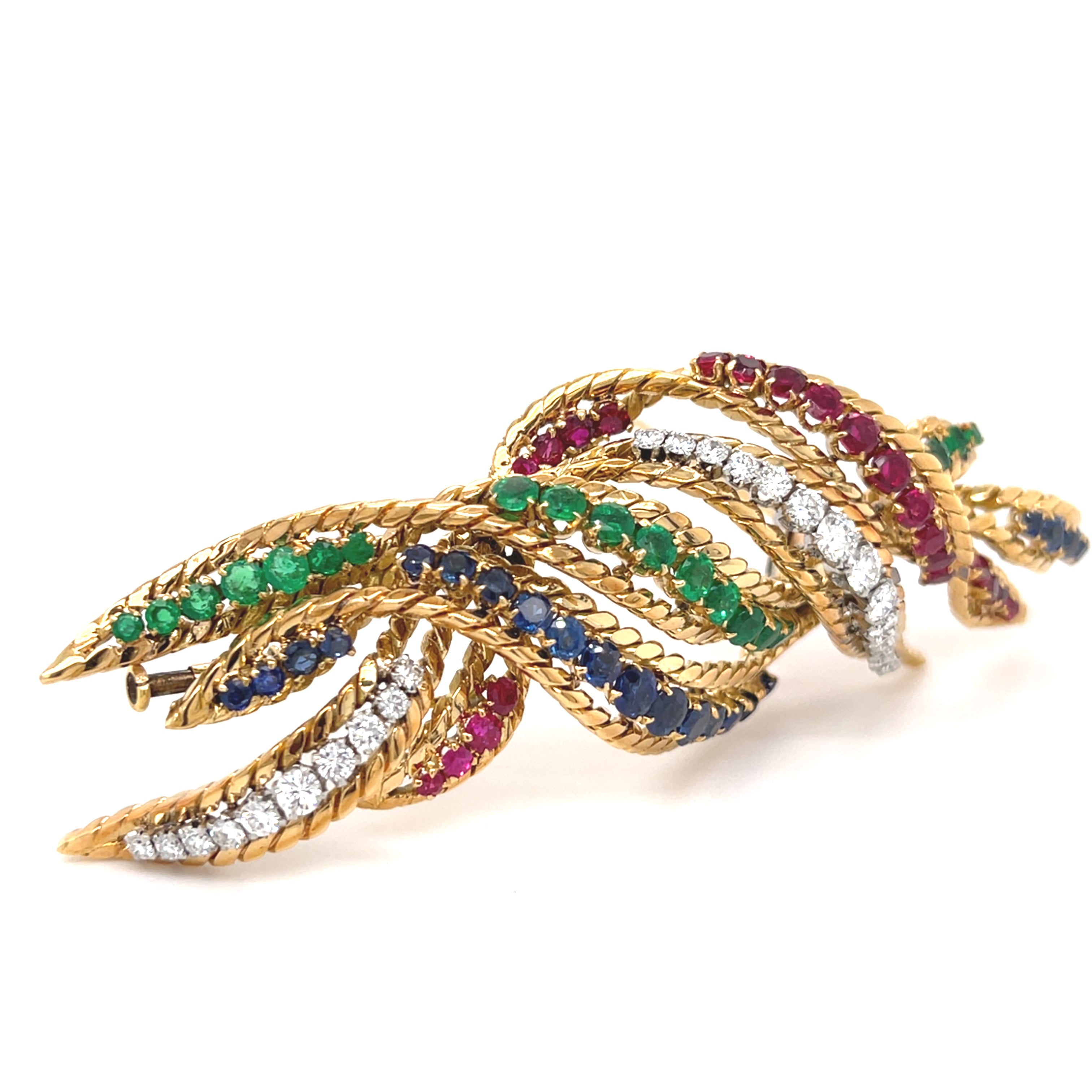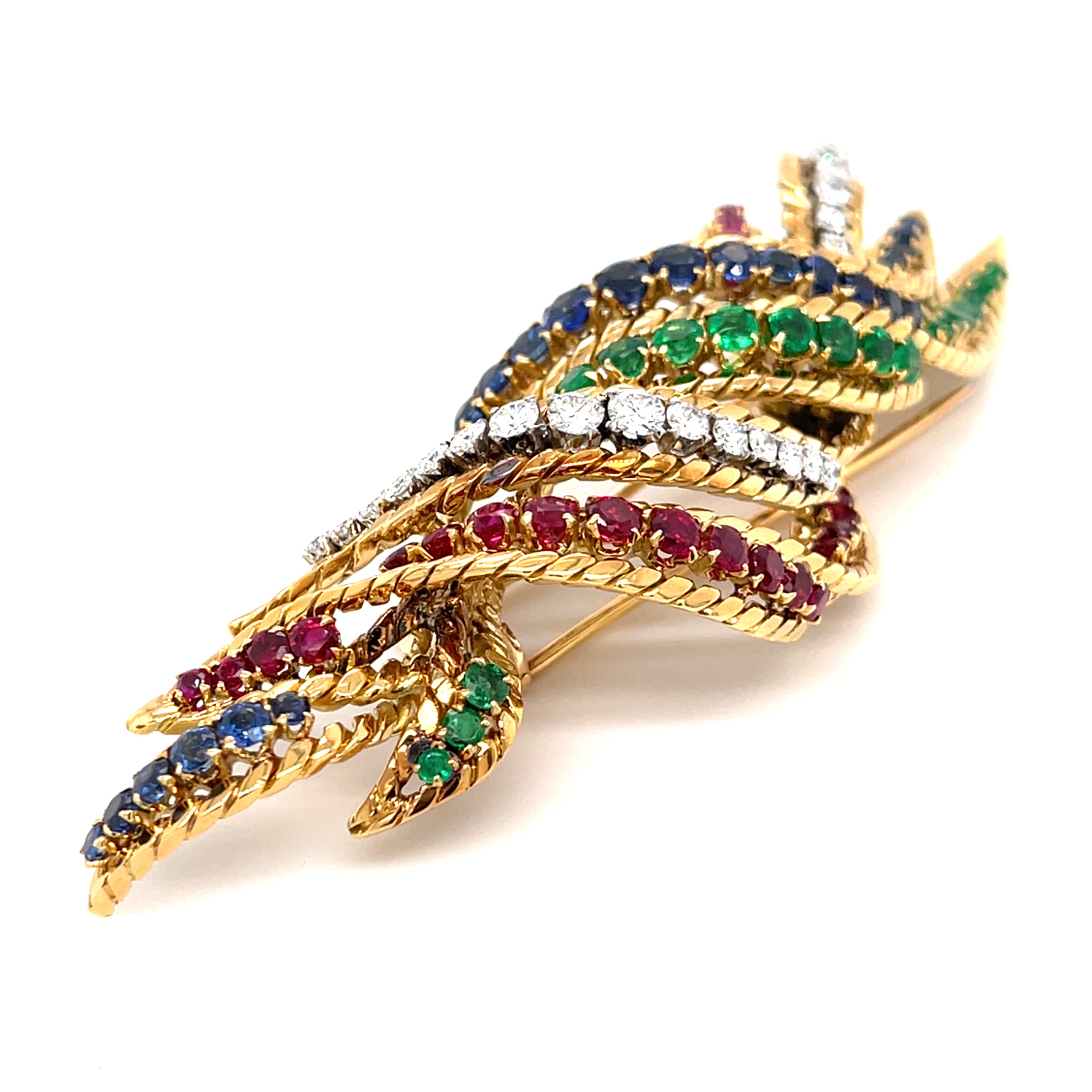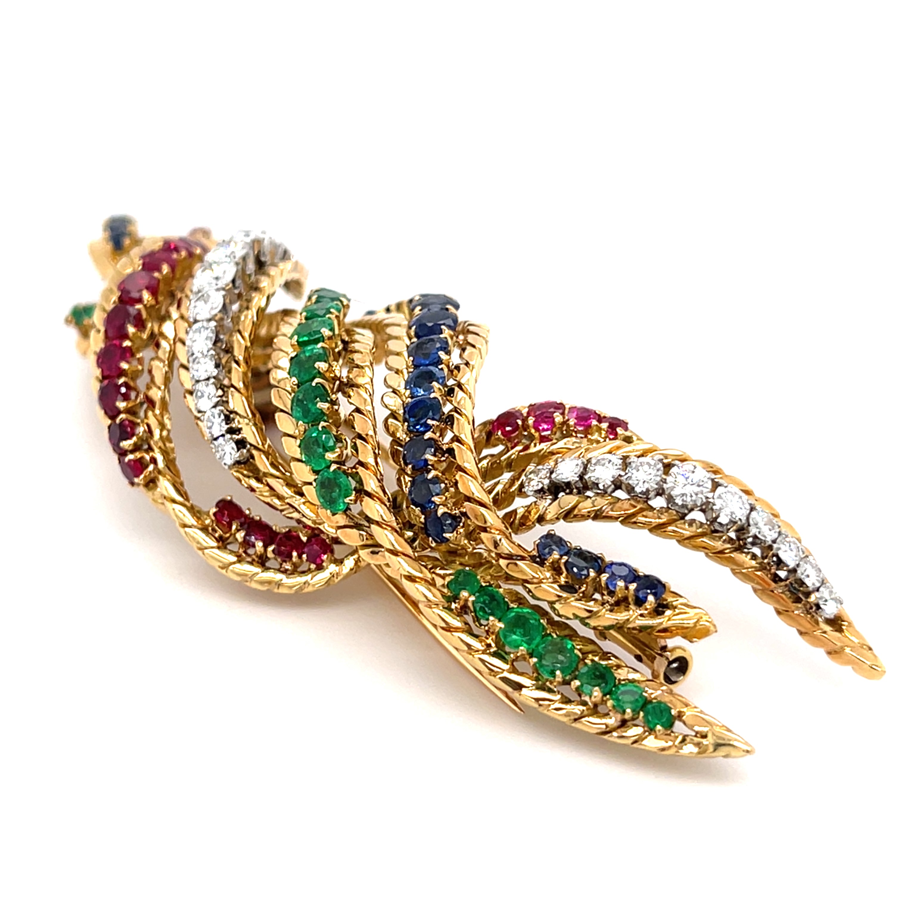 Mauboussin 18k Gold Abstract Twist Brooch w/ Diamond, Ruby, Sapphire, Emerald