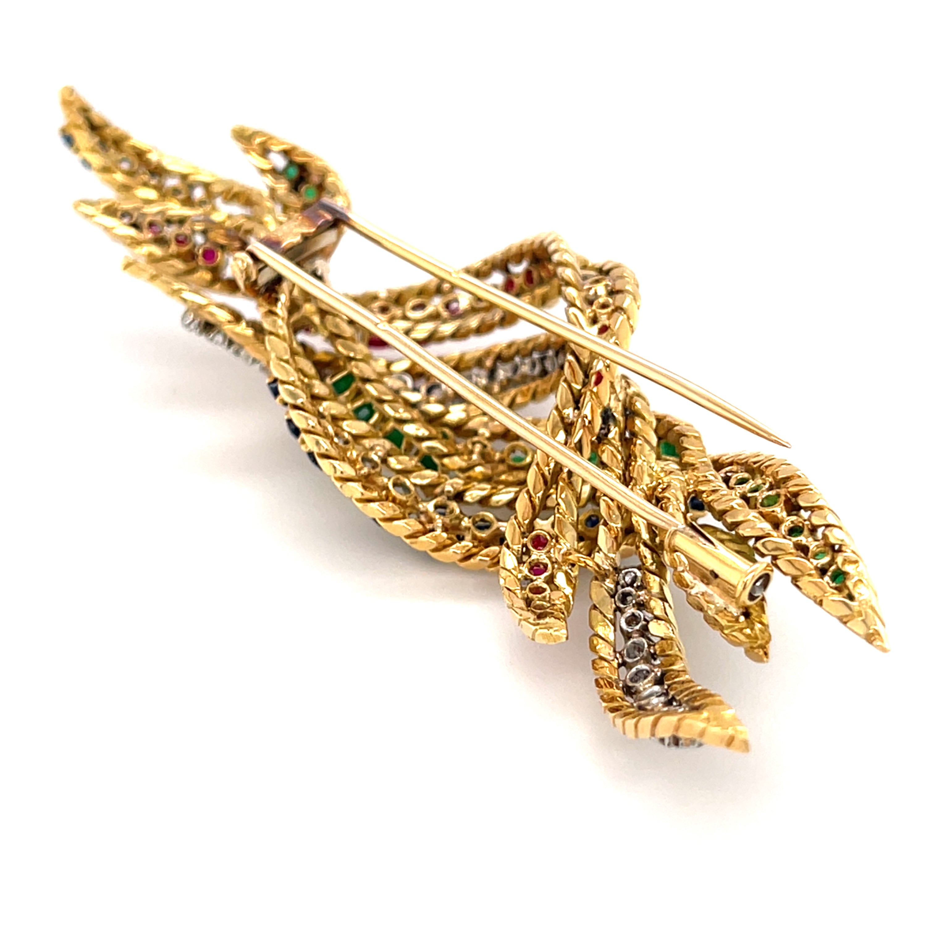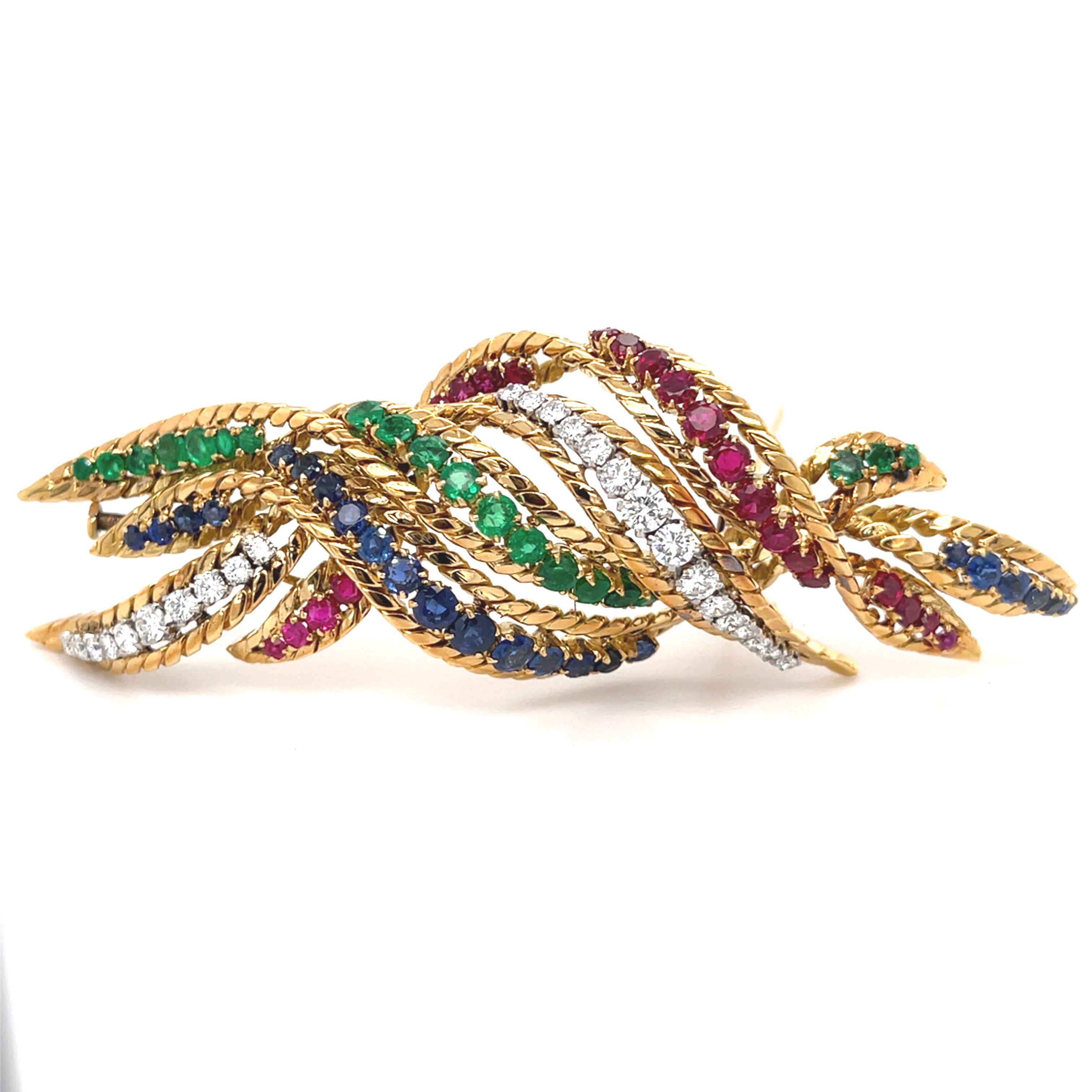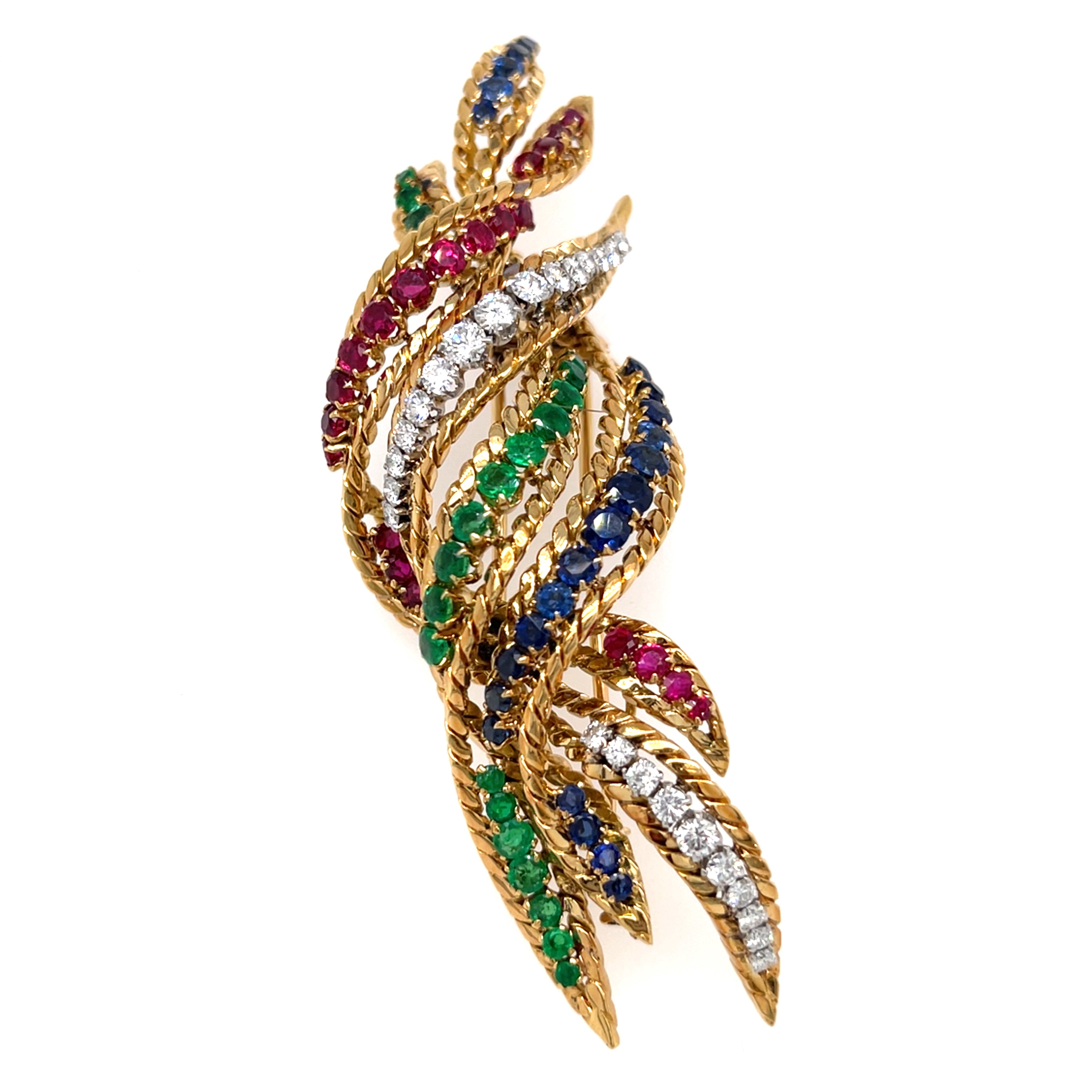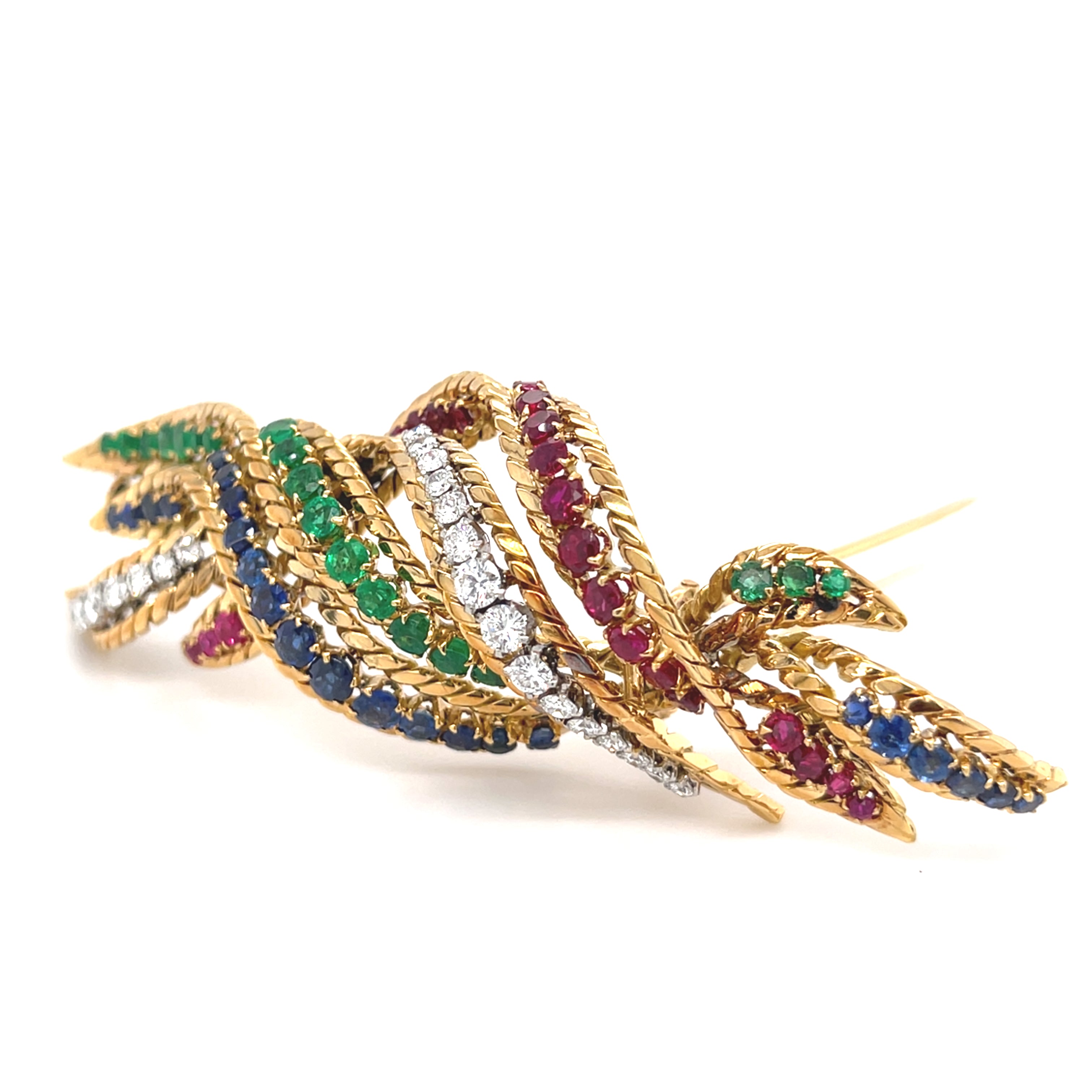 Mauboussin 18k Gold Abstract Twist Brooch w/ Diamond, Ruby, Sapphire, Emerald