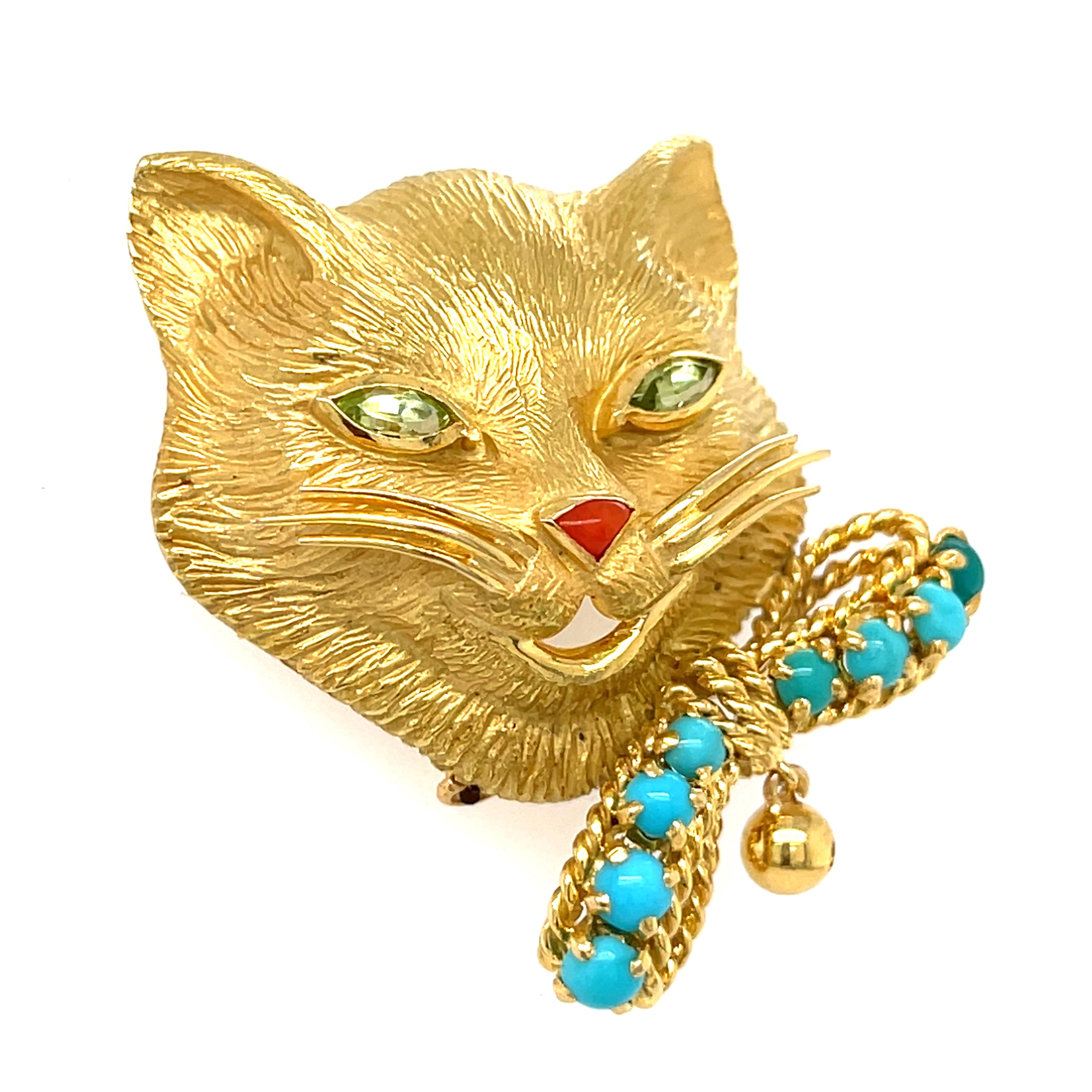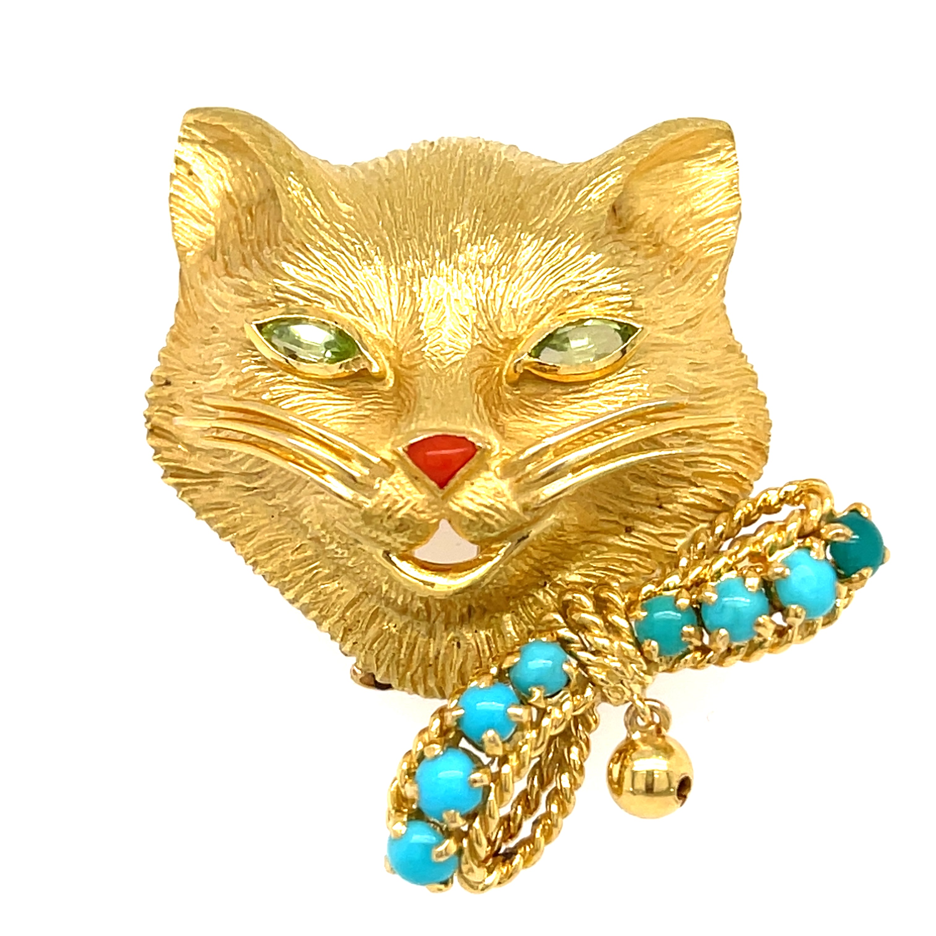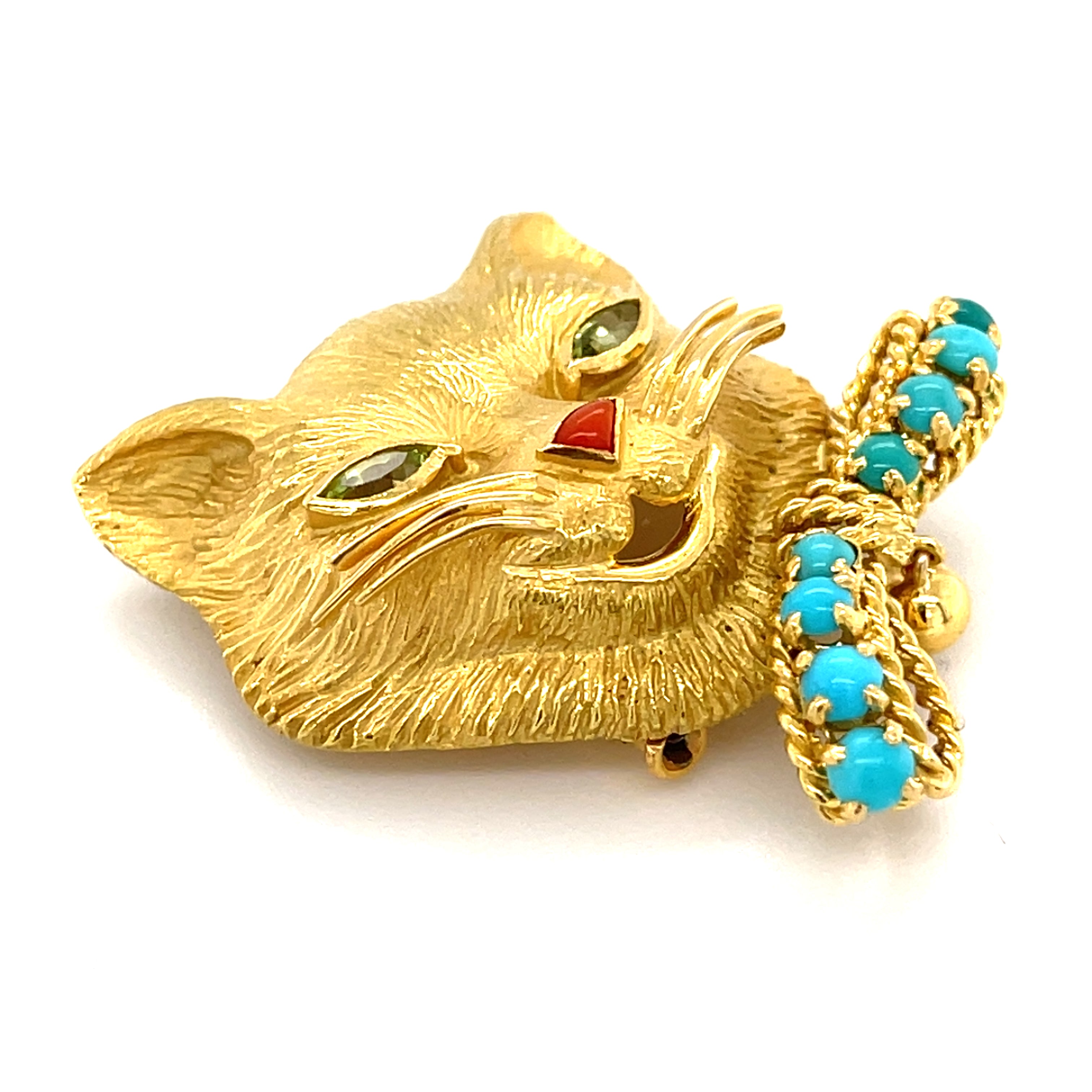 18k Gold & Turquoise Cat Brooch w/ Peridot, Coral
