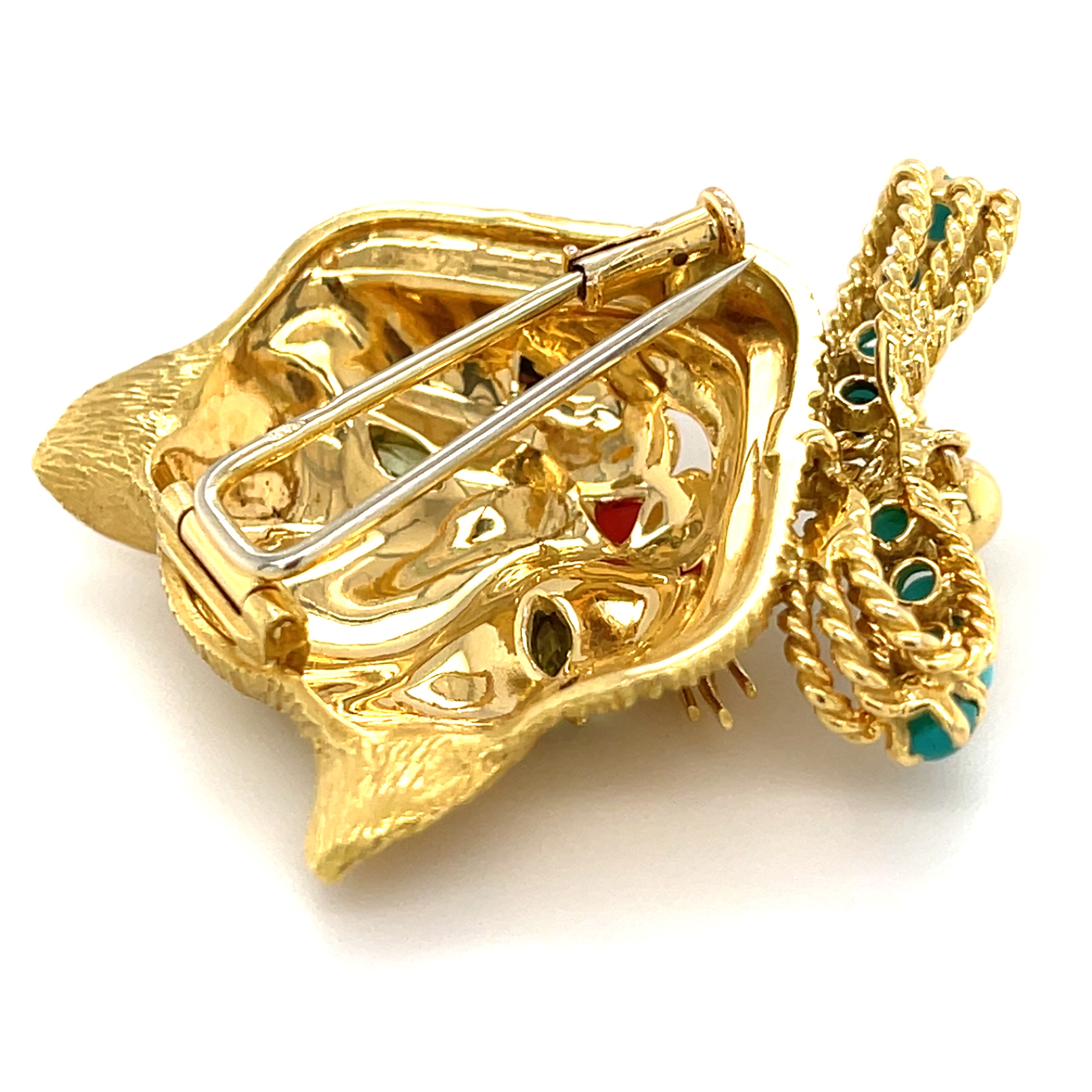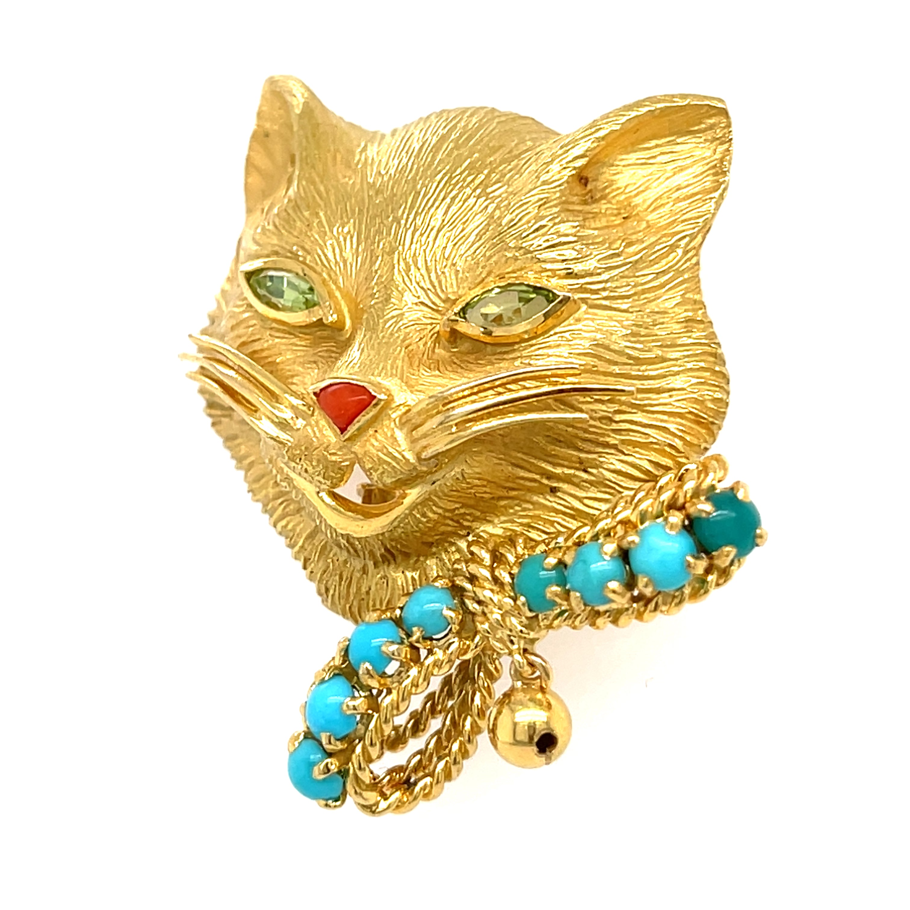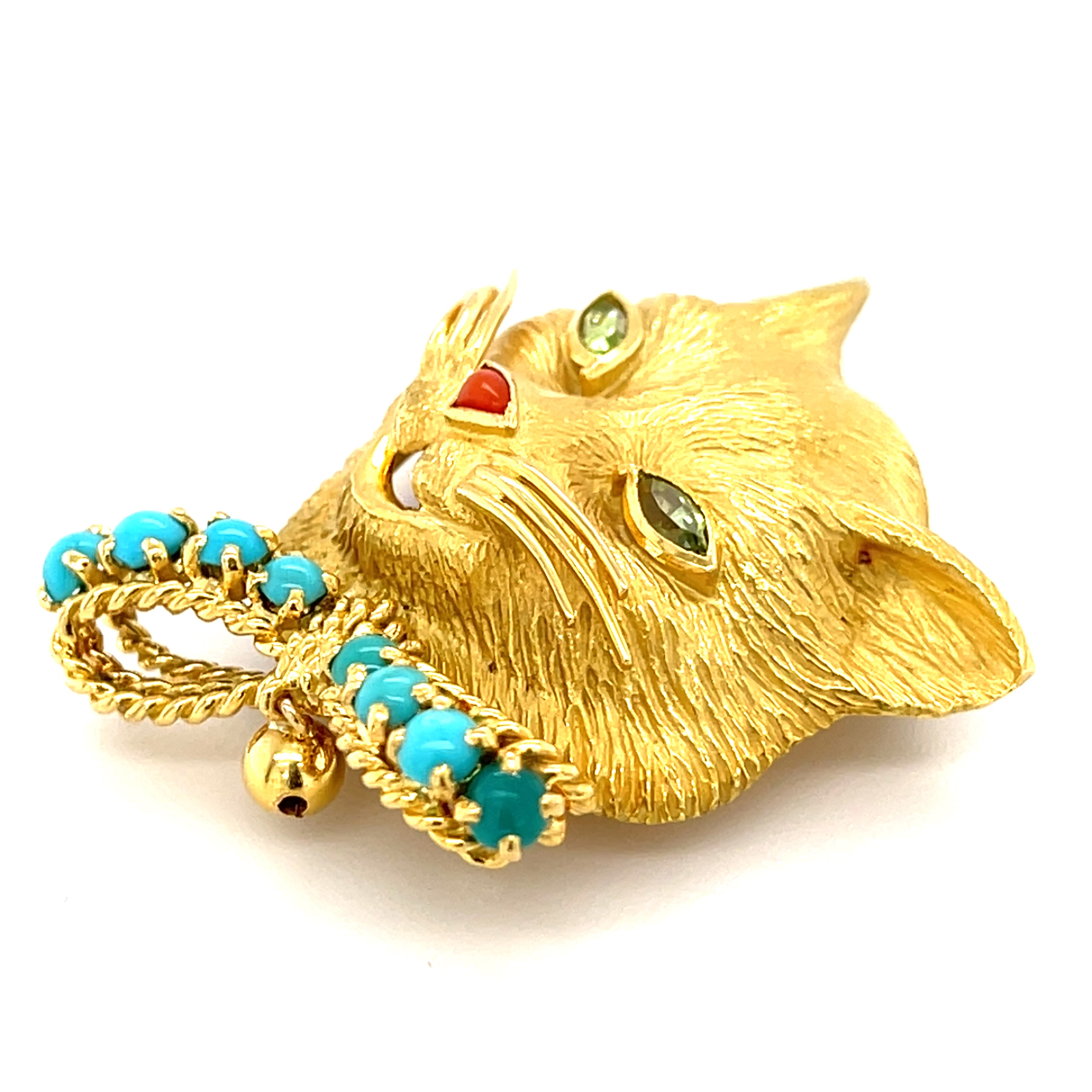 18k Gold & Turquoise Cat Brooch w/ Peridot, Coral
