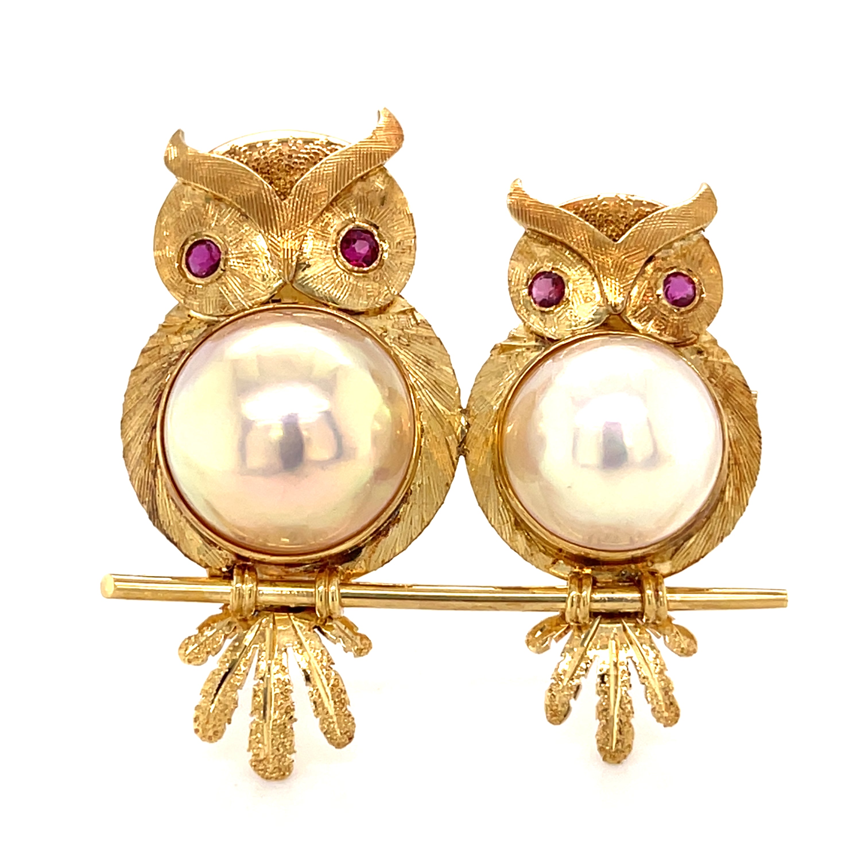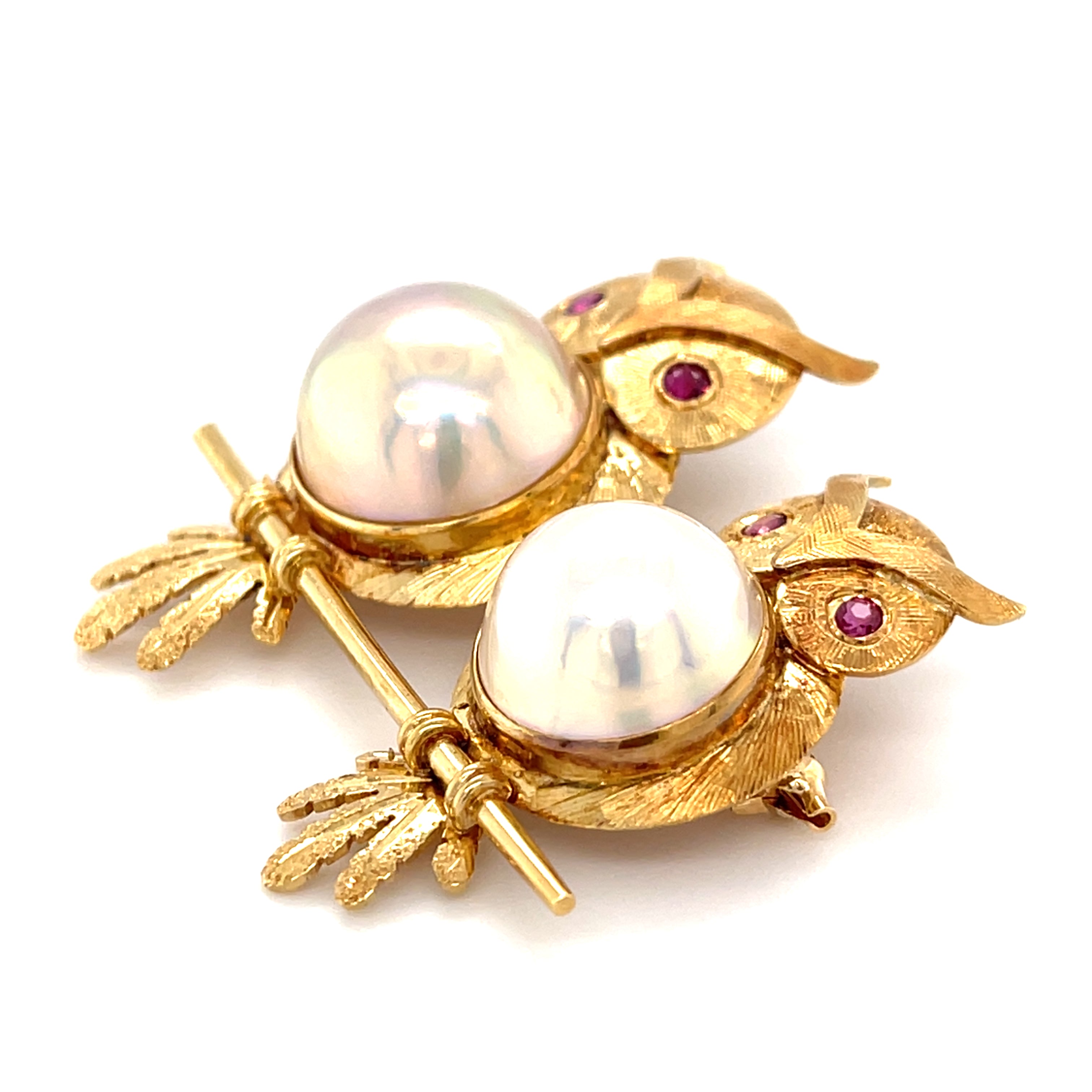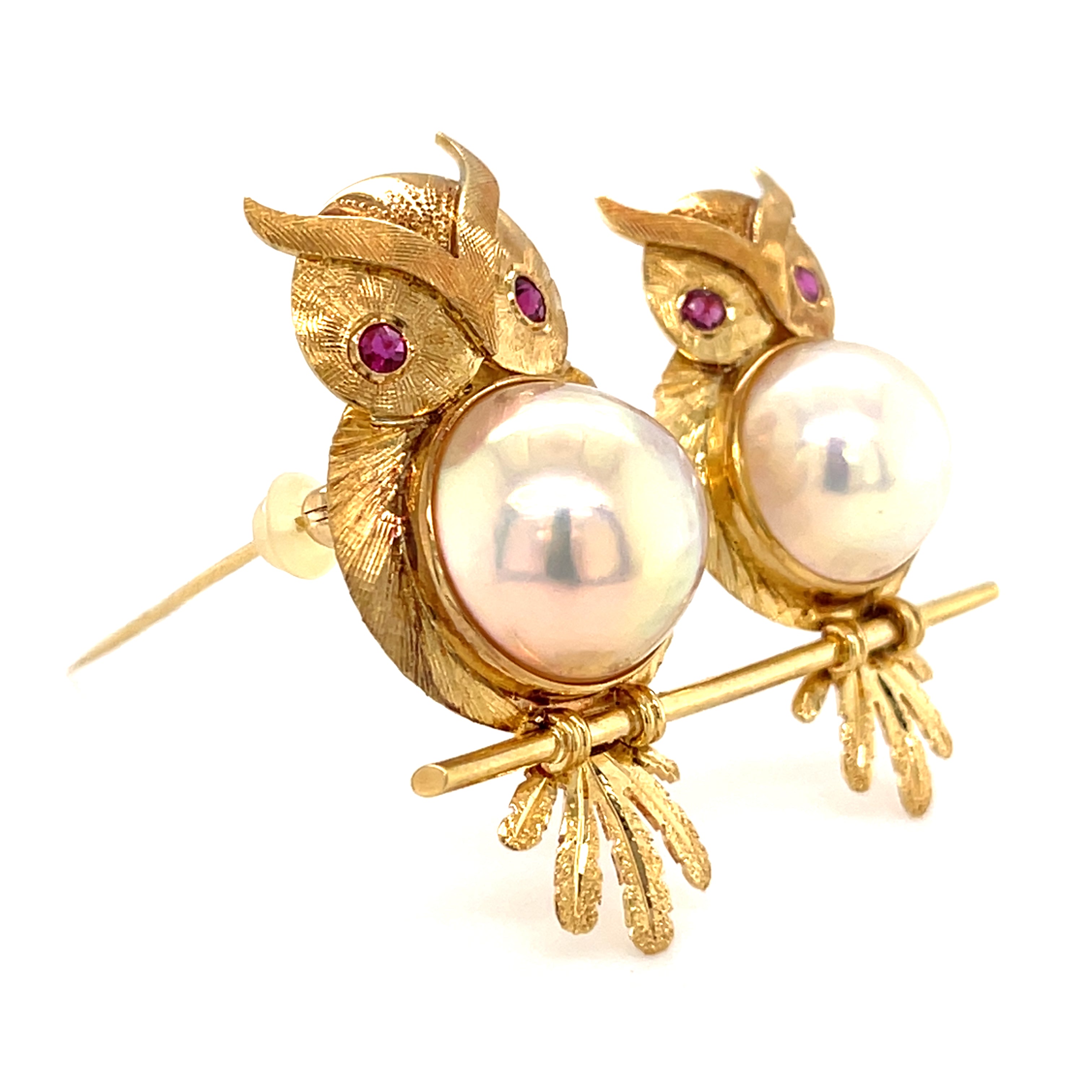 18k Gold & Mabe Pearl Owl Brooch w/ Ruby Eyes