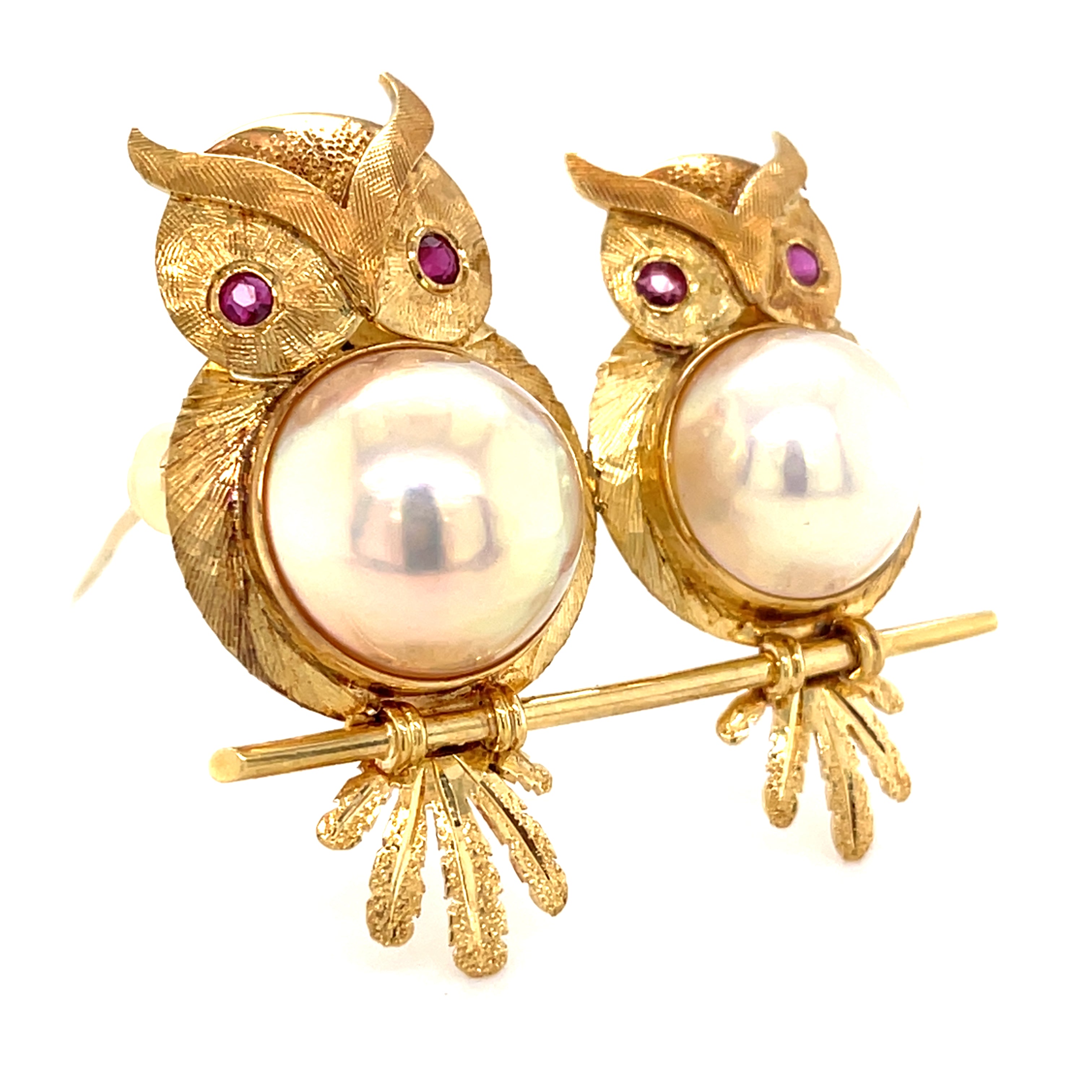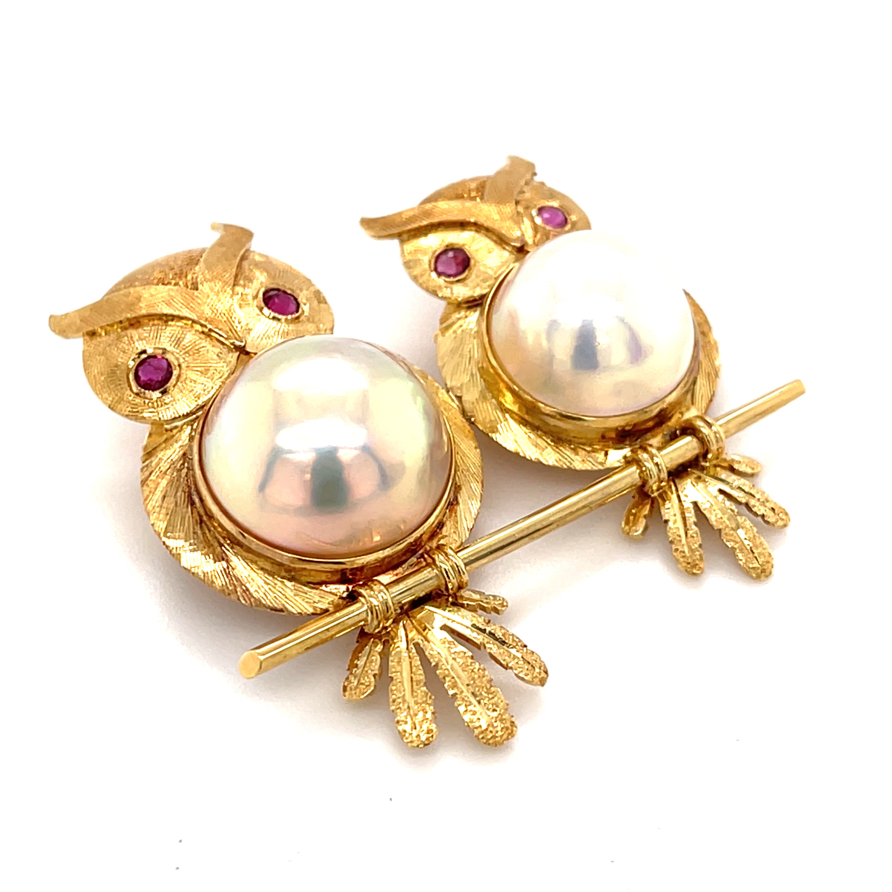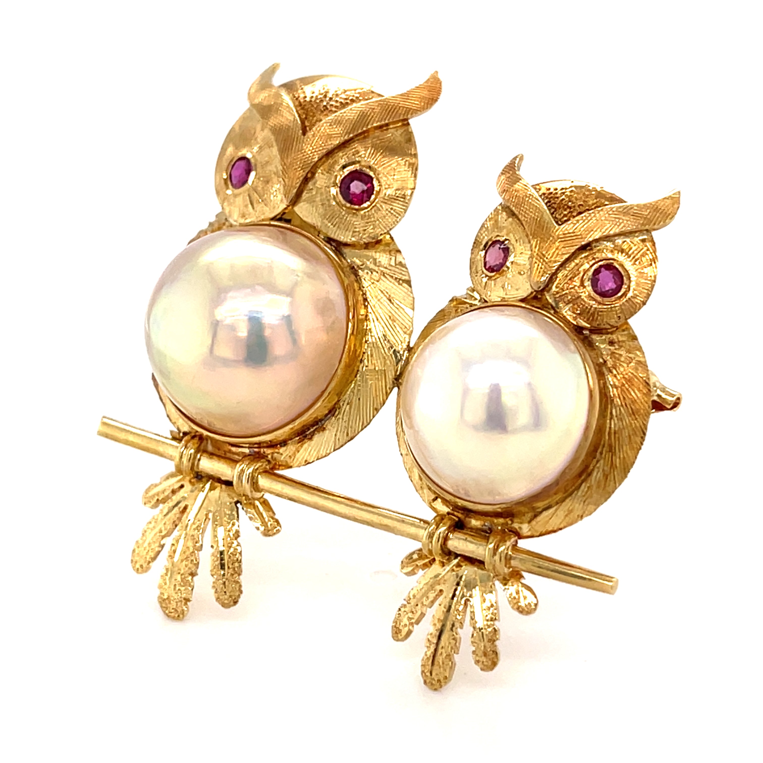 18k Gold & Mabe Pearl Owl Brooch w/ Ruby Eyes