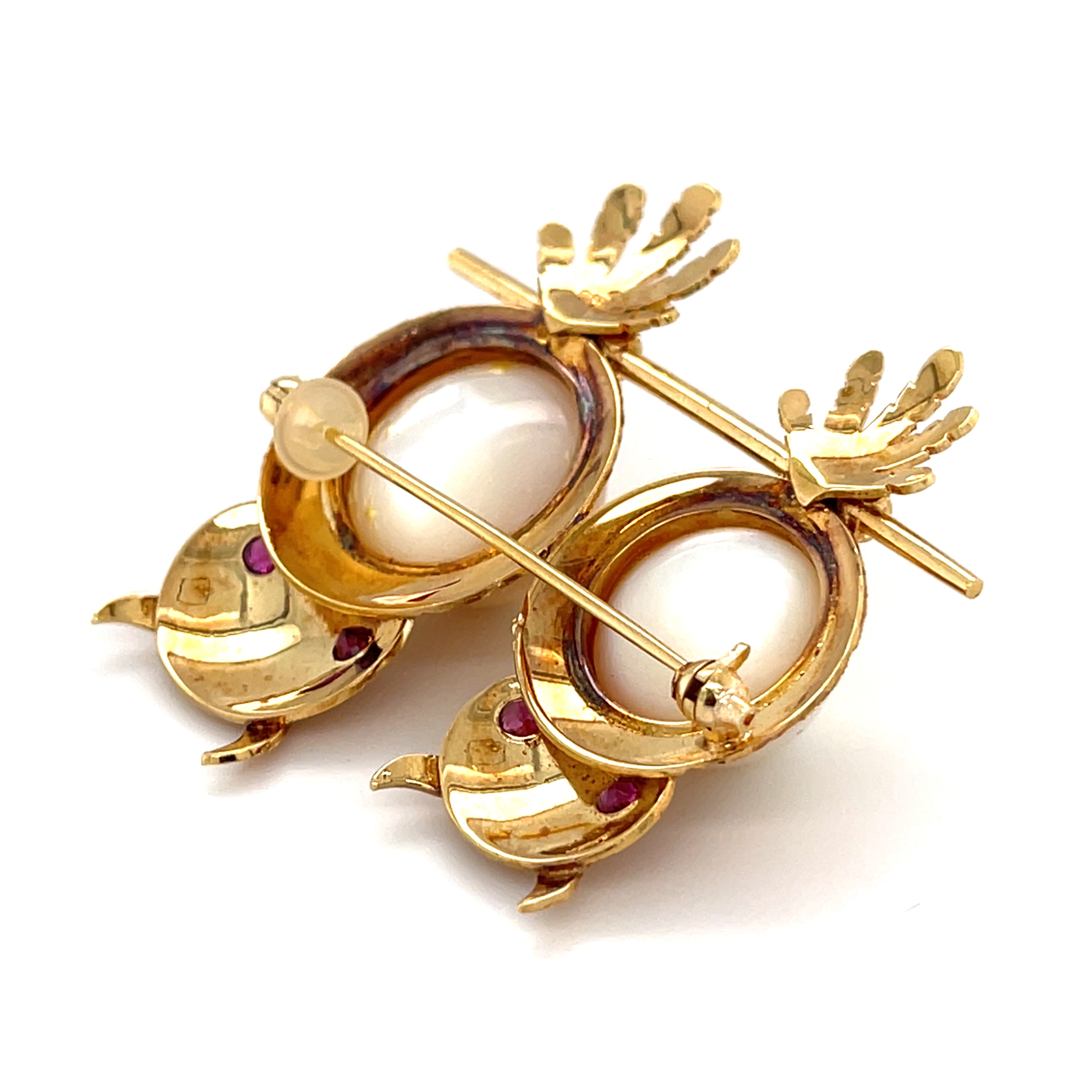 18k Yellow Gold Cultured Pearl Three Birds Sitting Brooch with Rubies