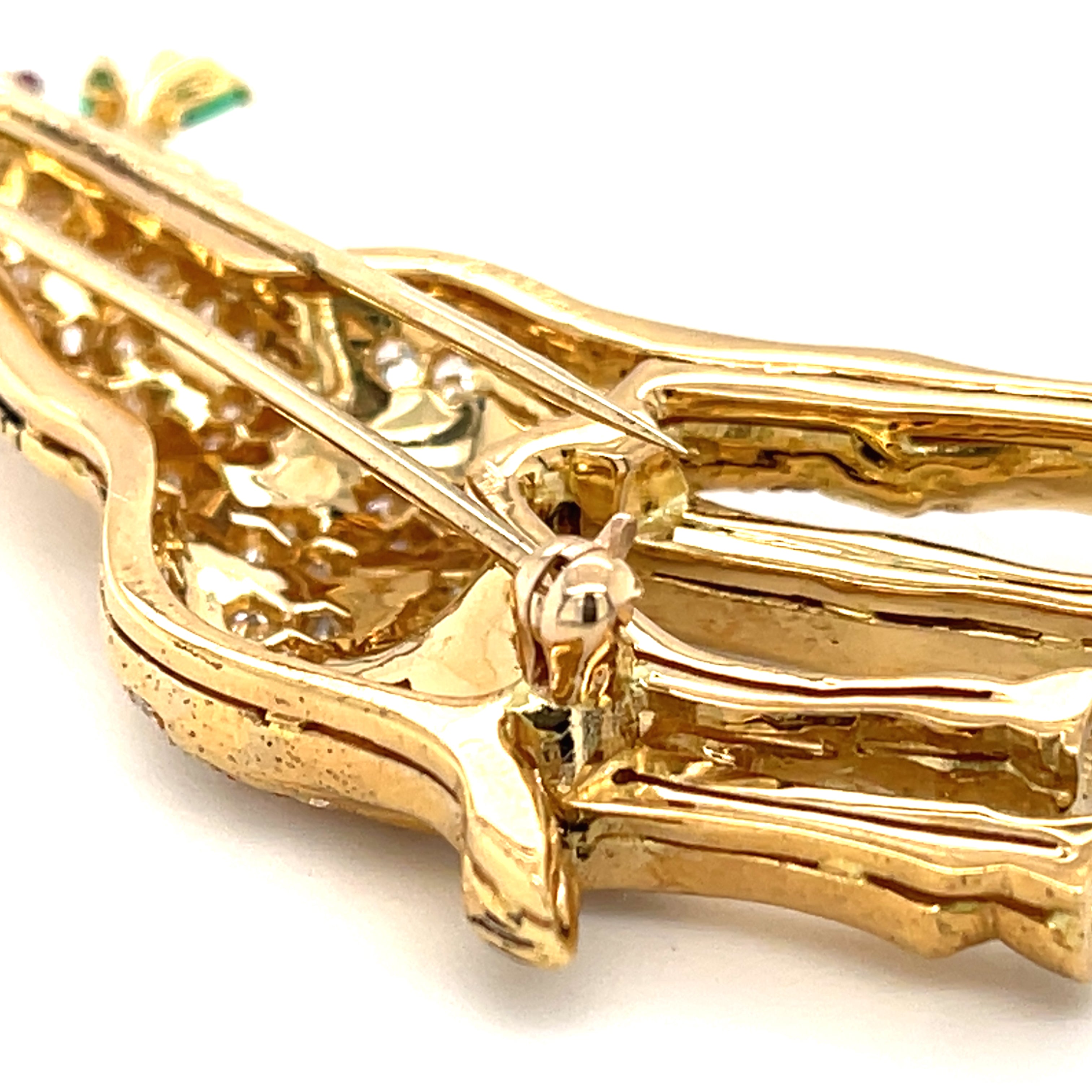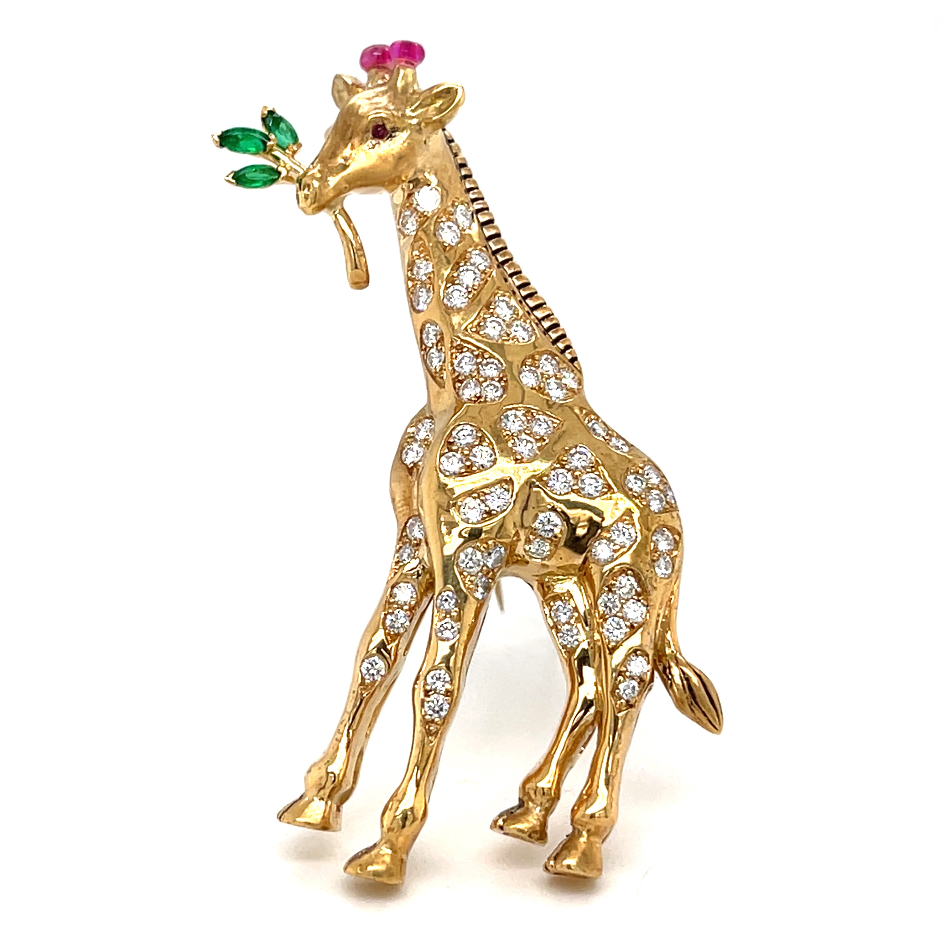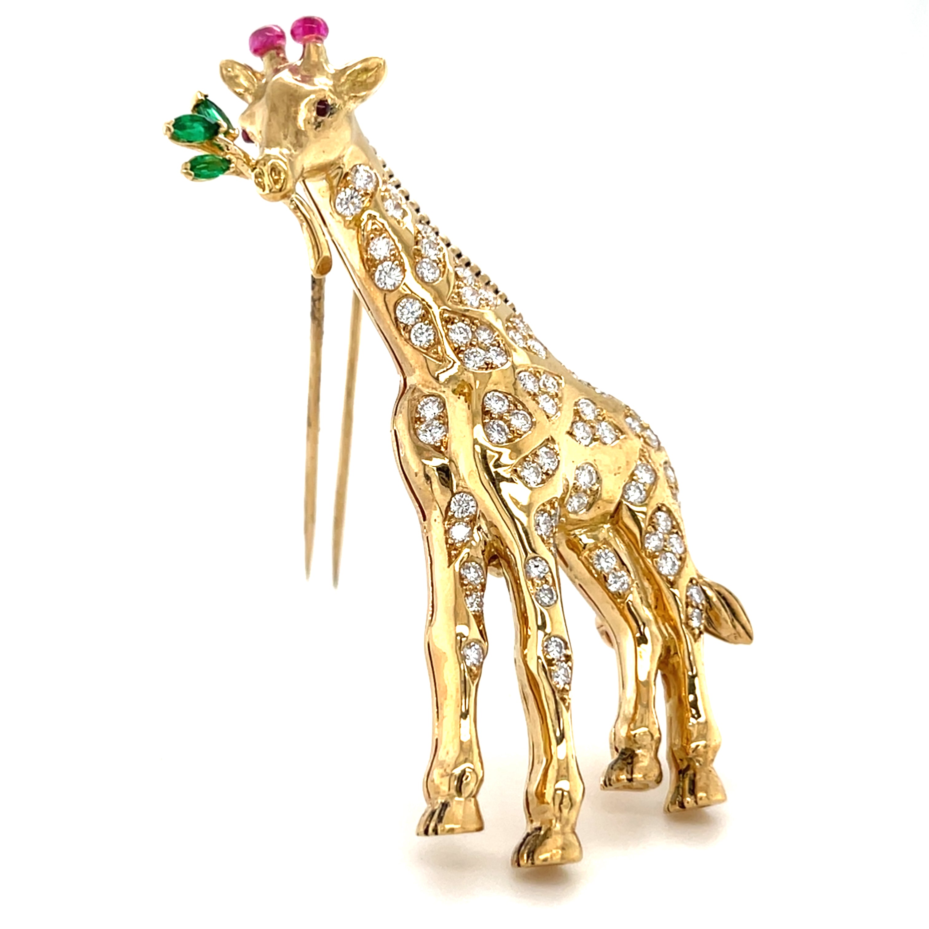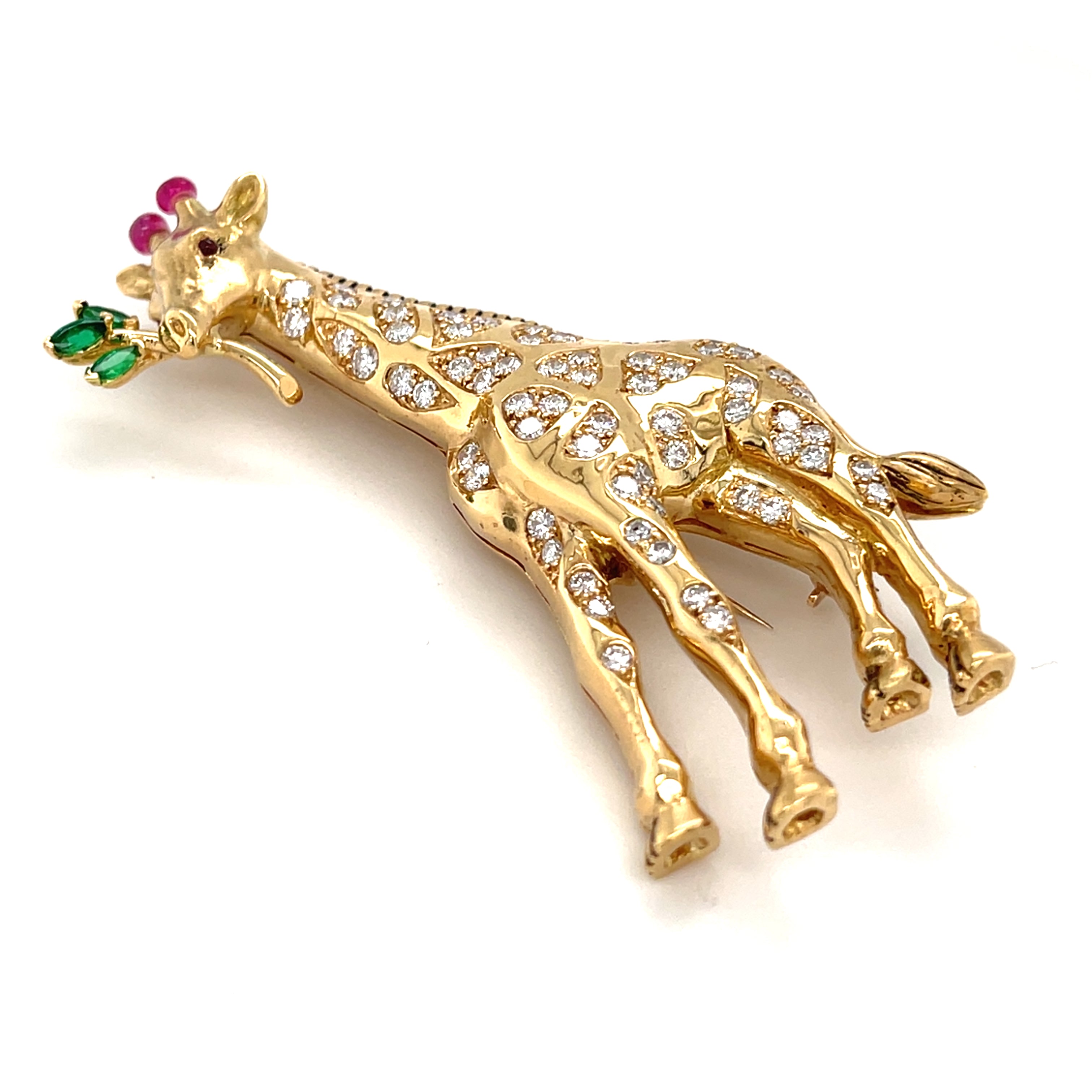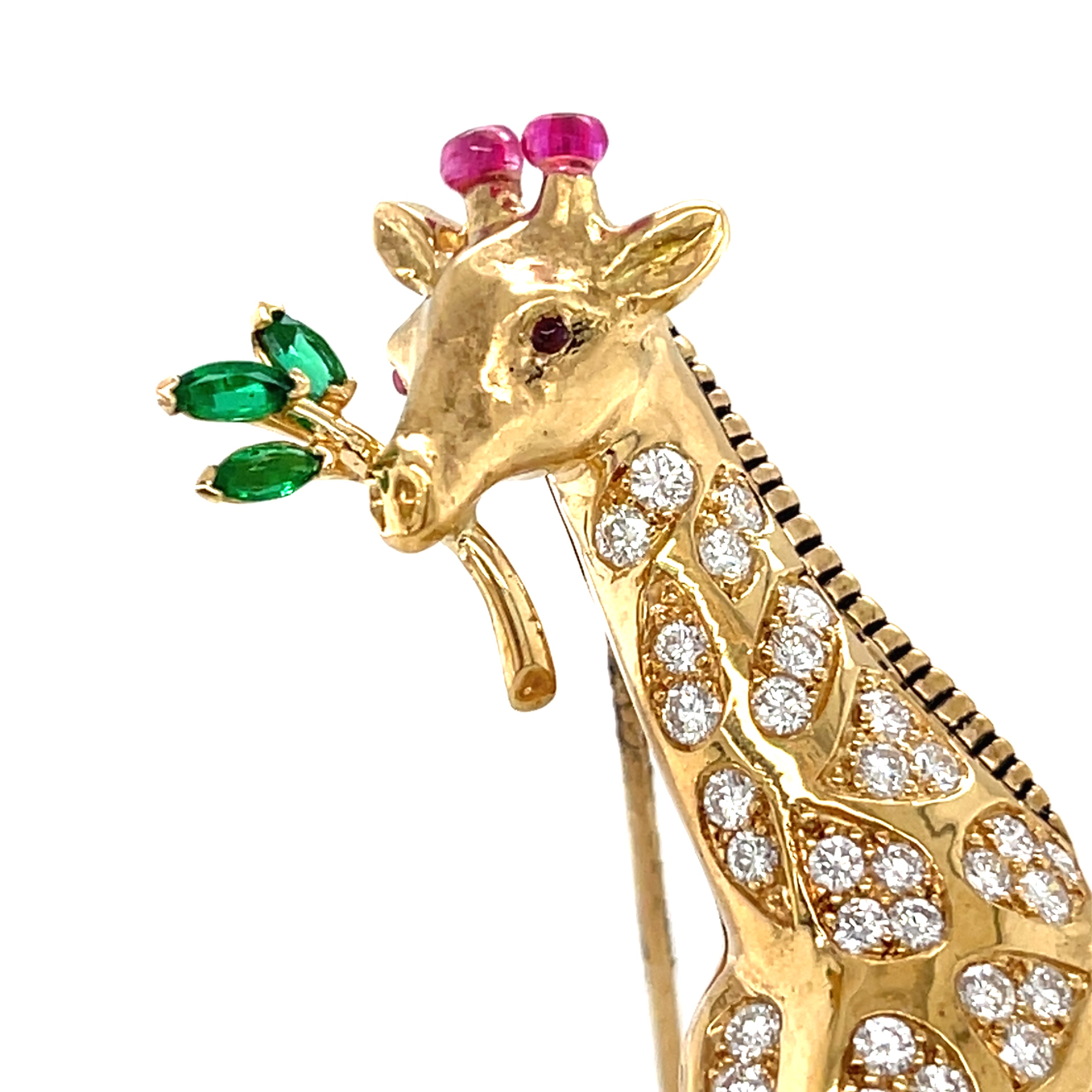 Oscar Heyman 18k Gold Giraffe Brooch w/ Ruby, 2ct Diamond, 0.15ct Emerald (74288)