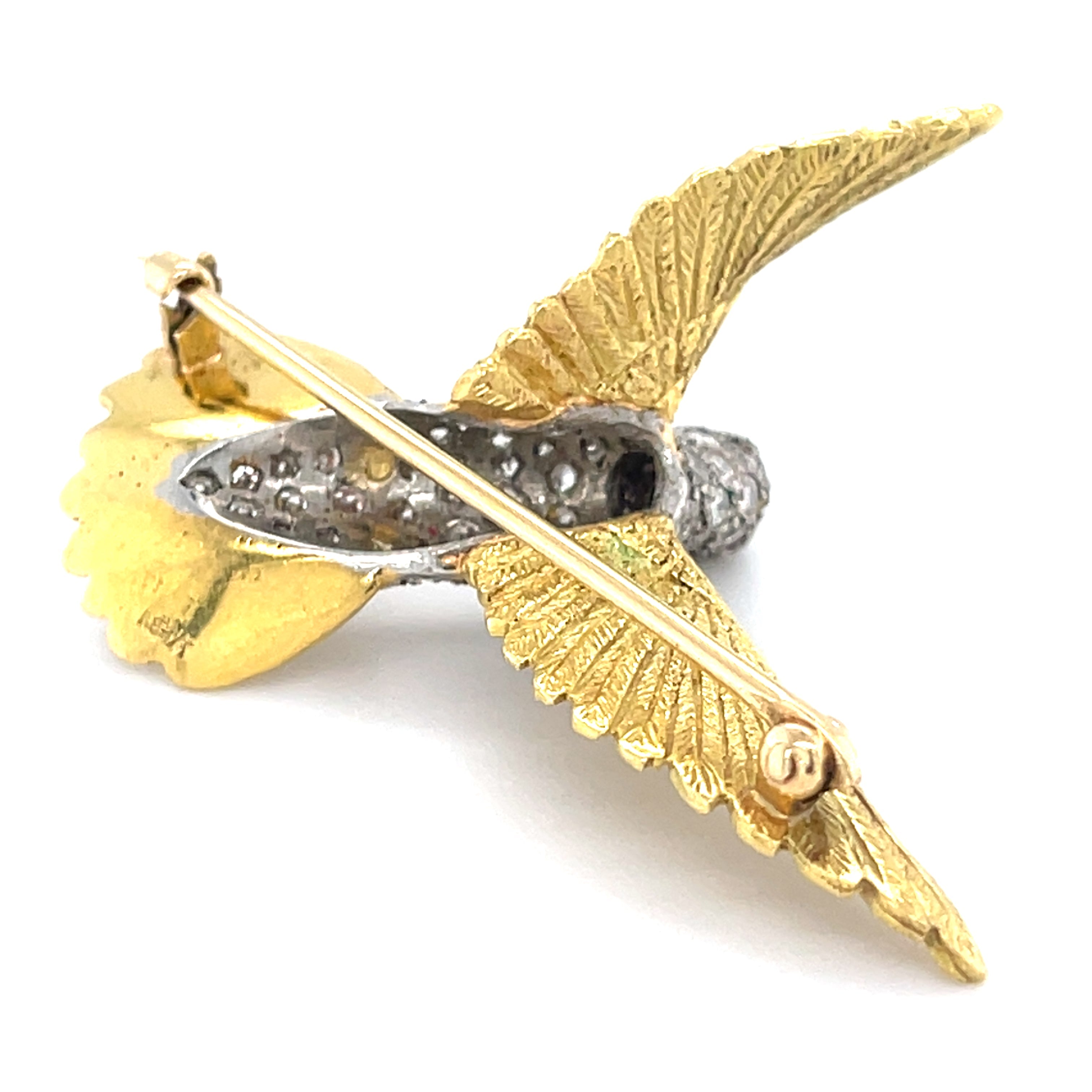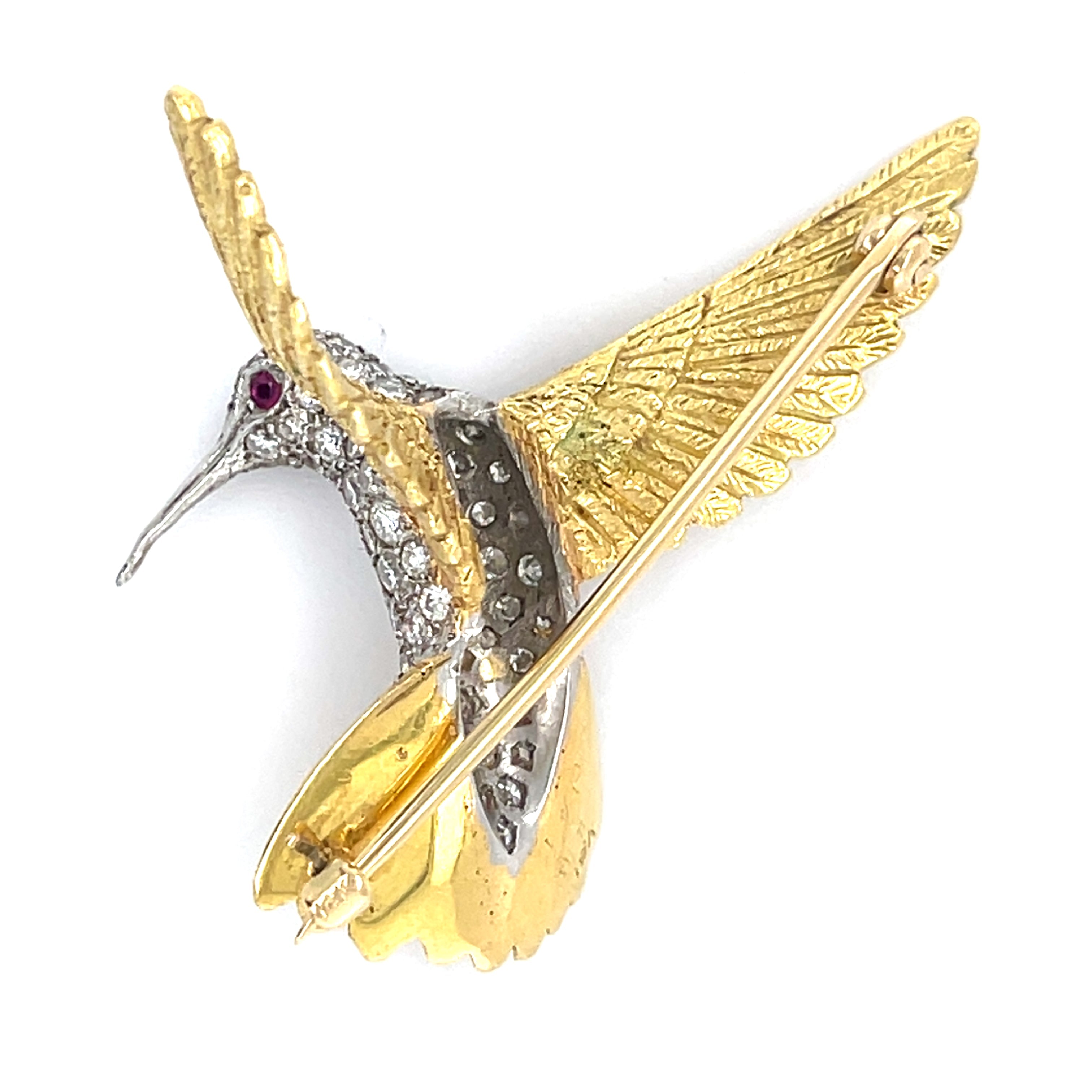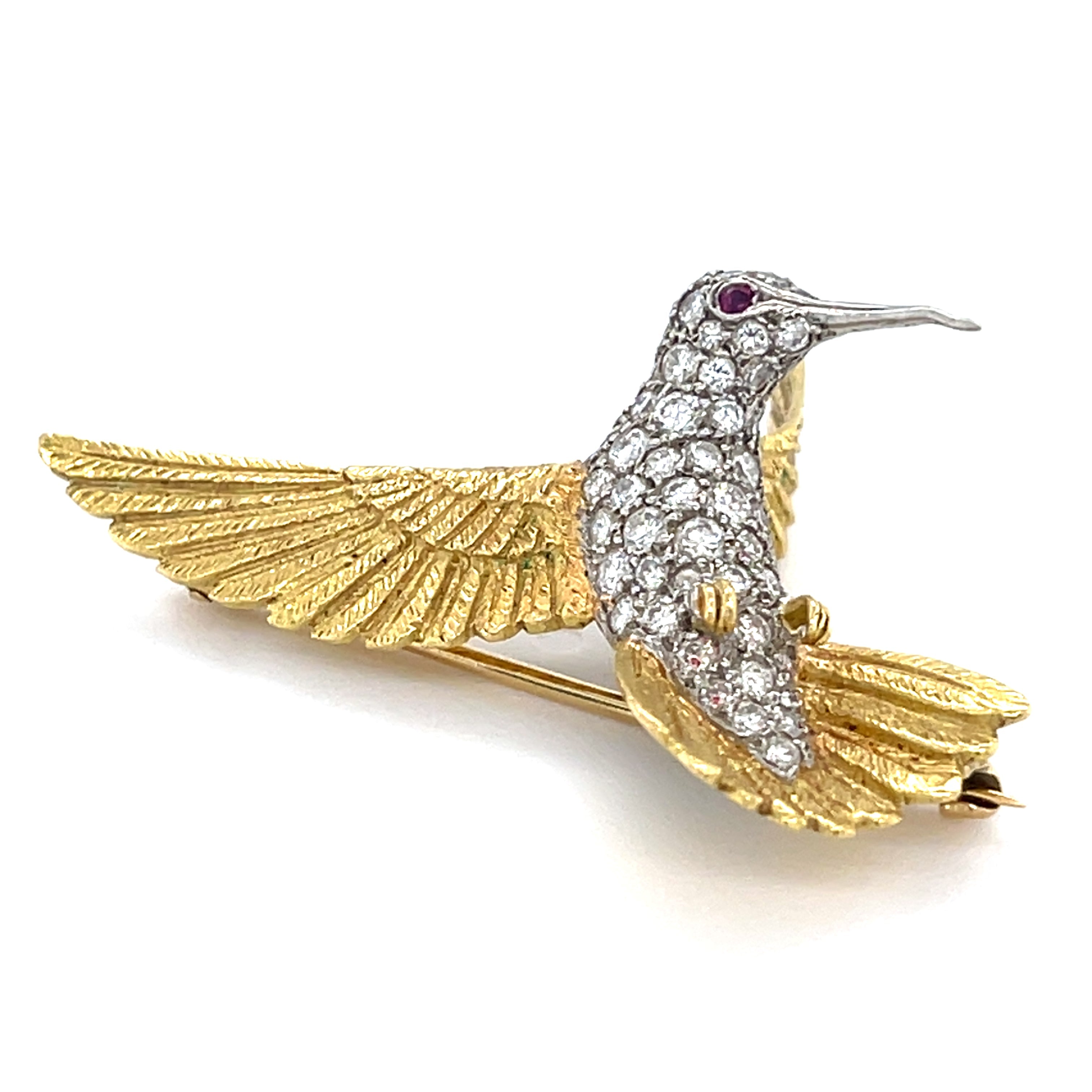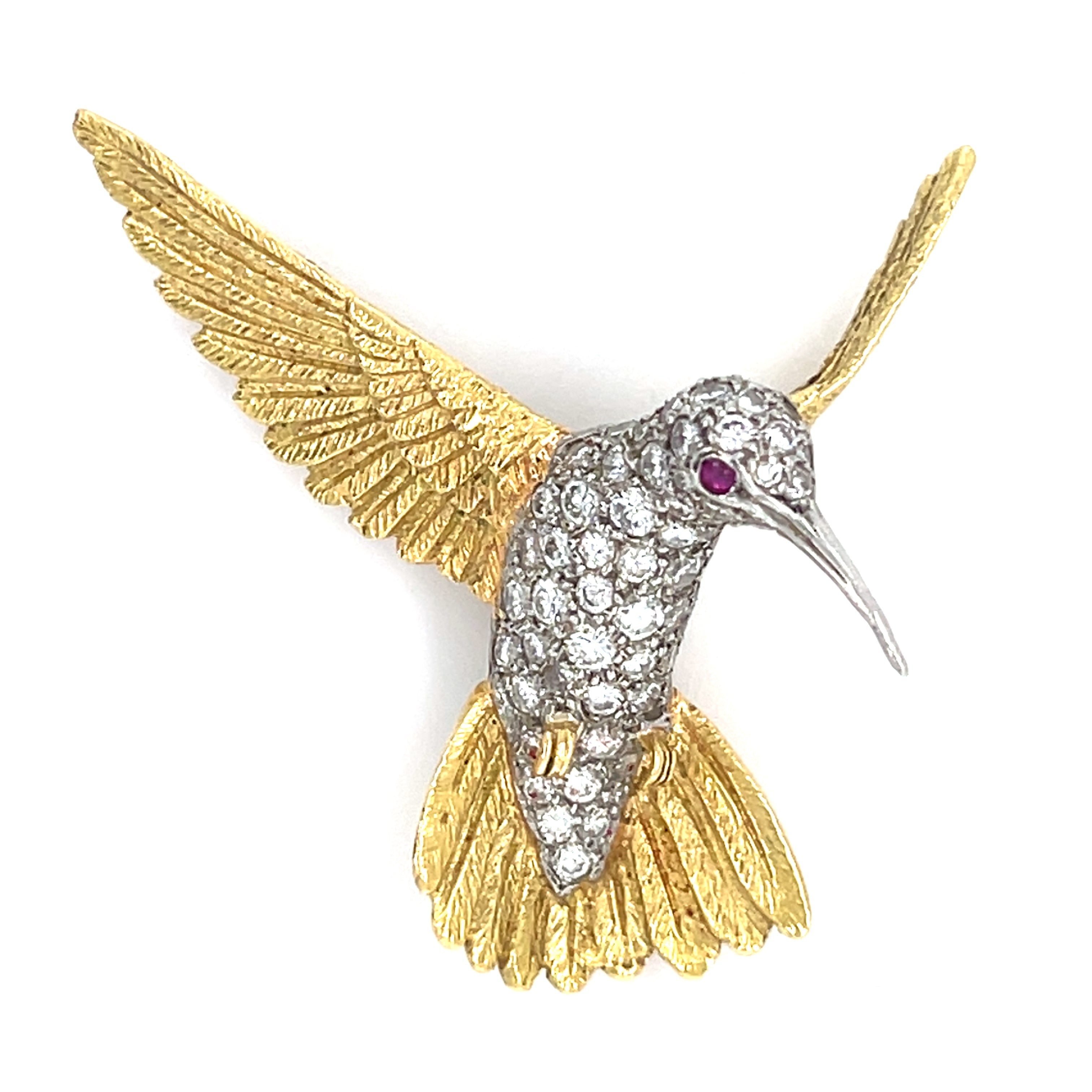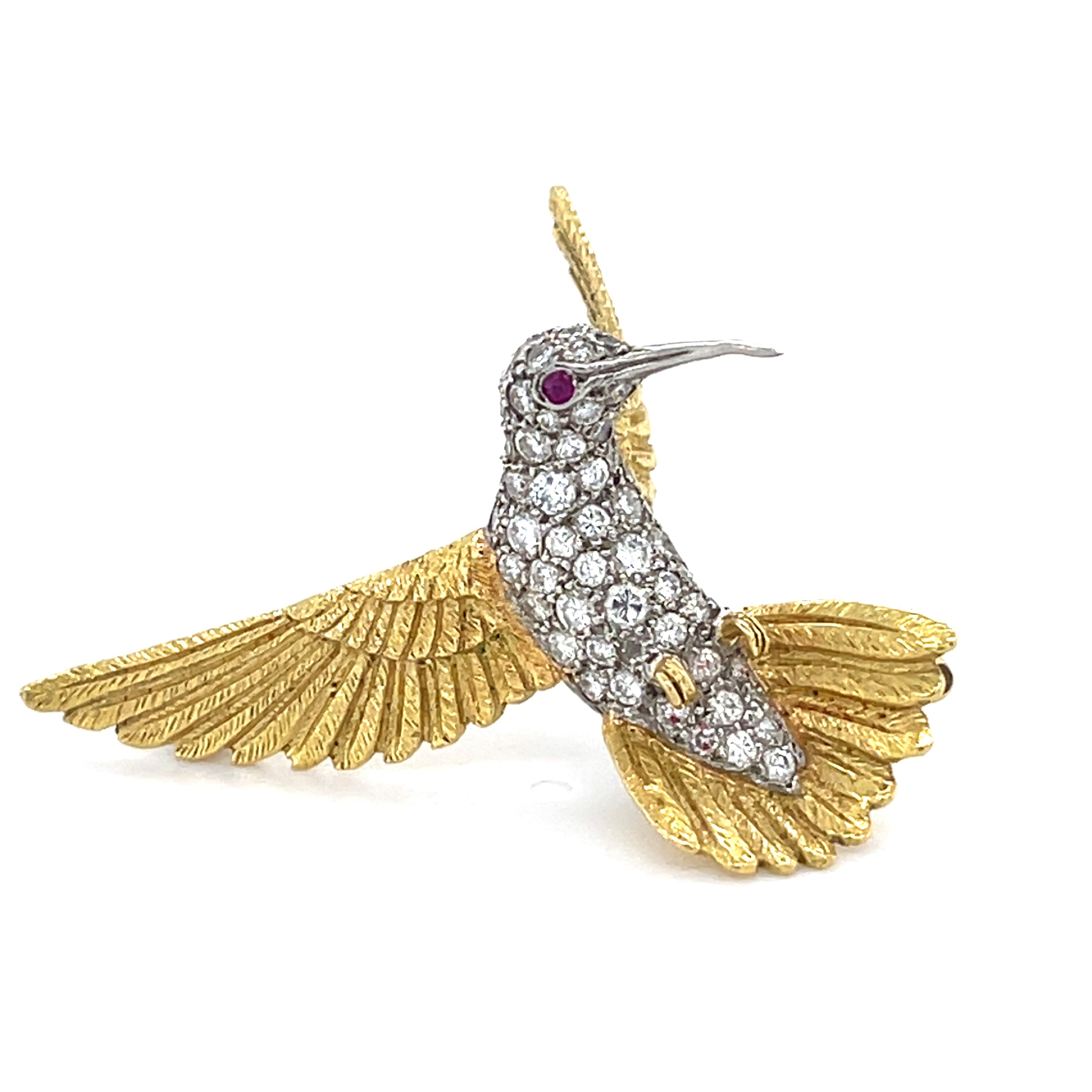 18k Two-Tone Gold & 1ct Diamond Sculpted Hummingbird Brooch w/ Ruby Accents