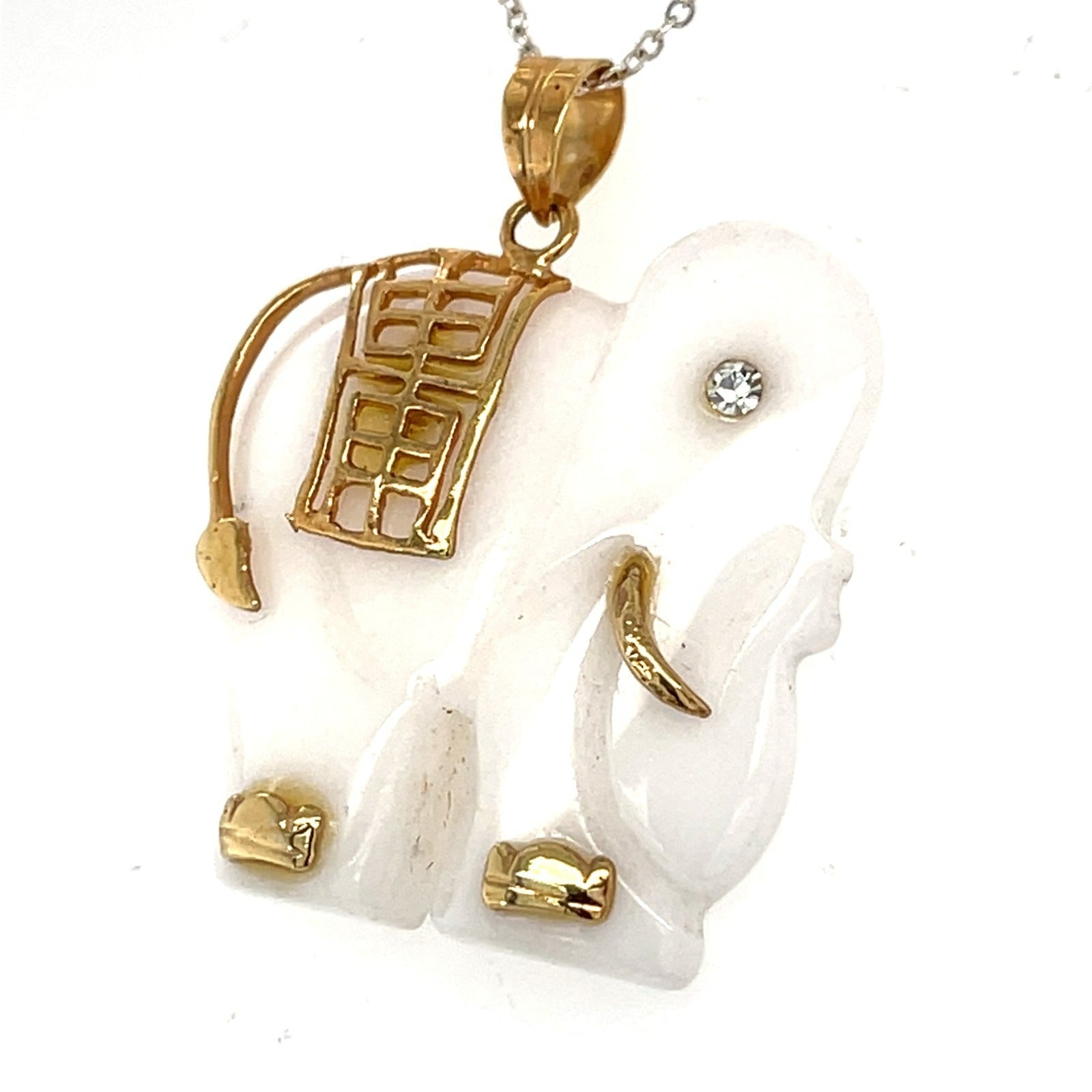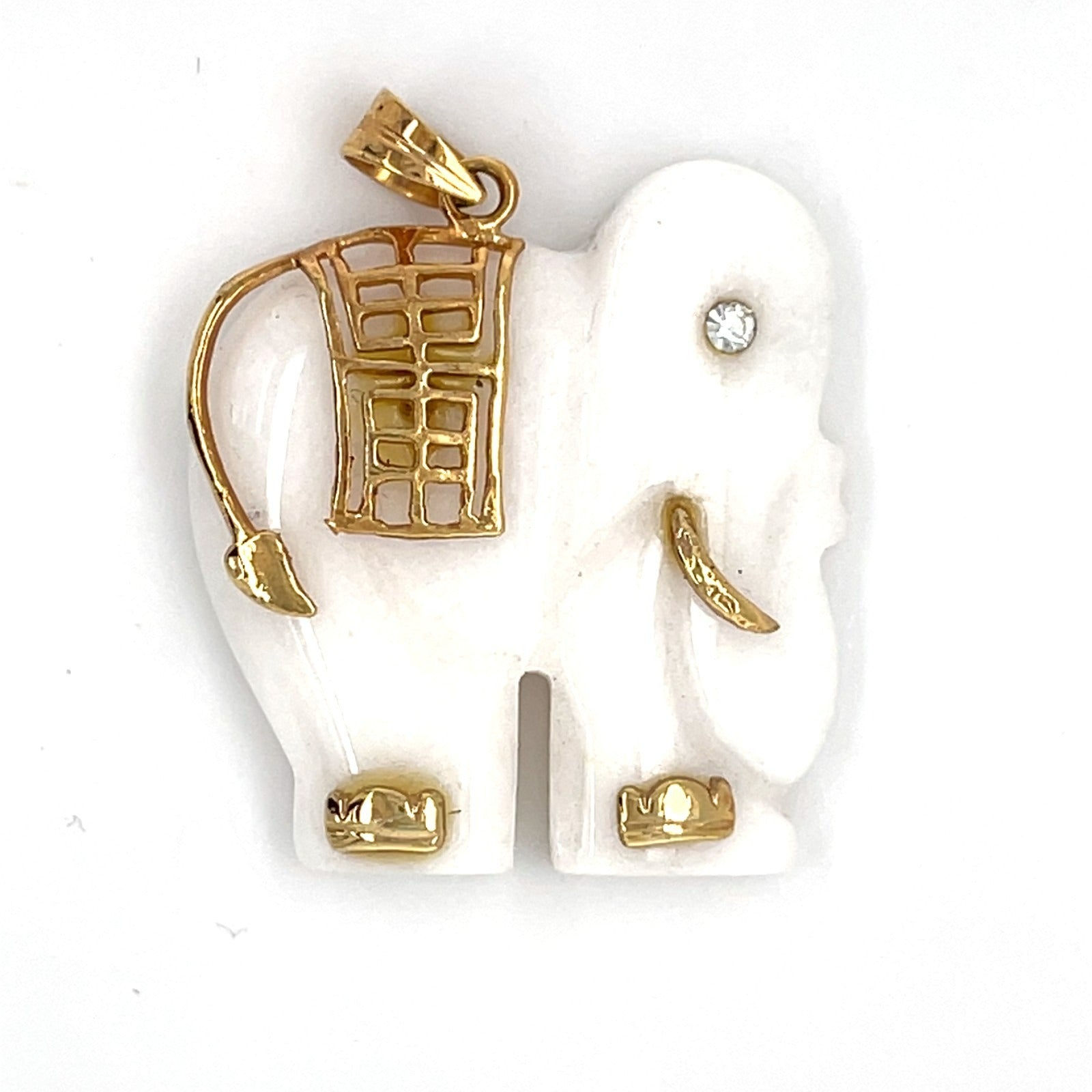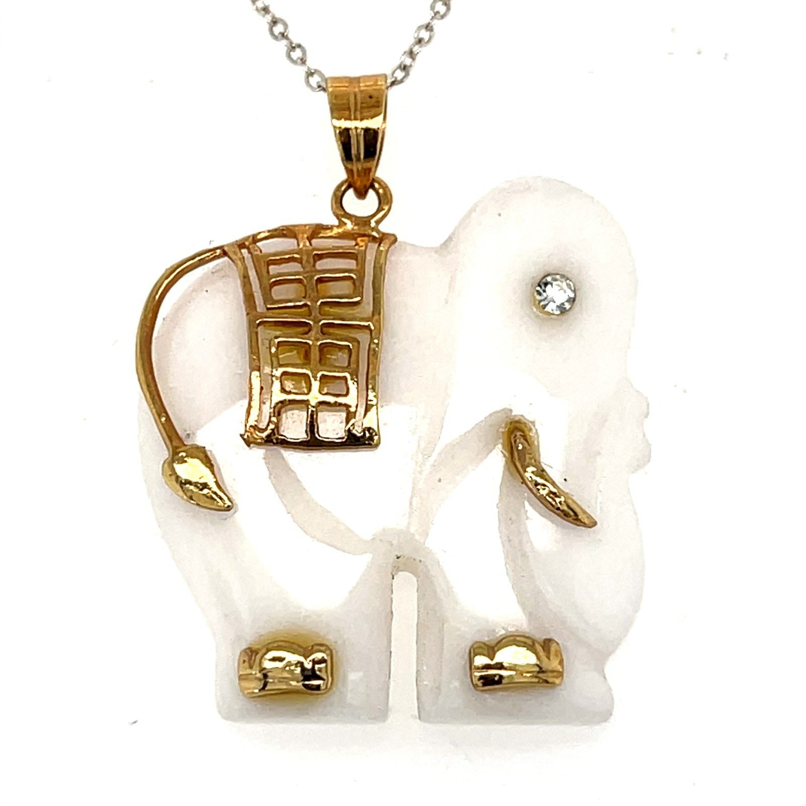 Beautiful elephant design pendant featuring a carved white jade body, detailed gold accents and a sparkling diamond eye.