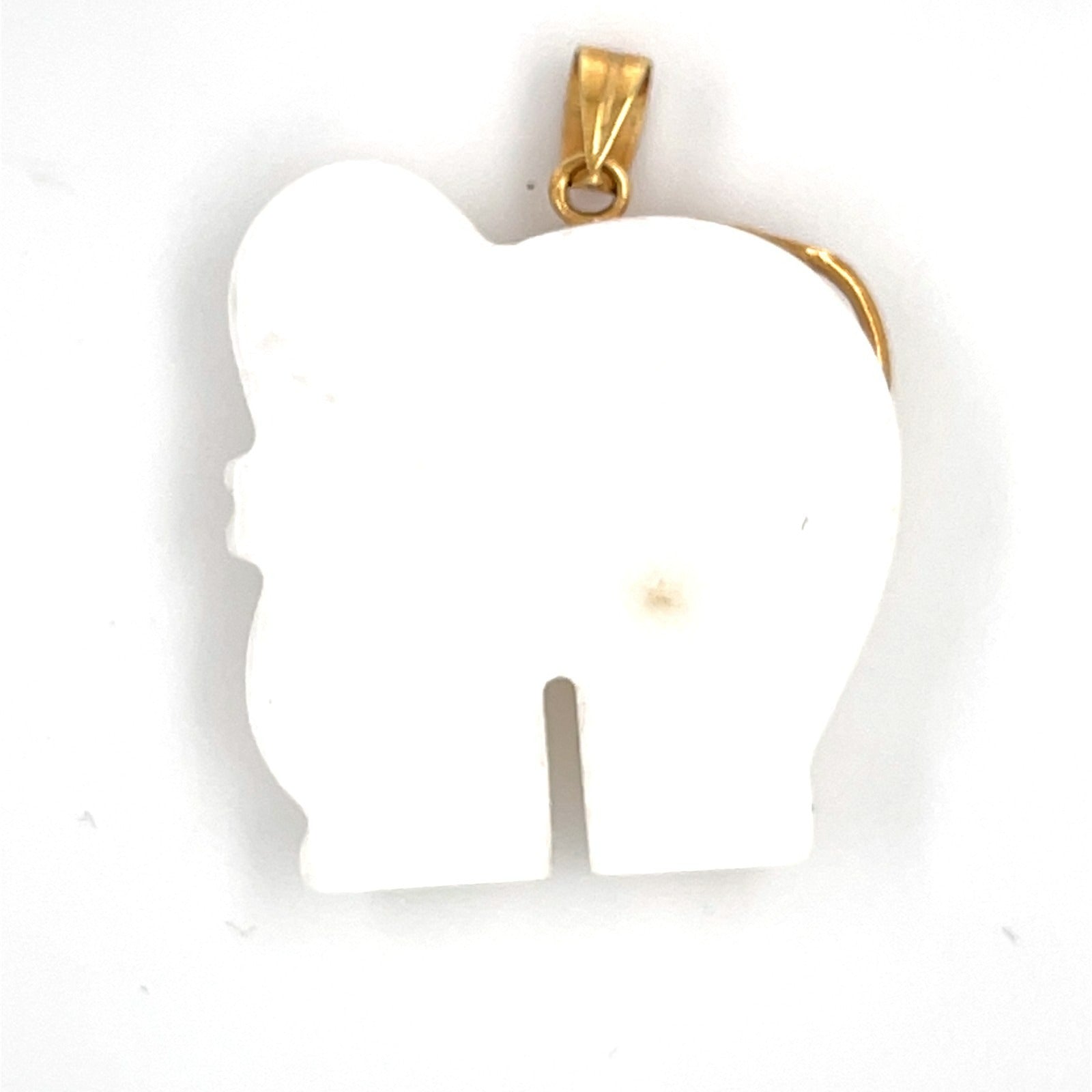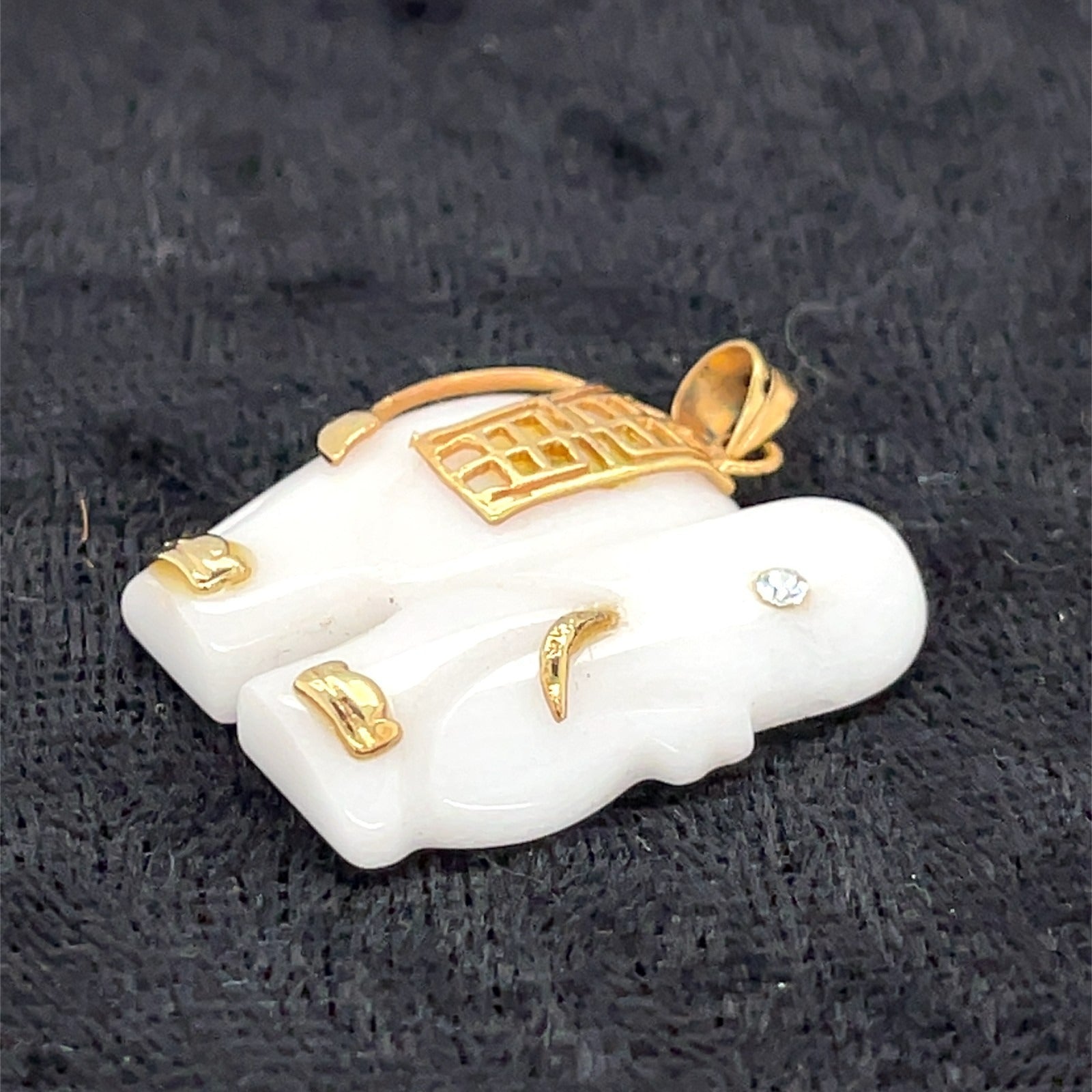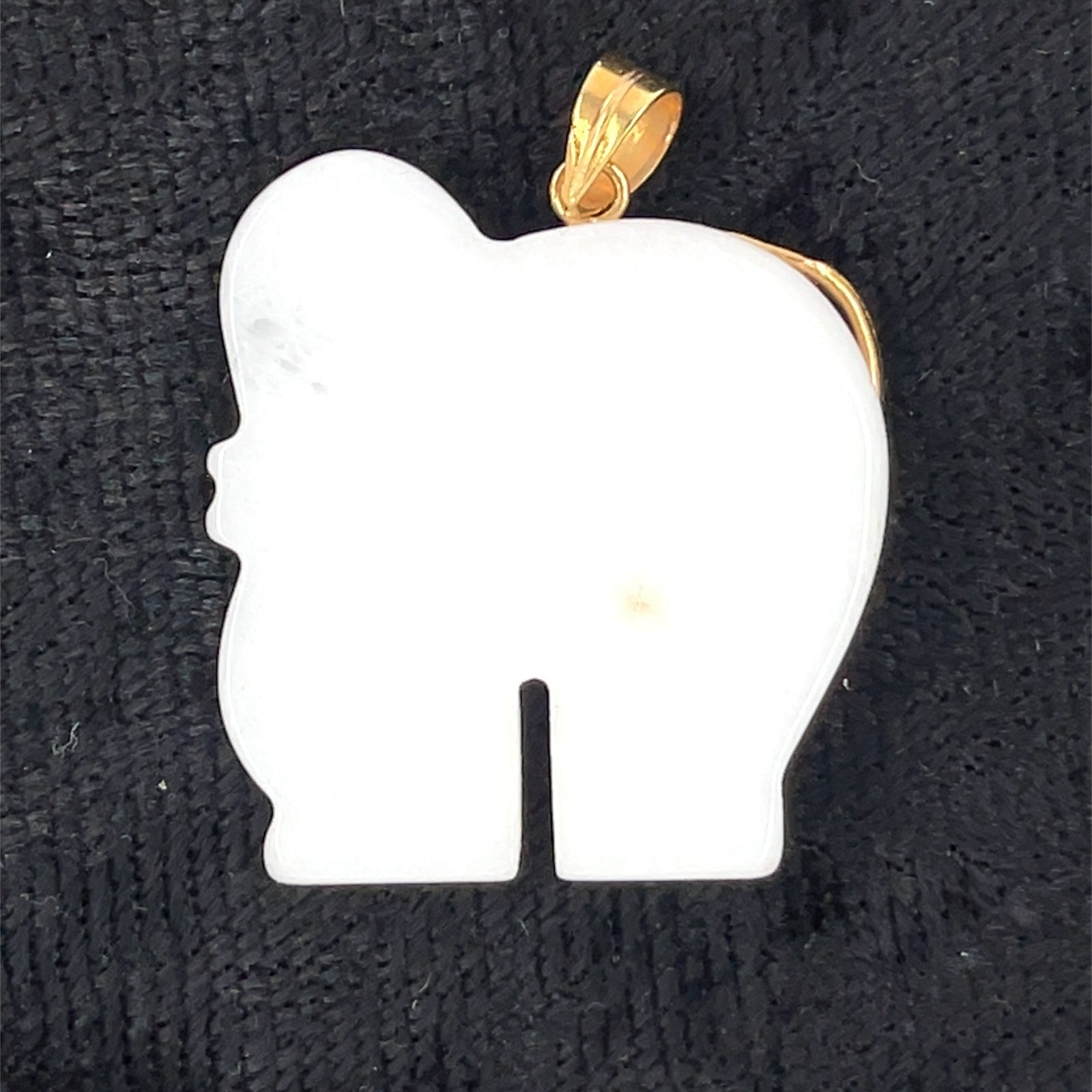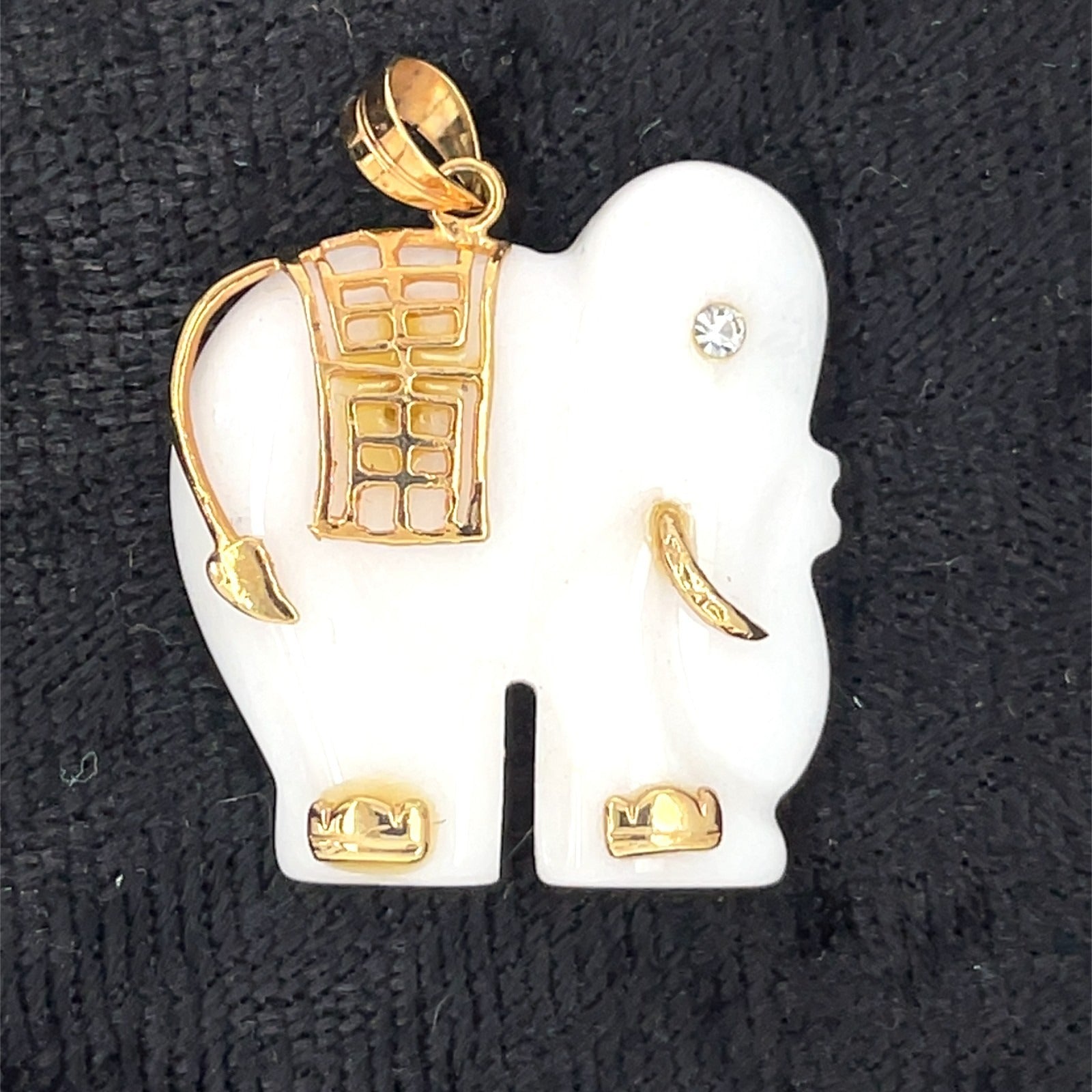 Beautiful elephant design pendant featuring a carved white jade body, detailed gold accents and a sparkling diamond eye.