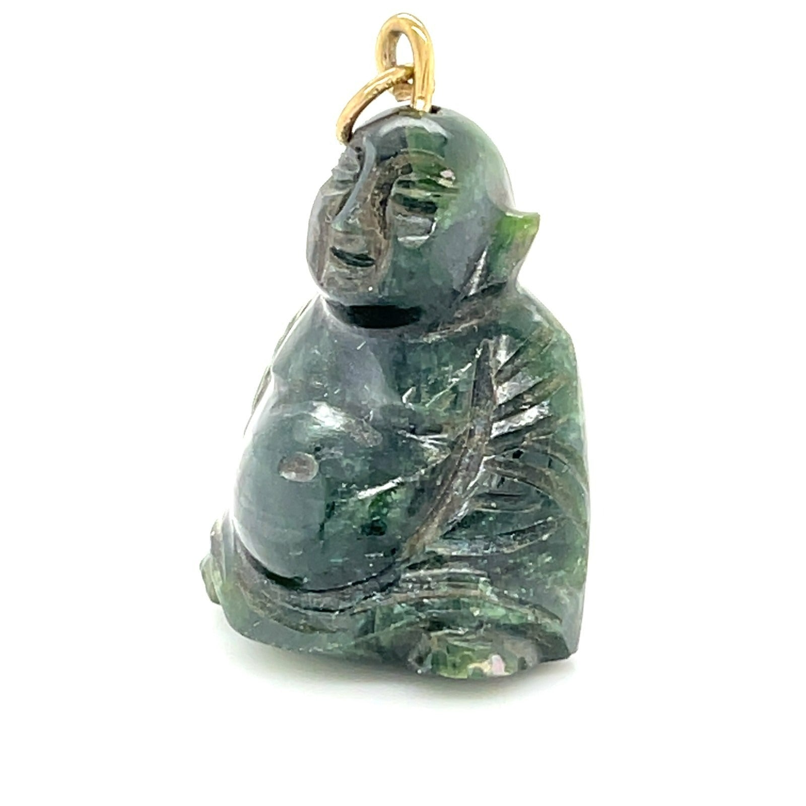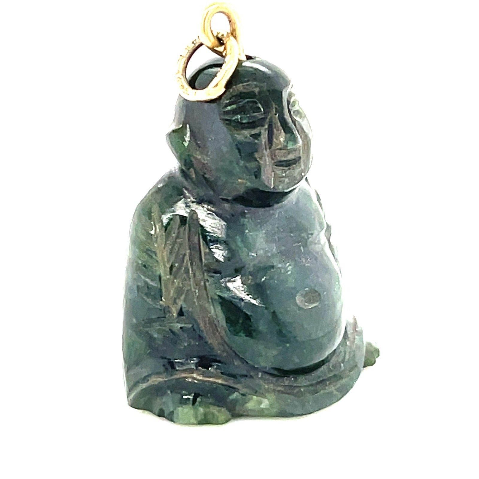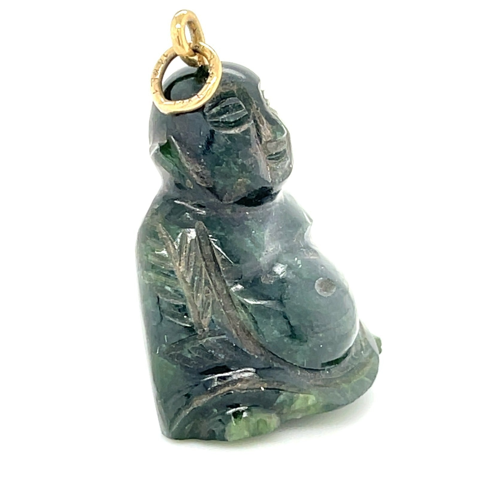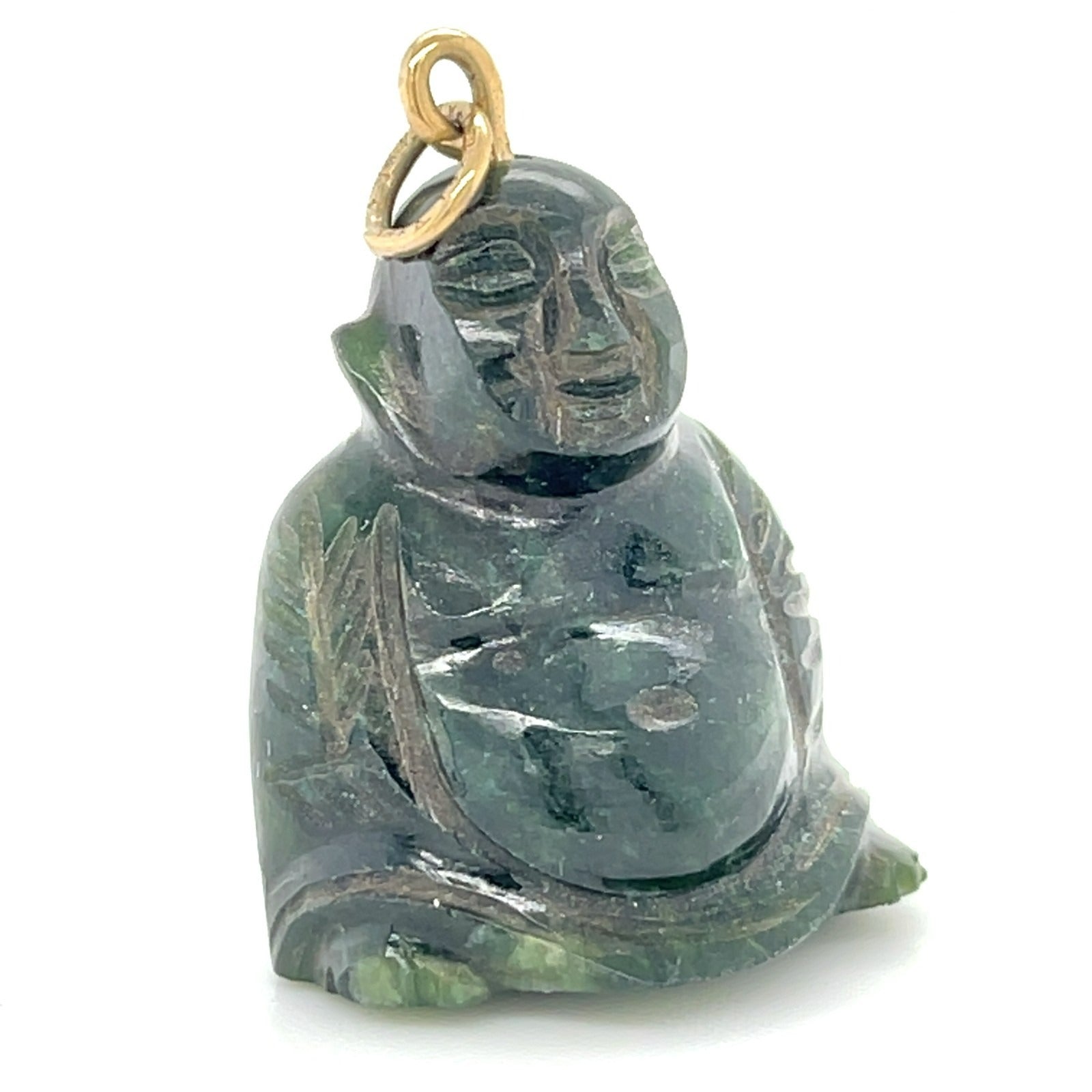 Buddha carved from dark green jade with a 14k yellow gold bail.