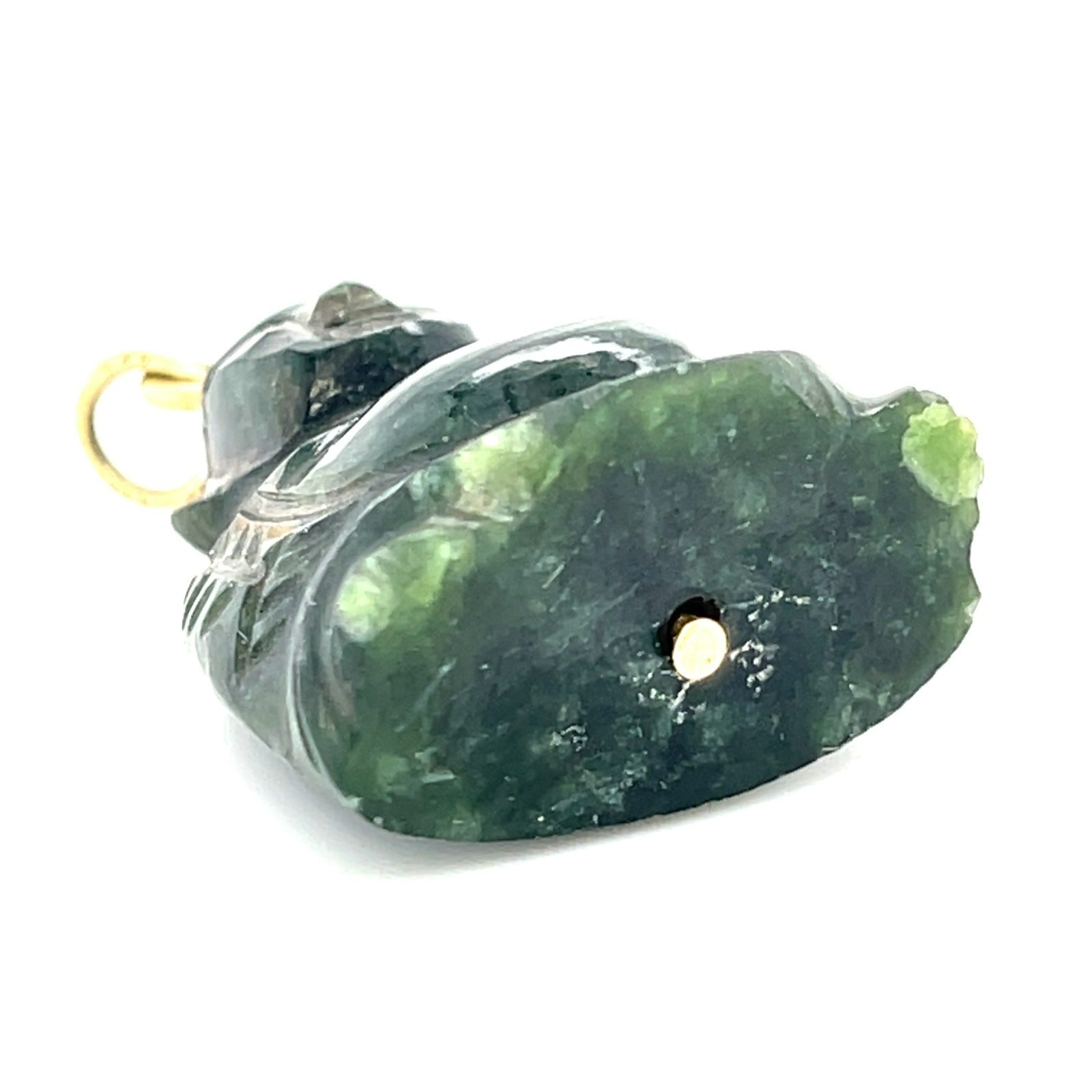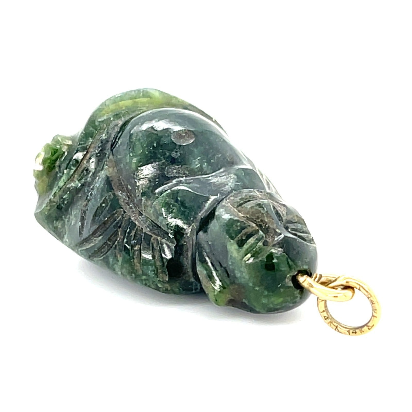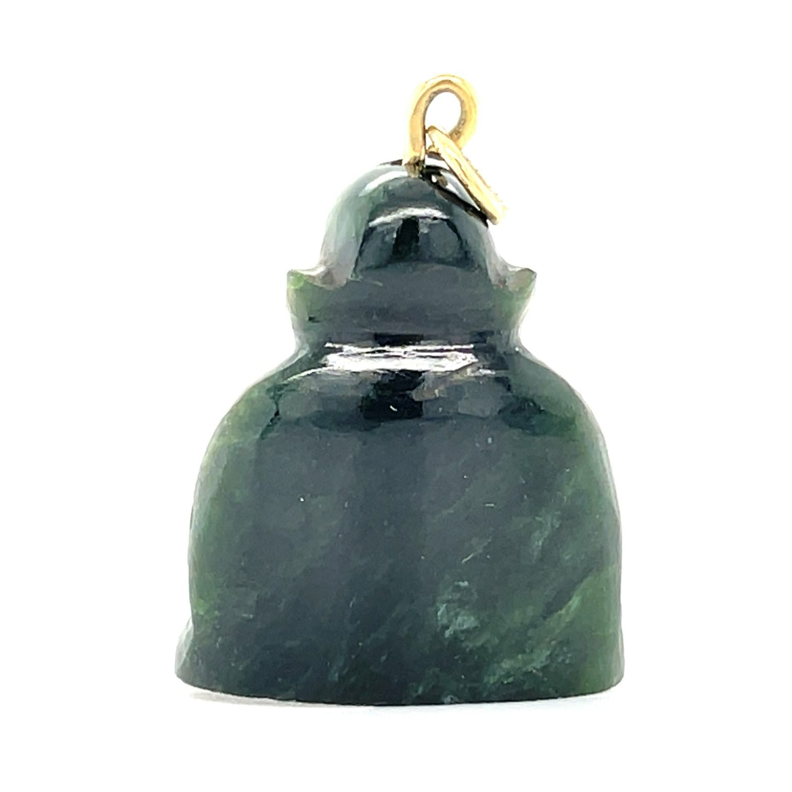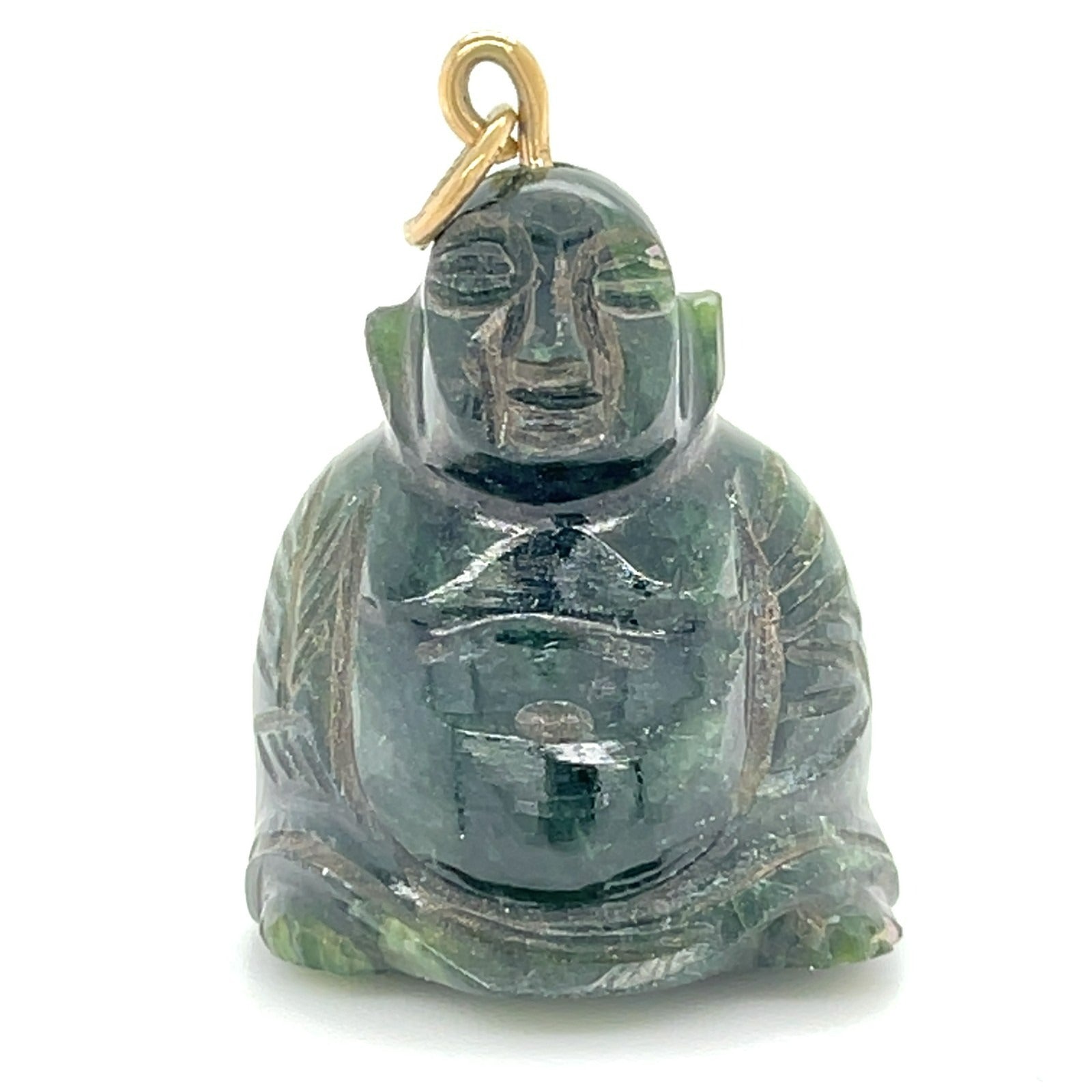 Buddha carved from dark green jade with a 14k yellow gold bail.