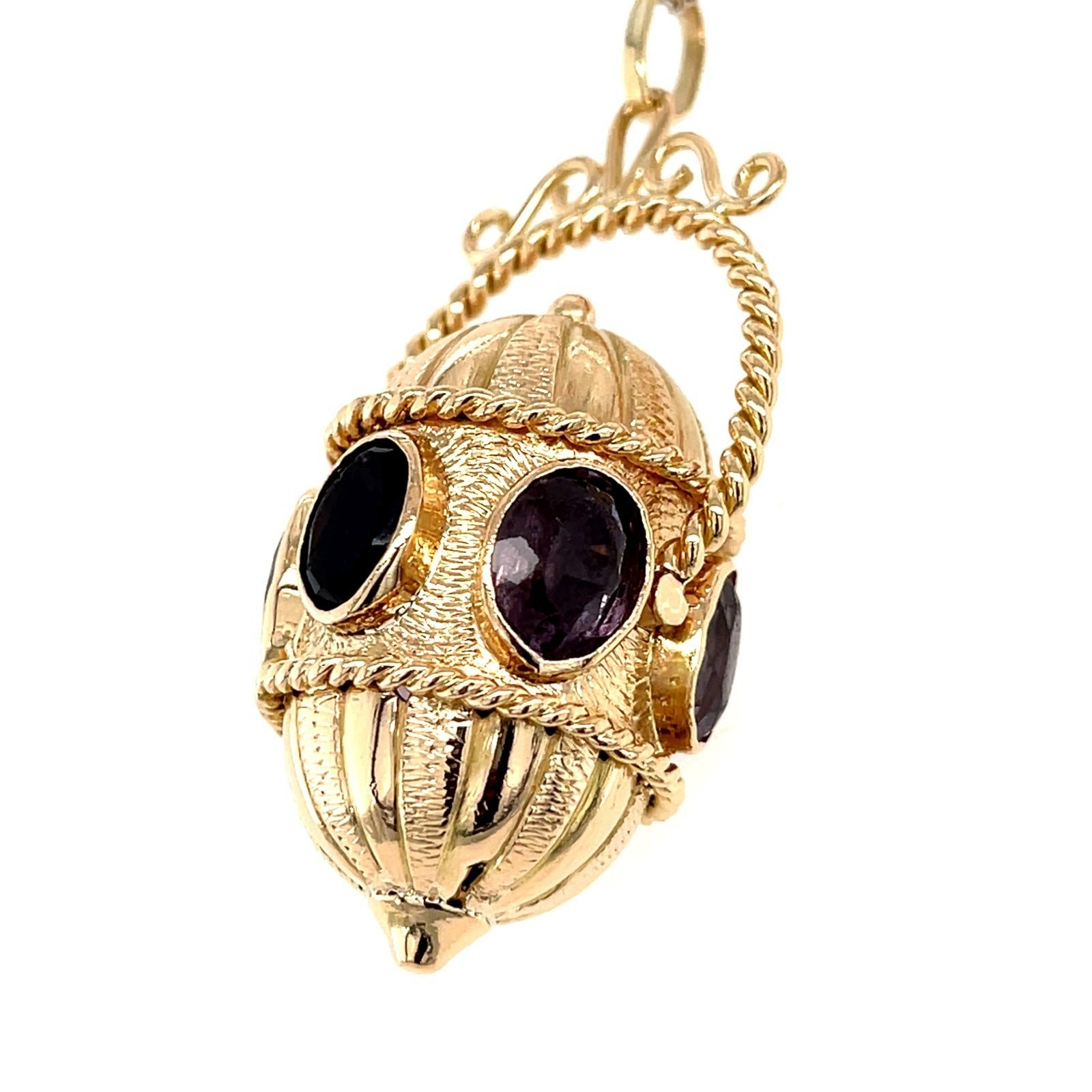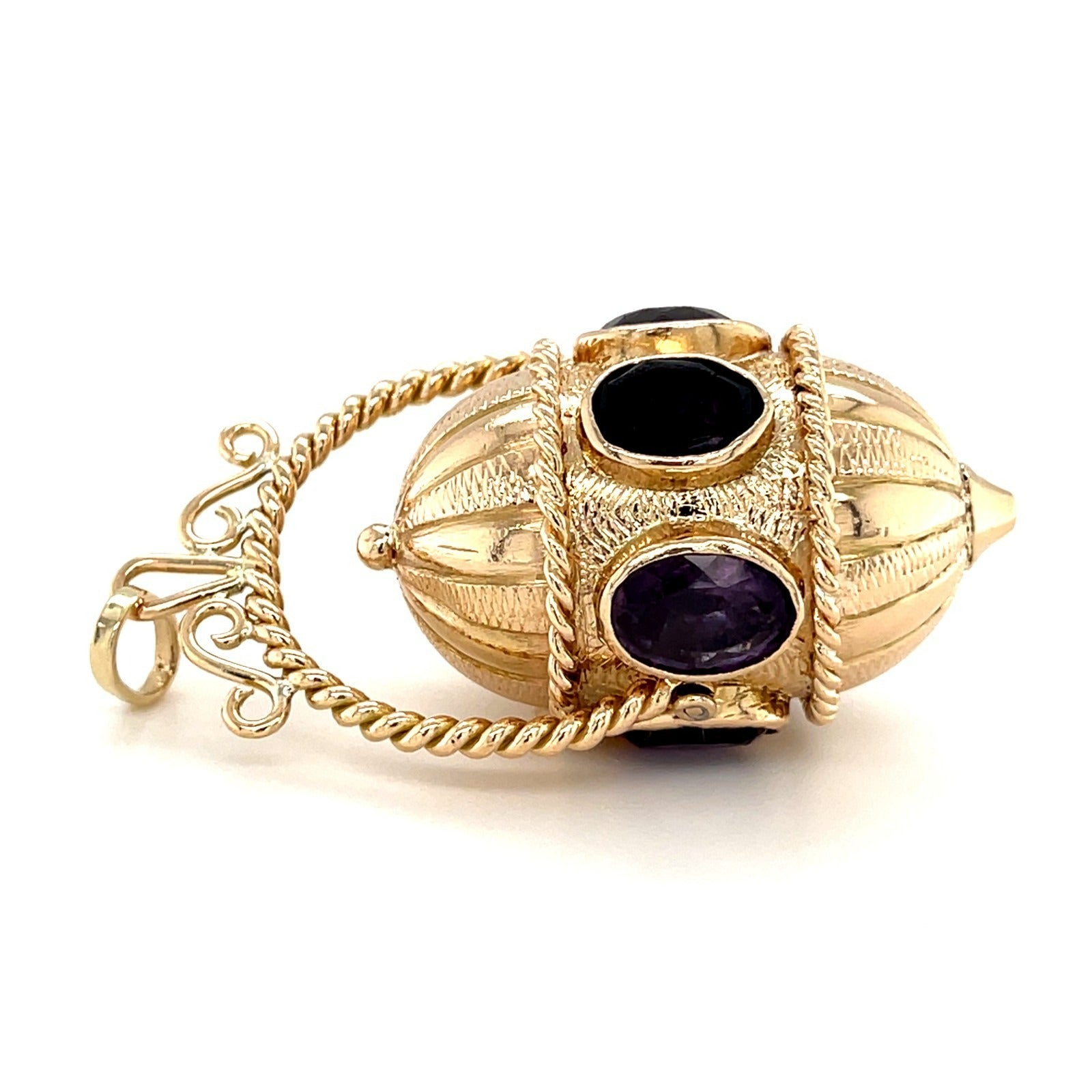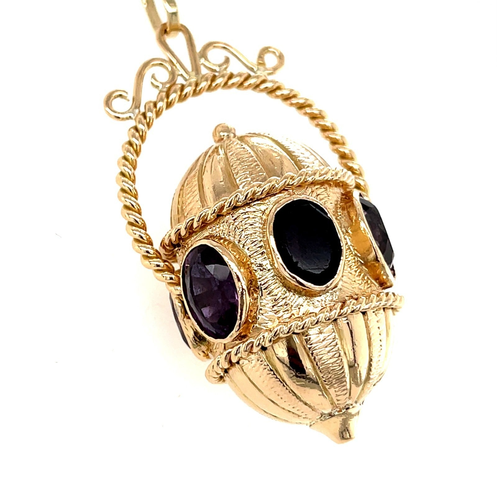 Beautiful vintage 18k yellow gold charm pendant featuring richly colored faceted oval amethyst stones set in an ornate, textured gold design.