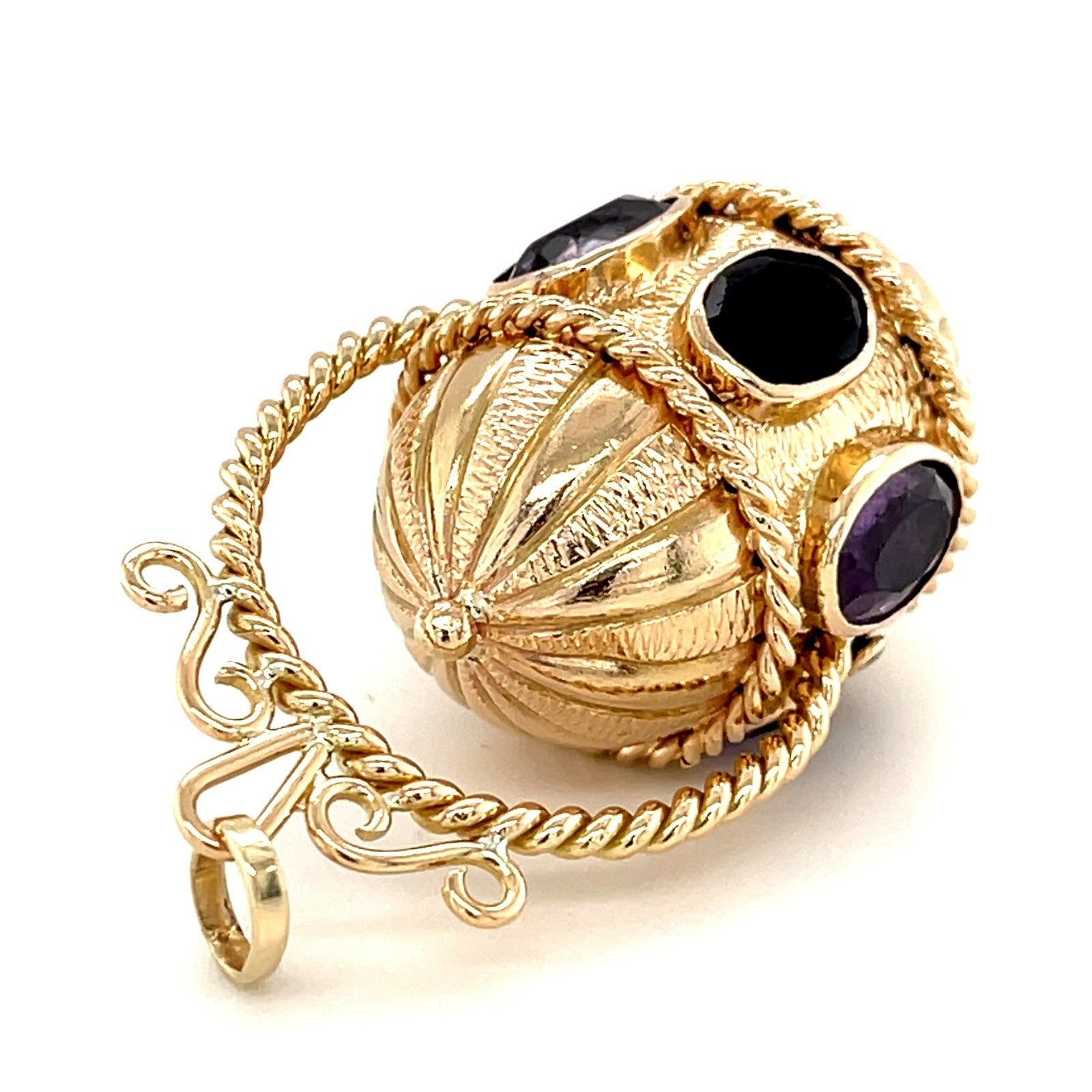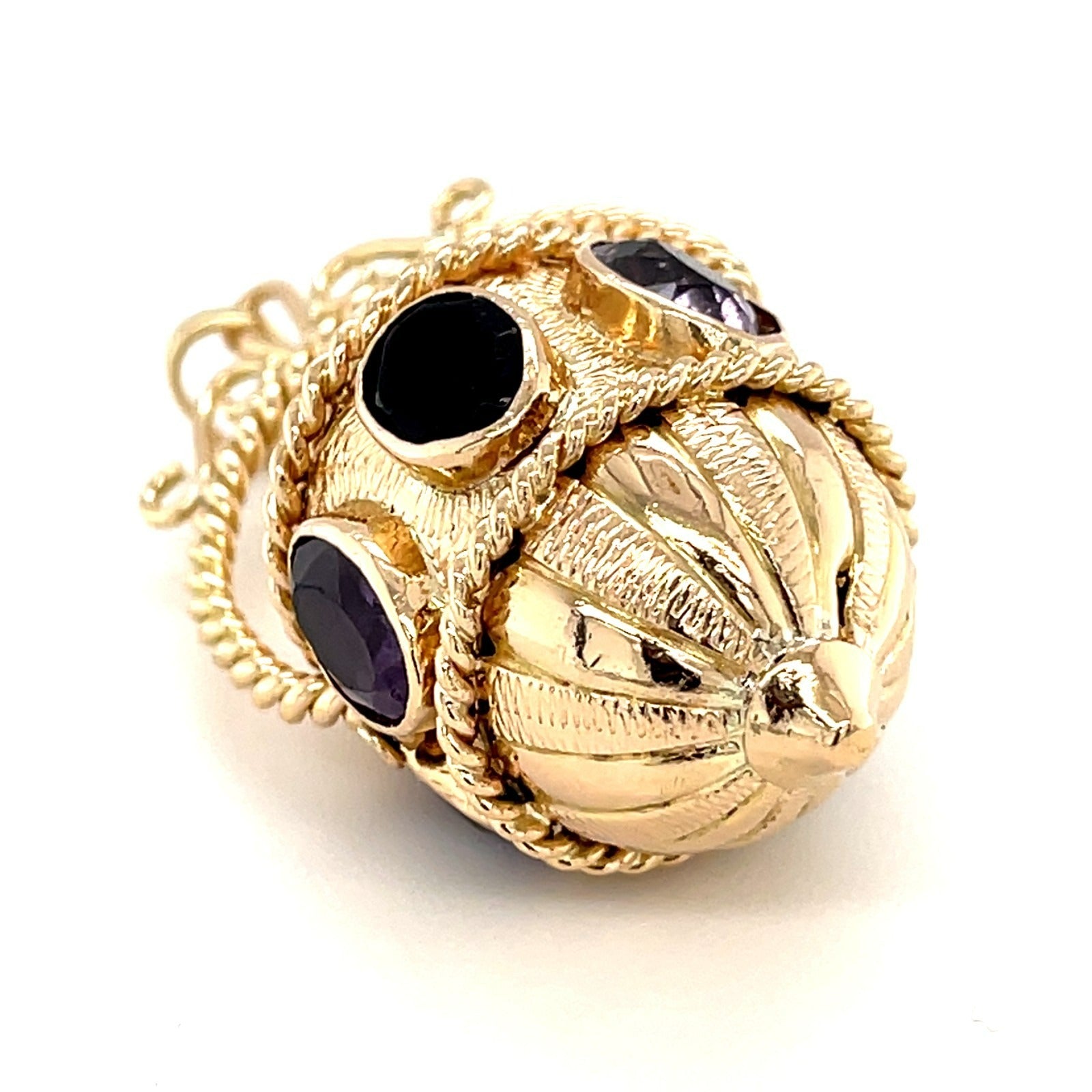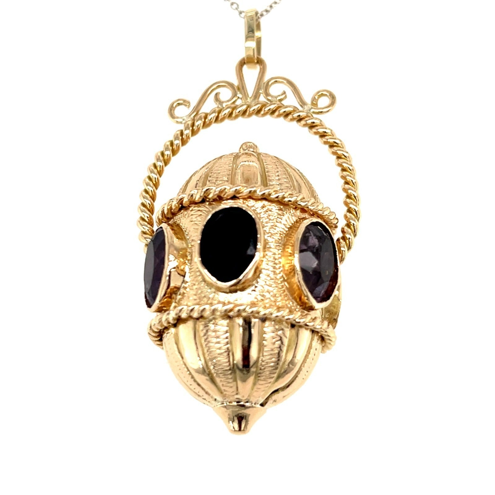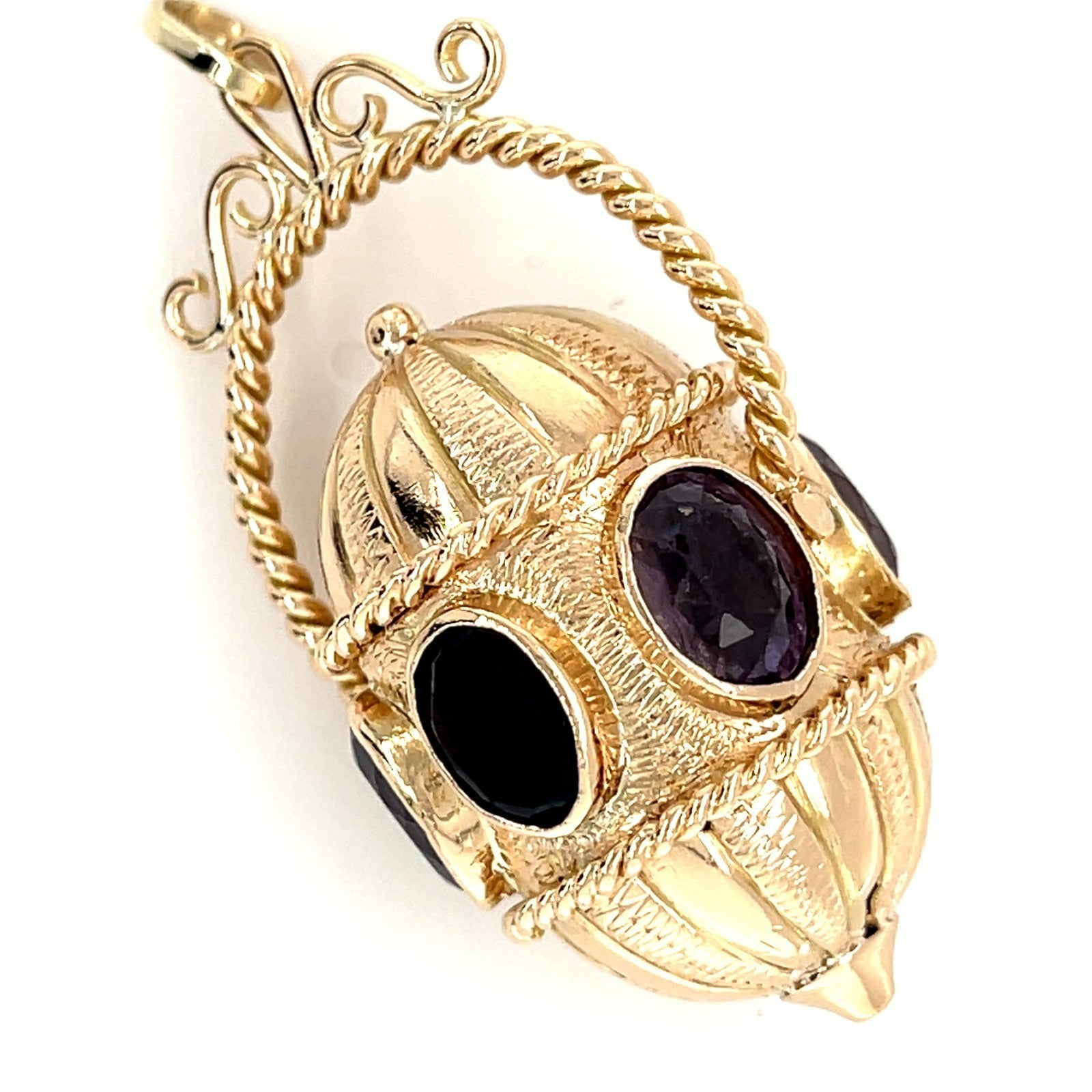 Beautiful vintage 18k yellow gold charm pendant featuring richly colored faceted oval amethyst stones set in an ornate, textured gold design.