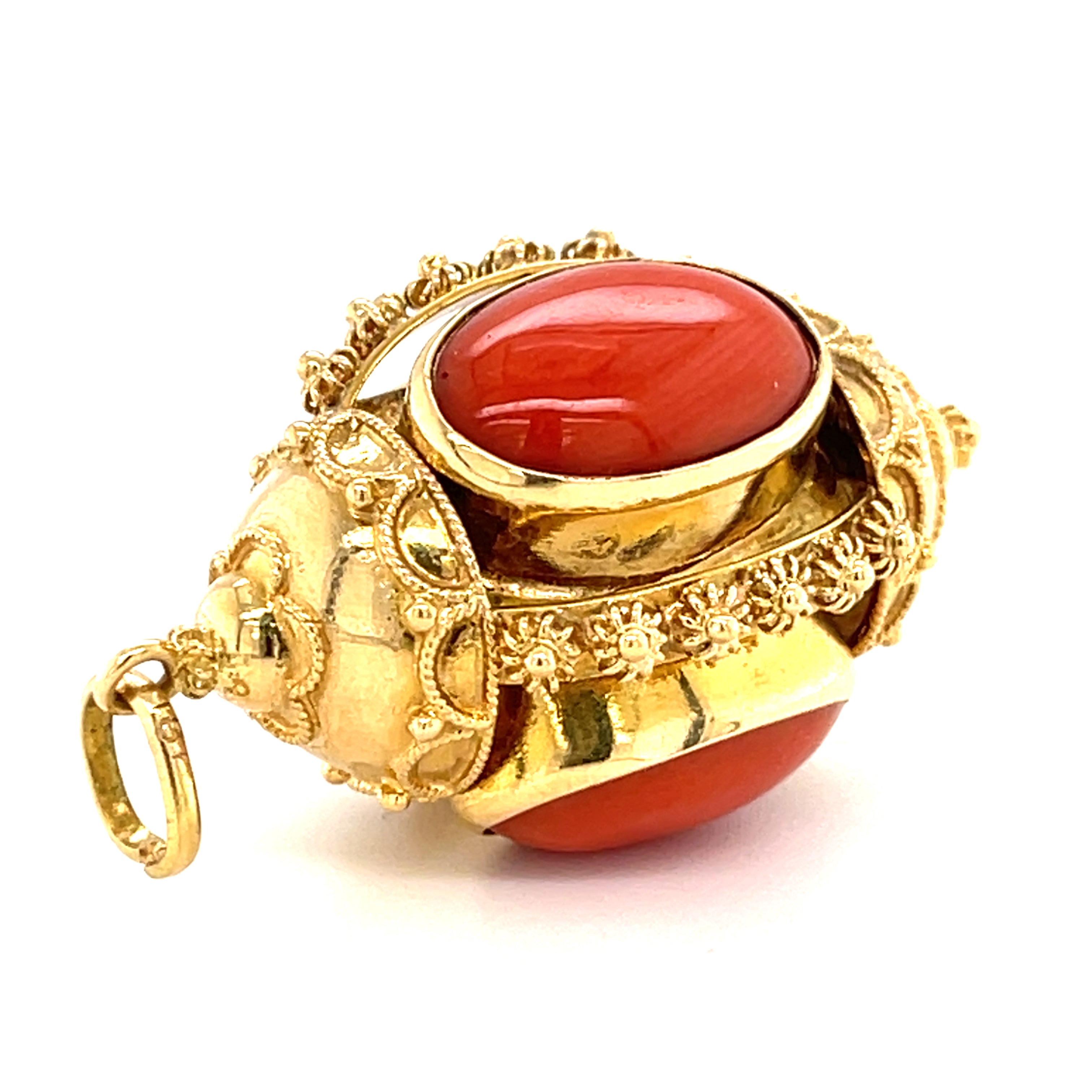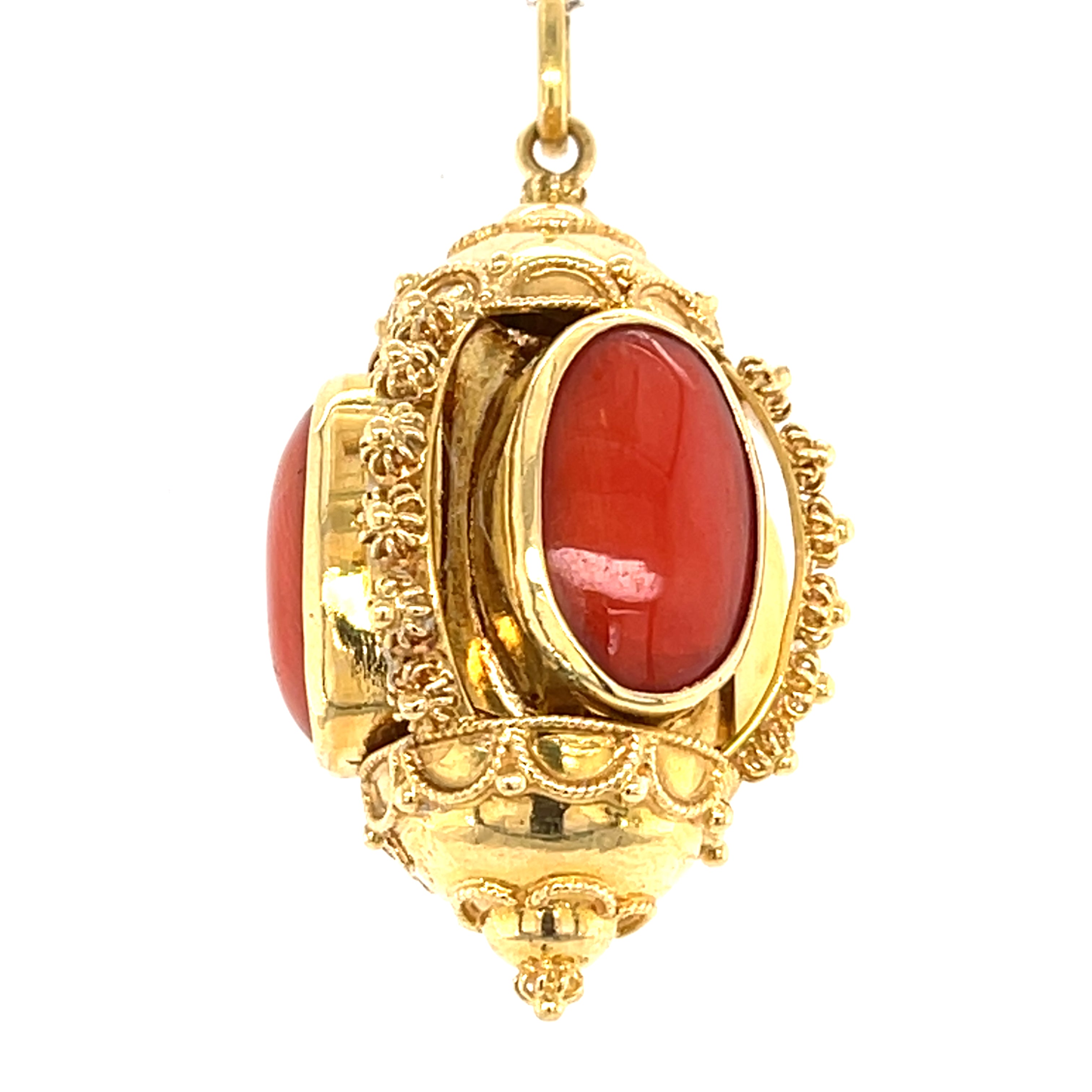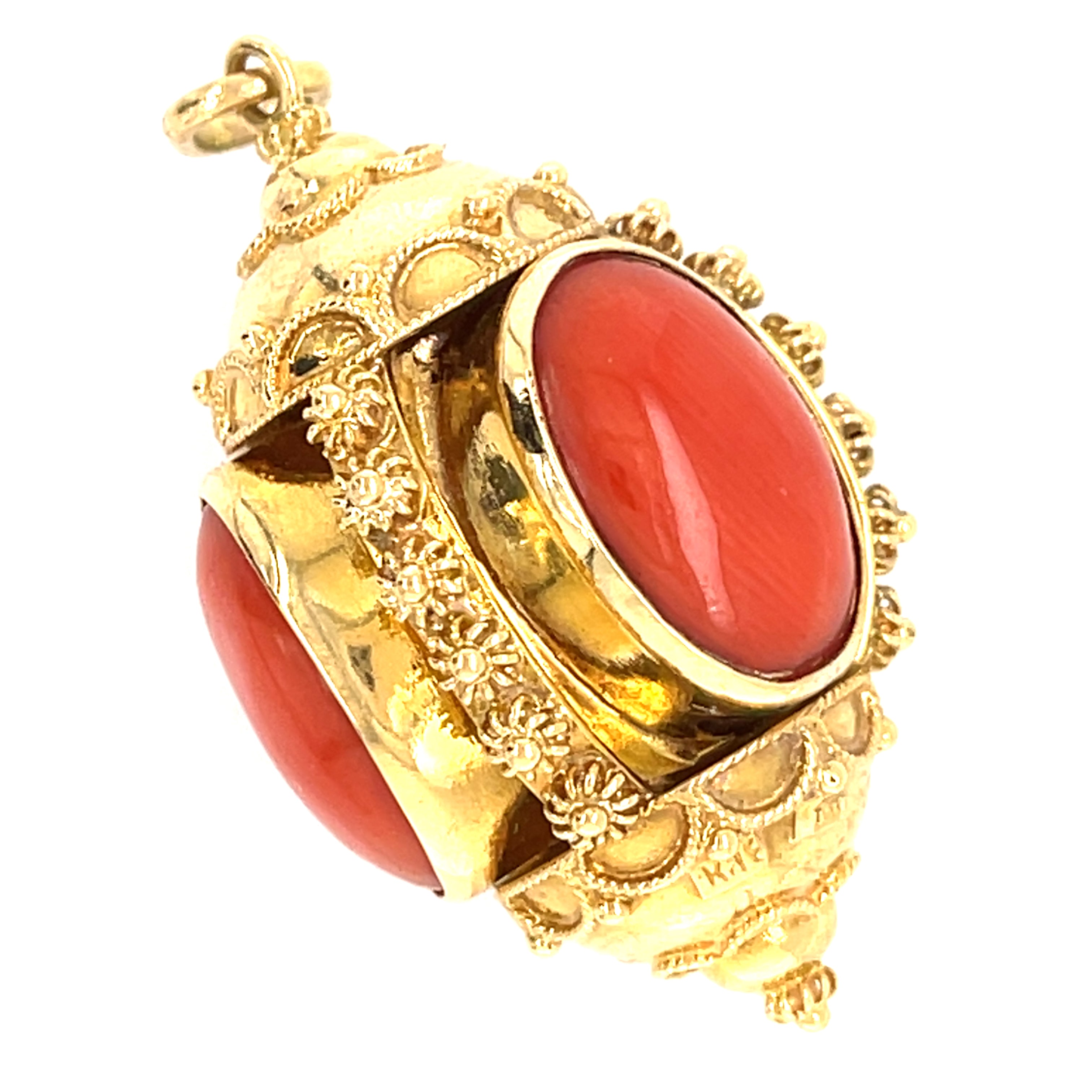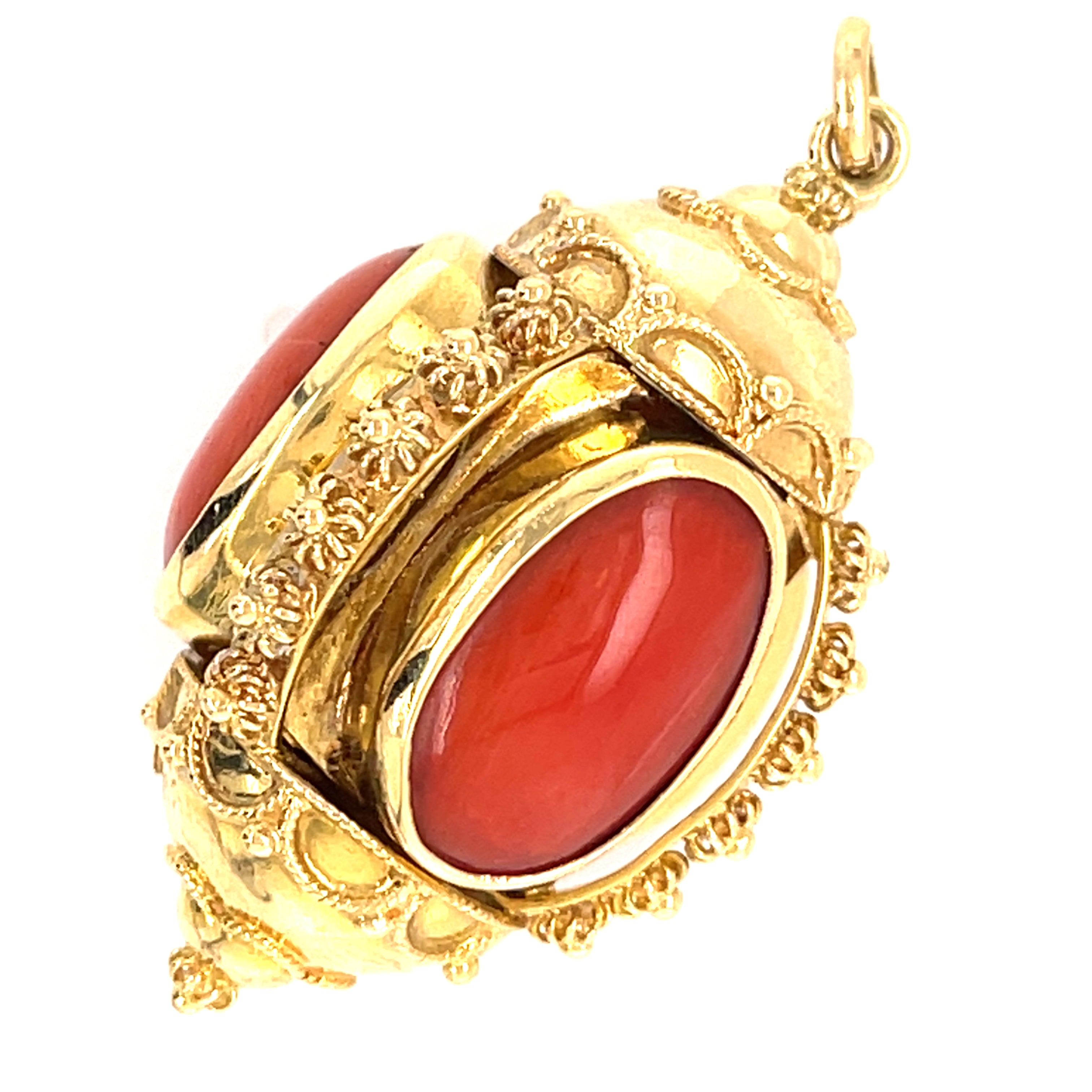 18k Yellow Gold & Coral Cabochon Ornate Pendant, 14.5g.
