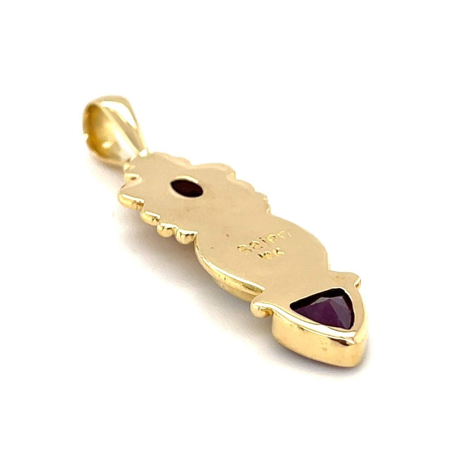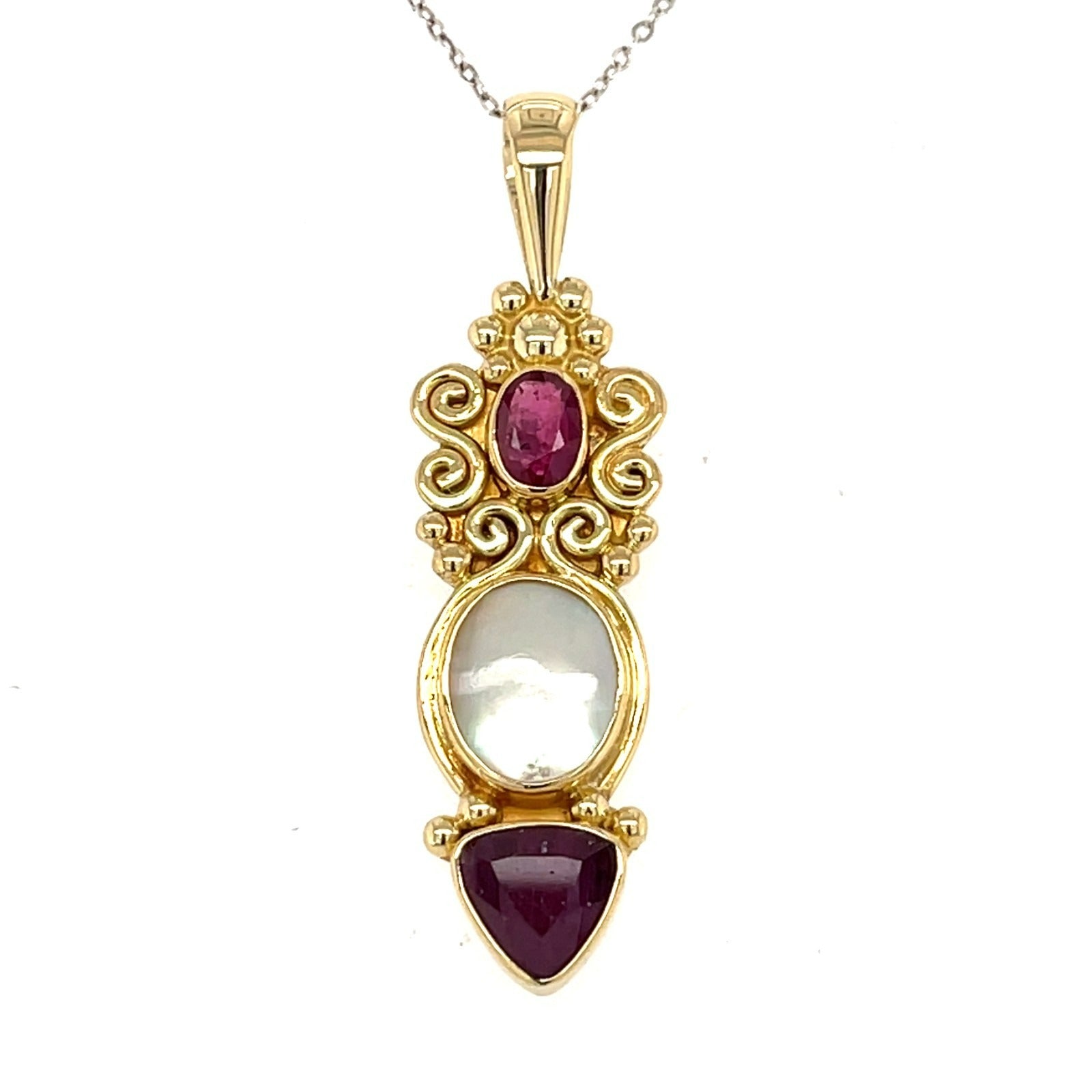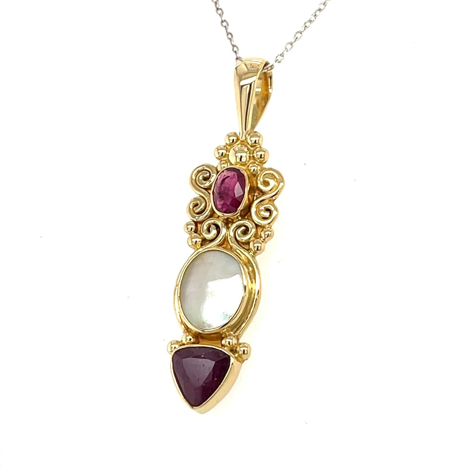Intricate 18k gold pendant, adorned with ruby and mother-of-pearl, by Sajen.