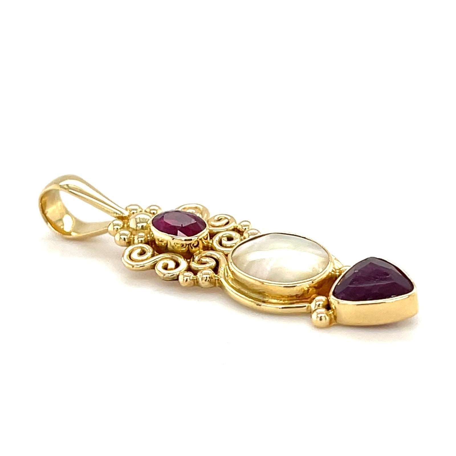 Sajen 18k Yellow Gold Ornate Pendant with Ruby & Mother of Pearl, 1.3 inch