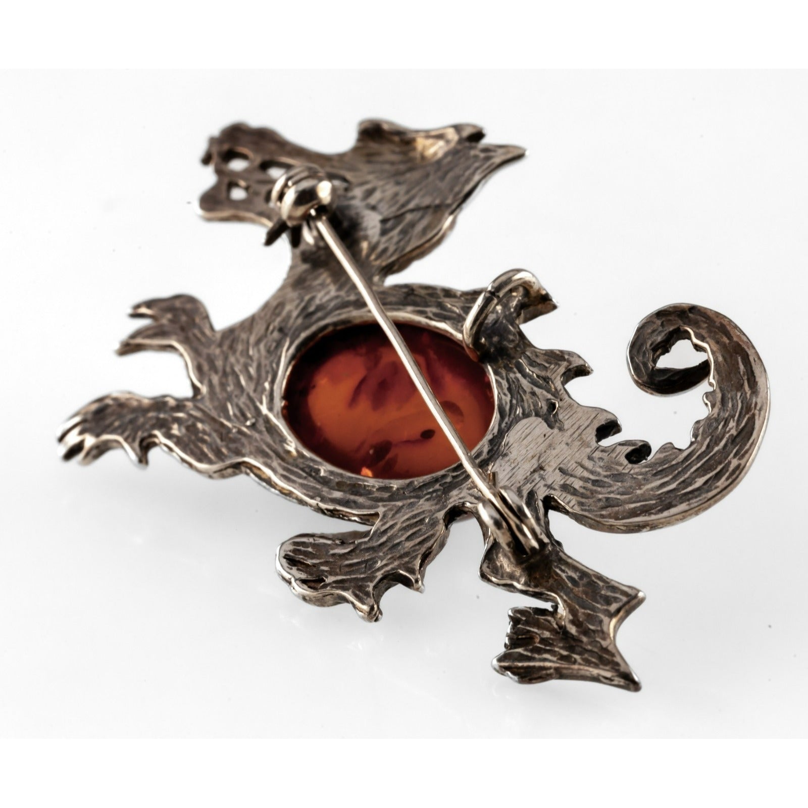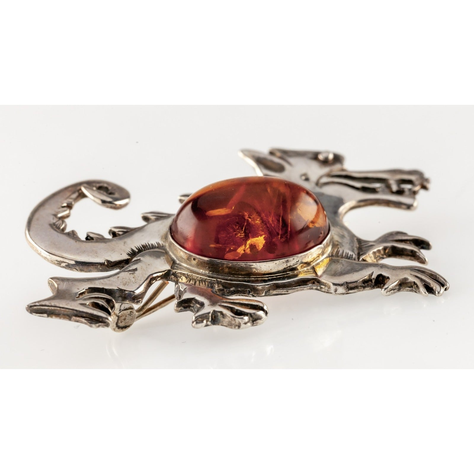 Sterling Silver & Baltic Amber Chinese Dragon Pendant / Brooch, 2 inch