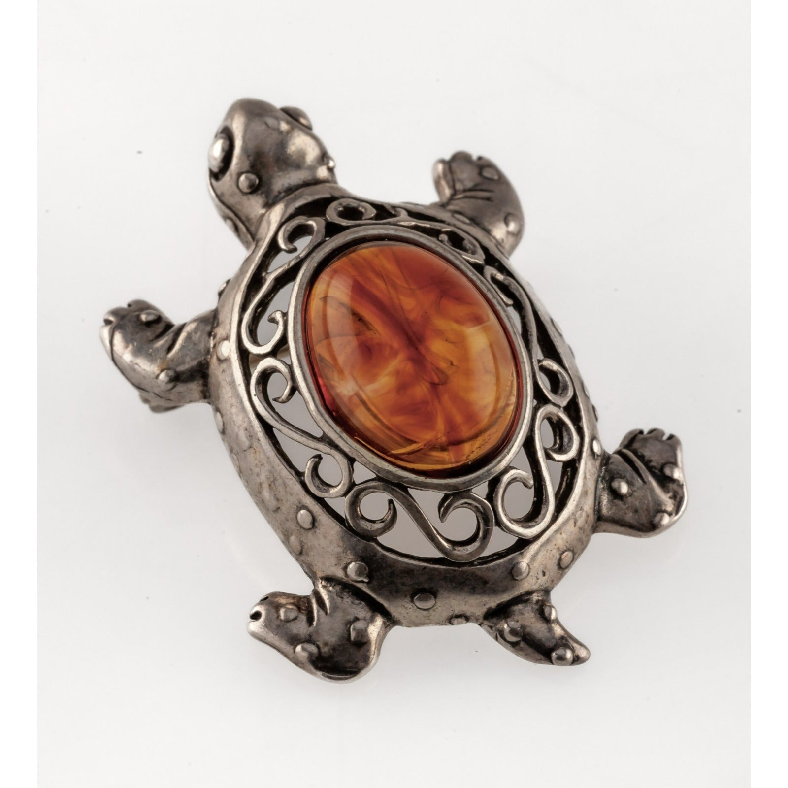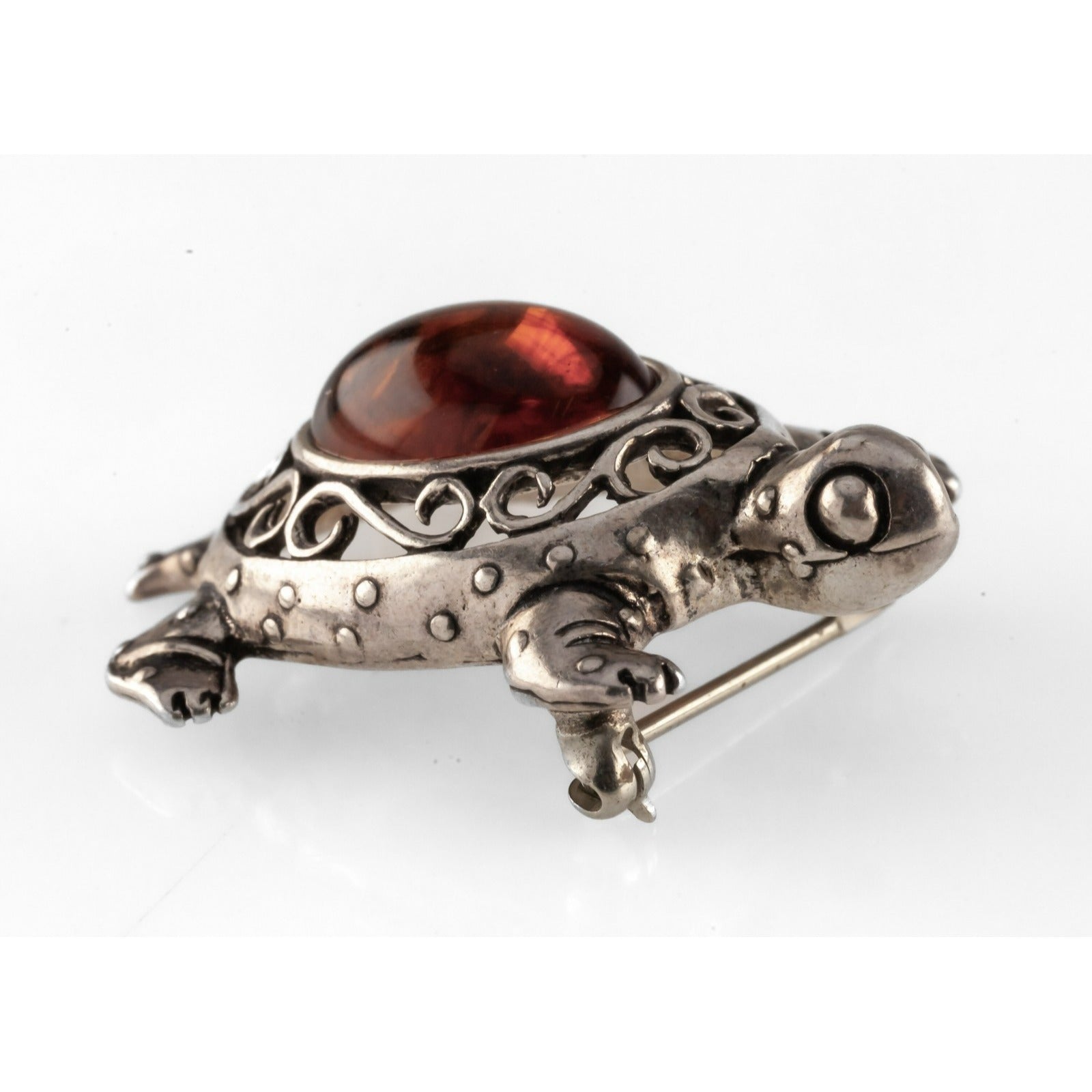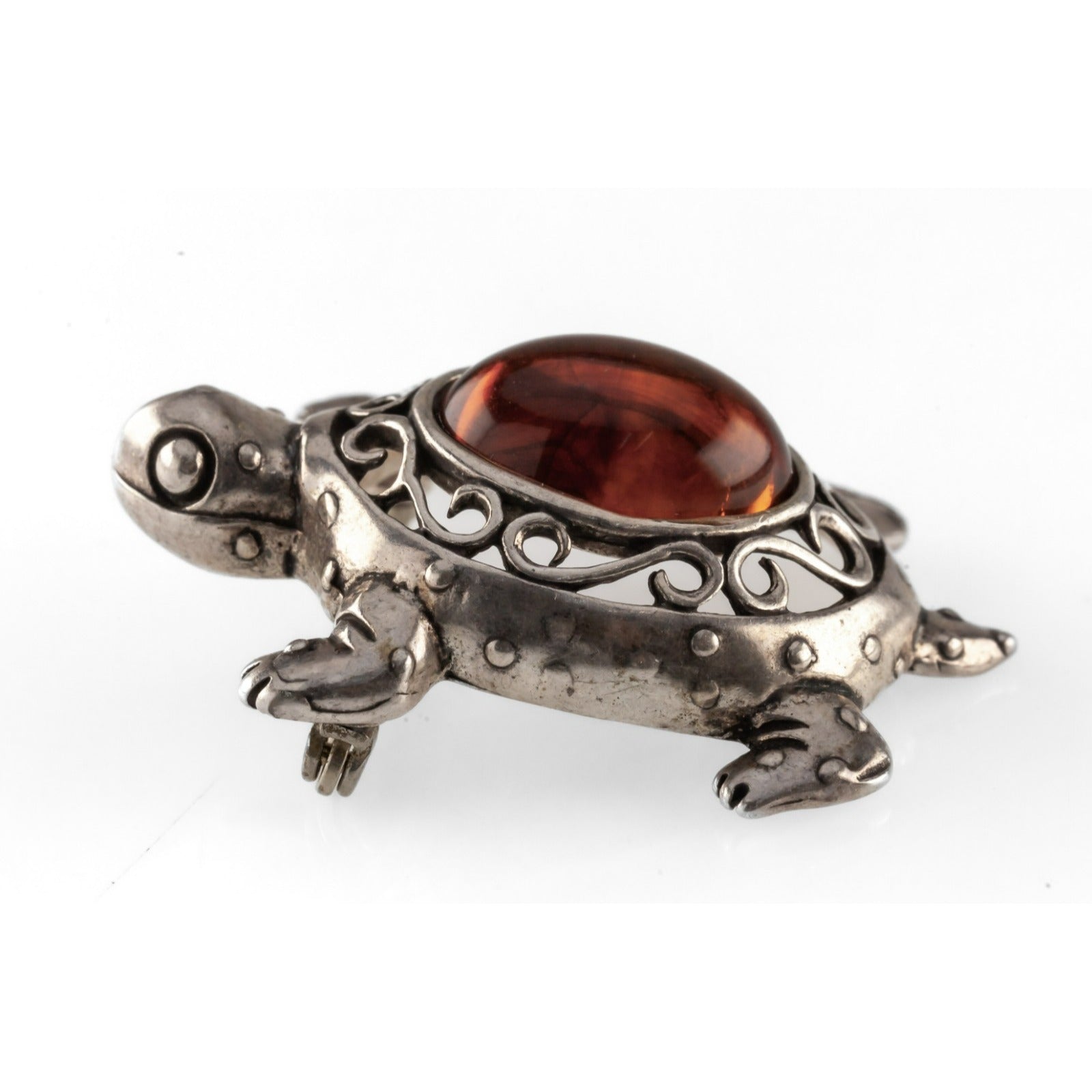 Sterling Silver & Cognac Amber Turtle Brooch w/ Filigree Accent, 34mm
