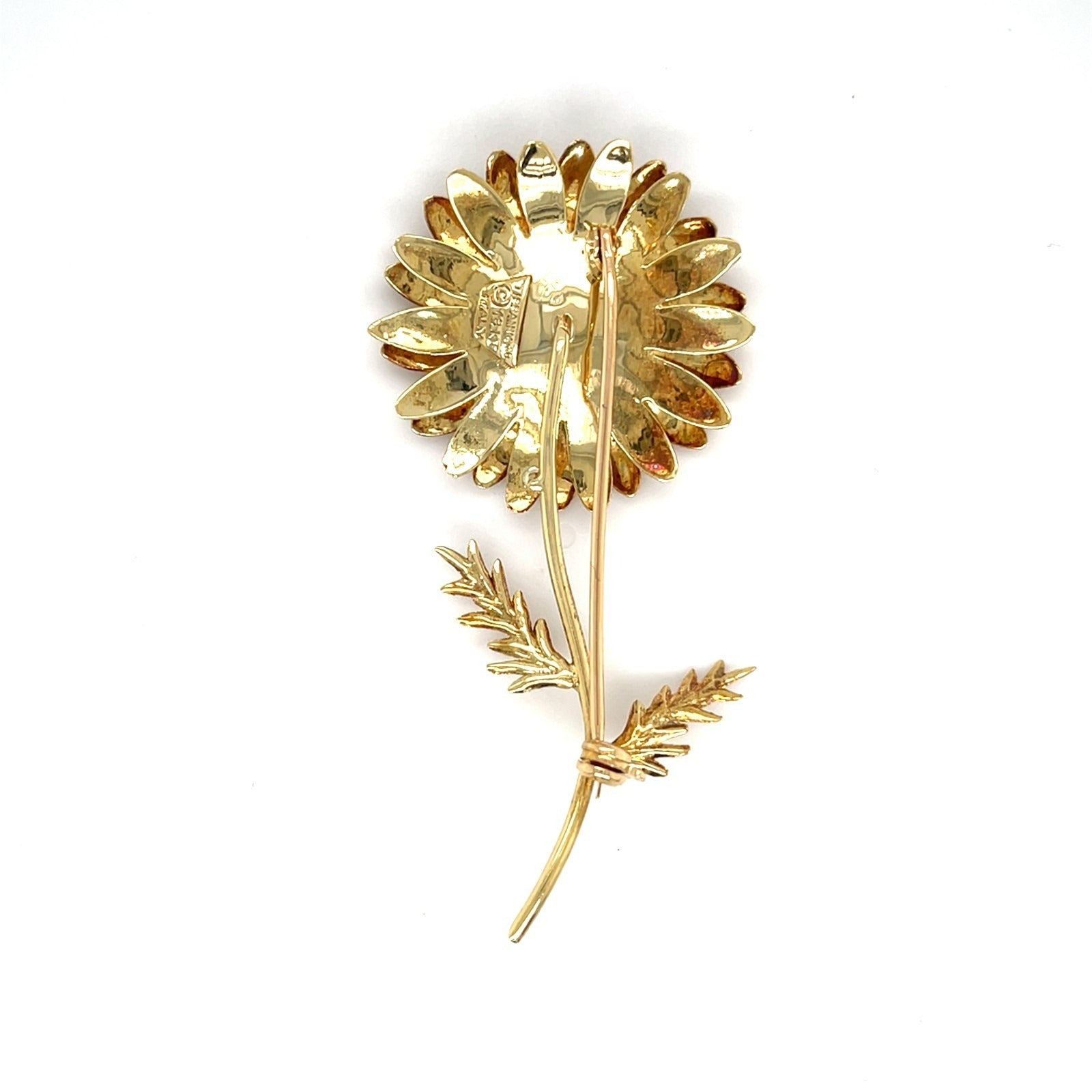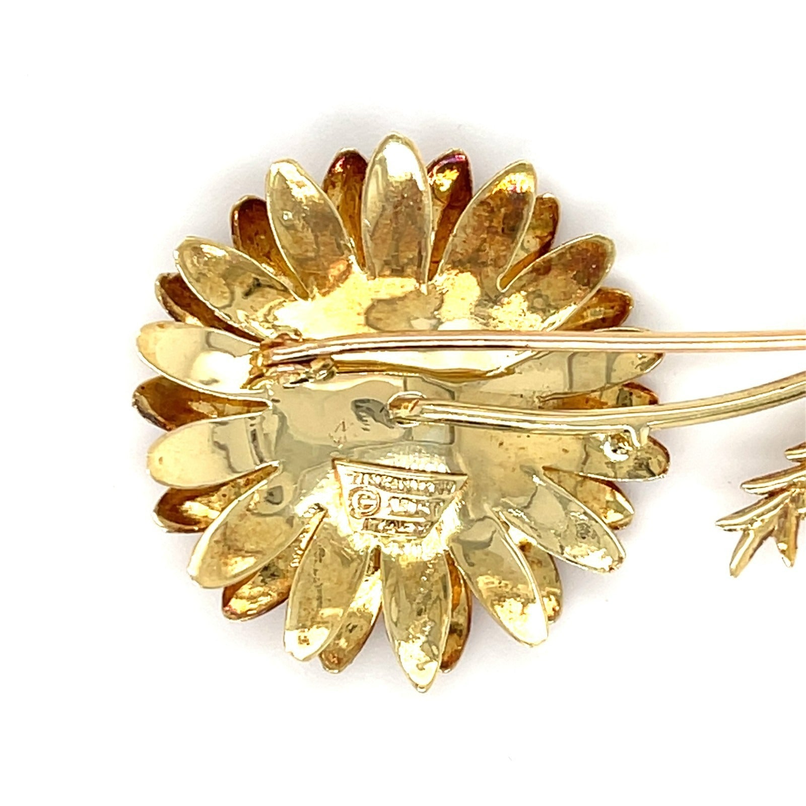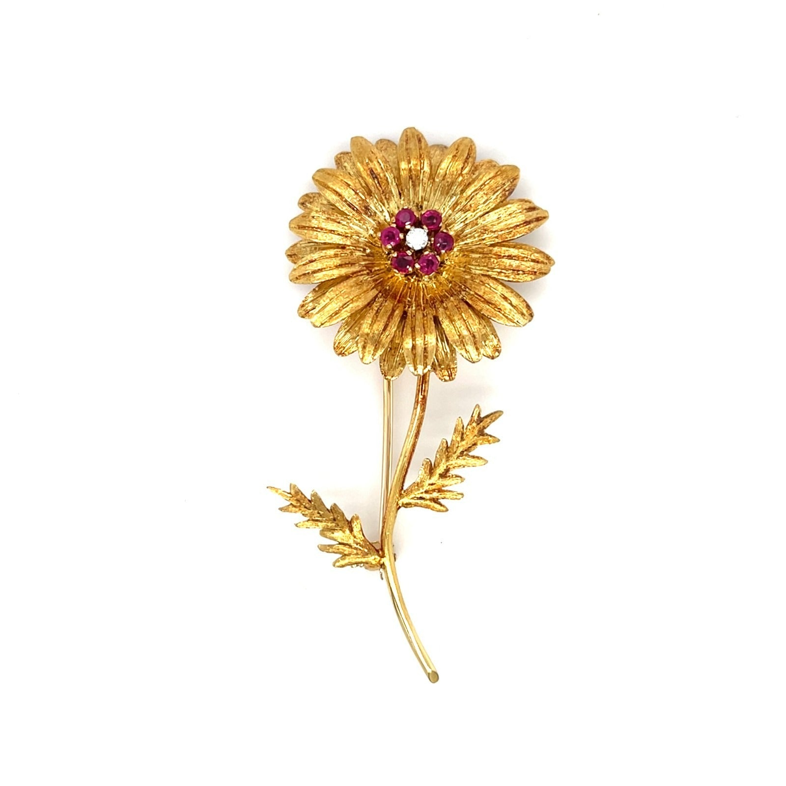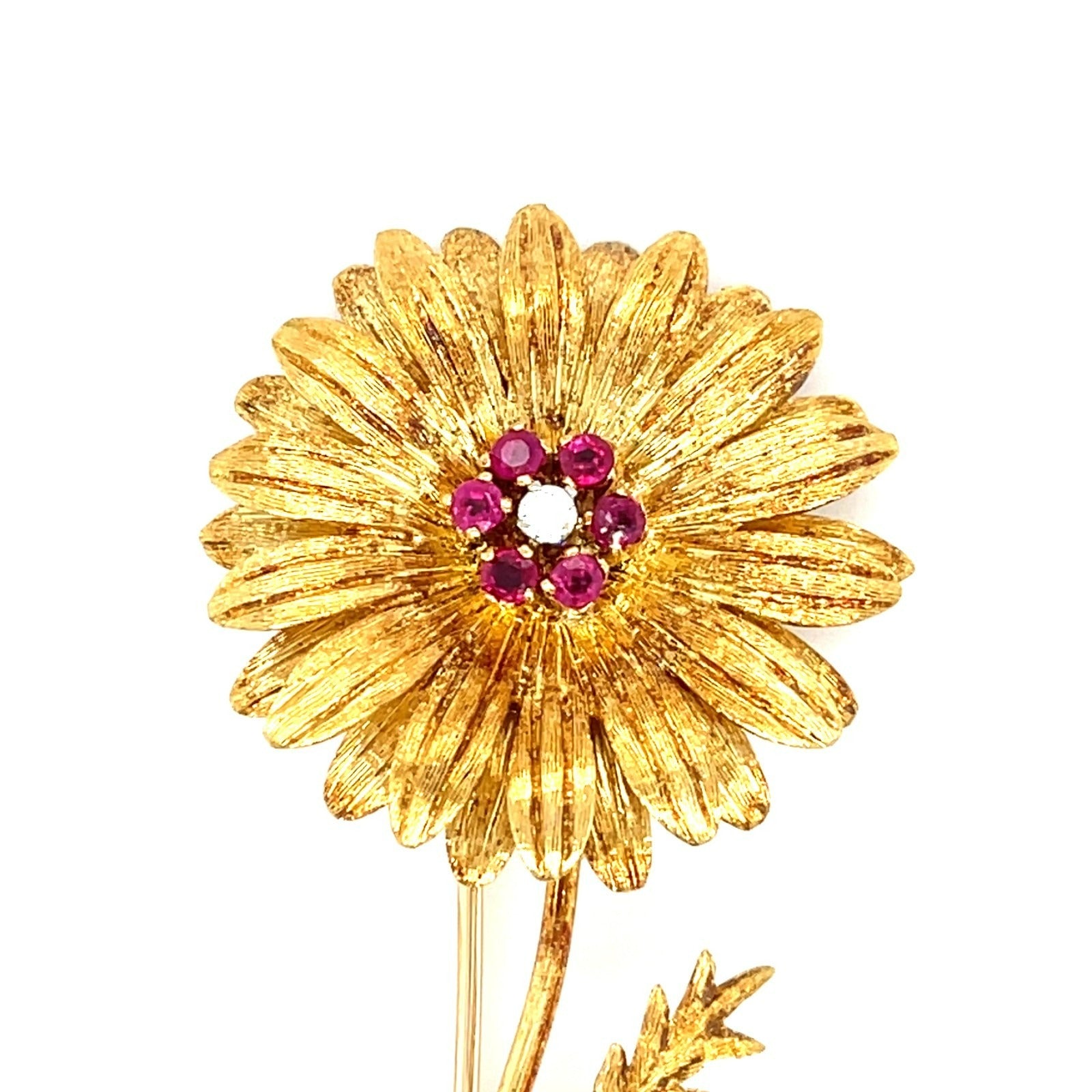 Vintage Tiffany & Co. 18K Gold Sunflower Brooch w/ Ruby, Diamond Accent, 2-7/8 inch