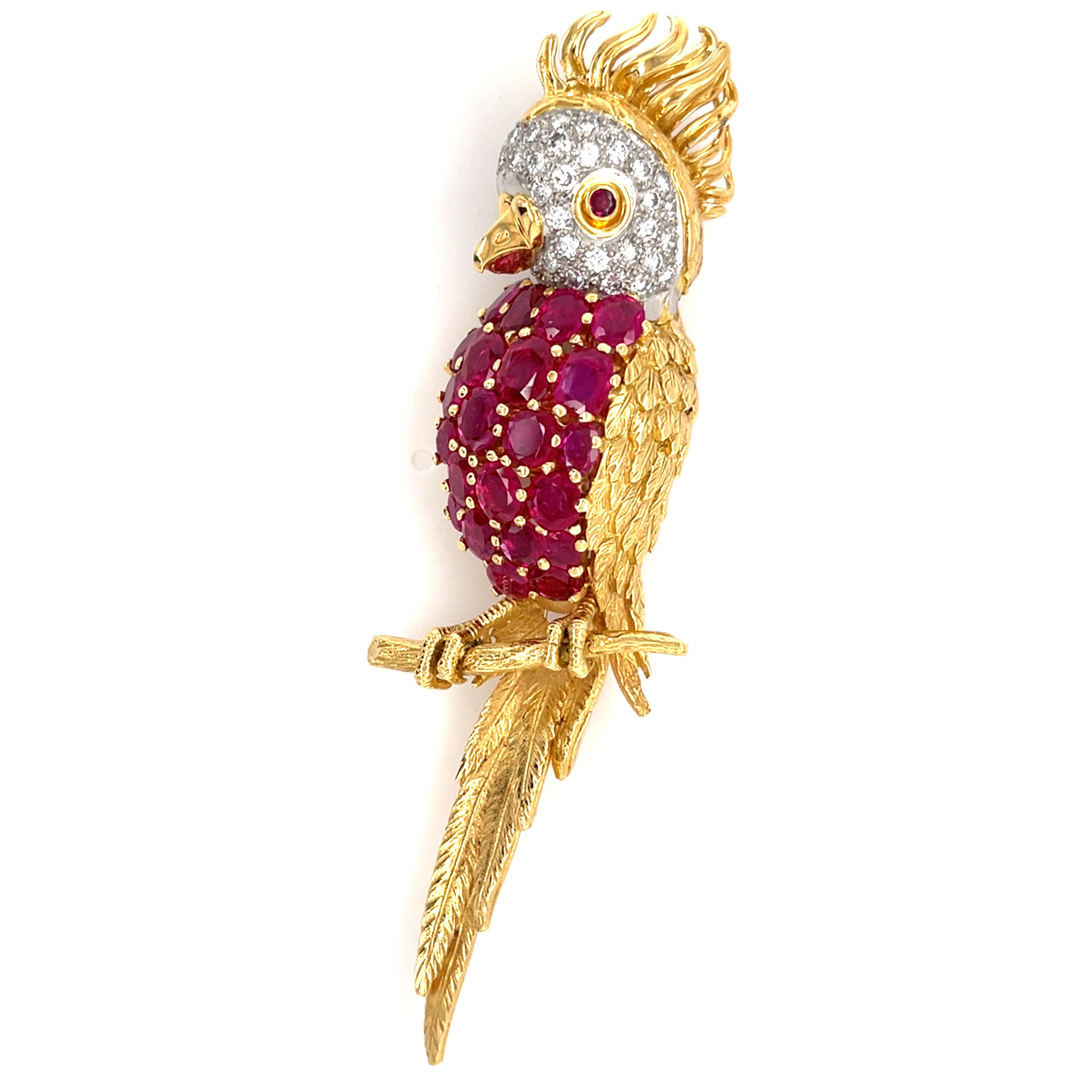 Sannit, Stein & Stein Vintage 18k Gold Cockatoo Brooch w/ 5.25ct Ruby, 0.65ct Diamond