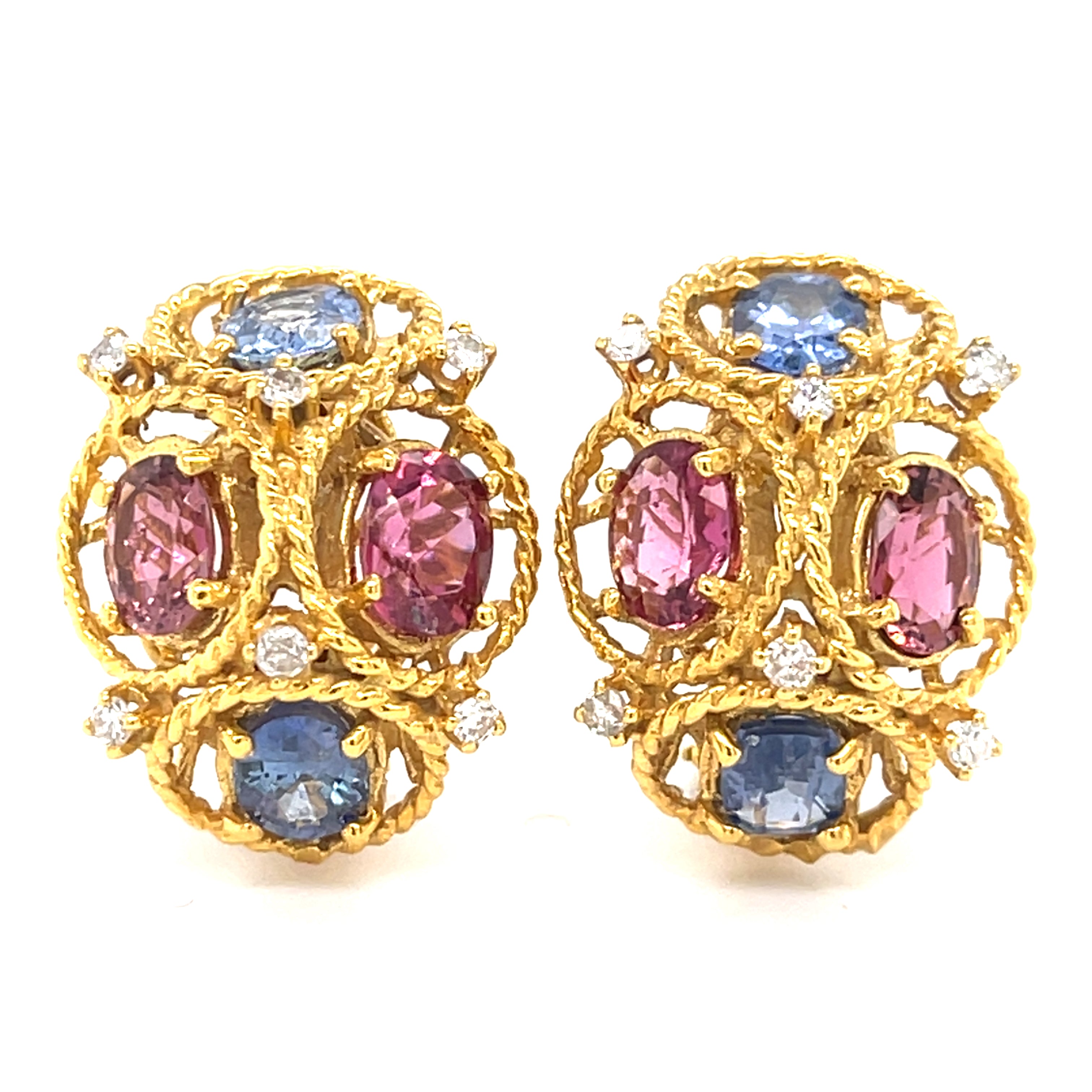 Jack Gutschneider 14k Gold, Tourmaline, Sapphire, and 0.35ct Diamond Earrings 1"