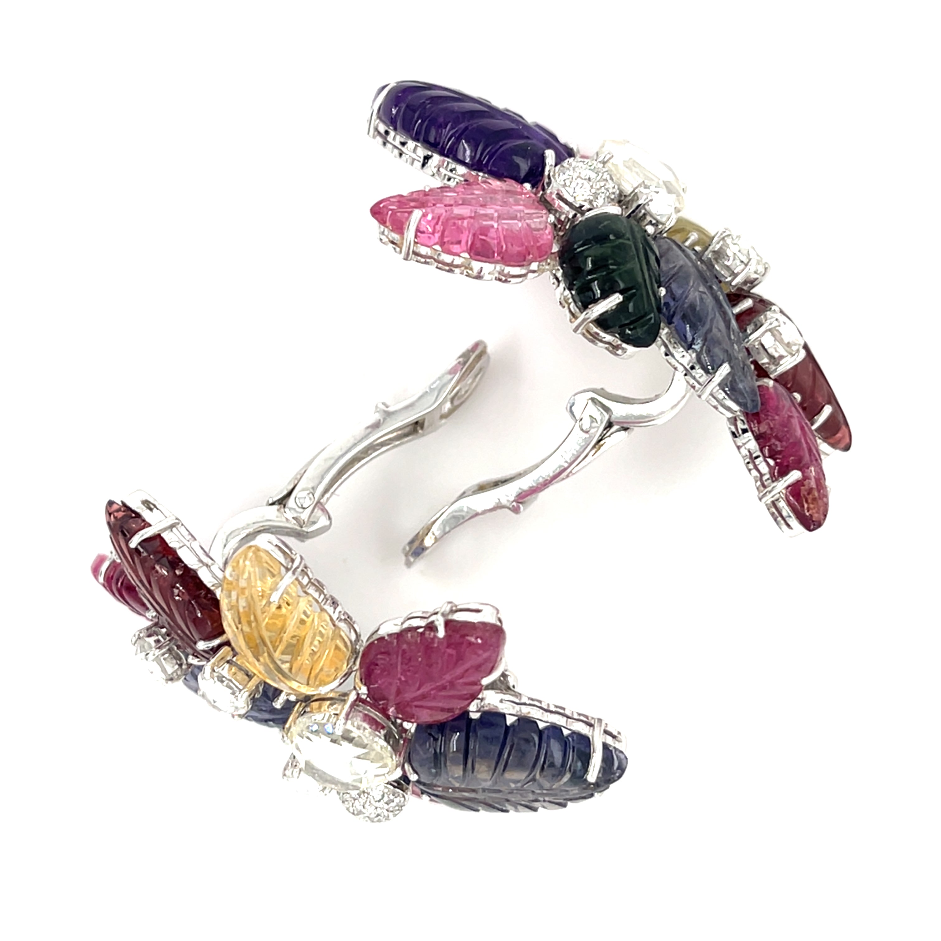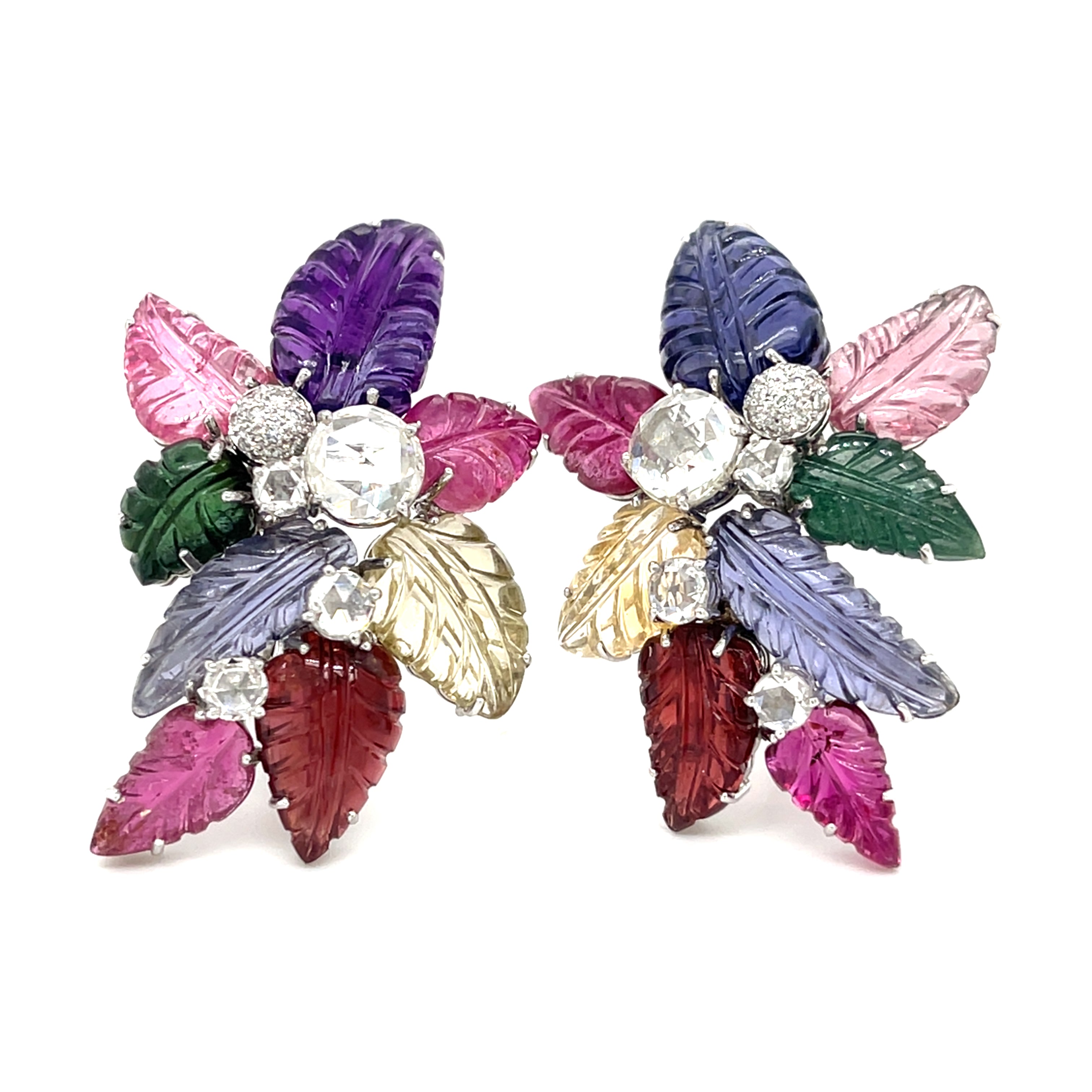 Amazing, Unique 18k White Gold Carved Semi-Precious Foliate Earrings