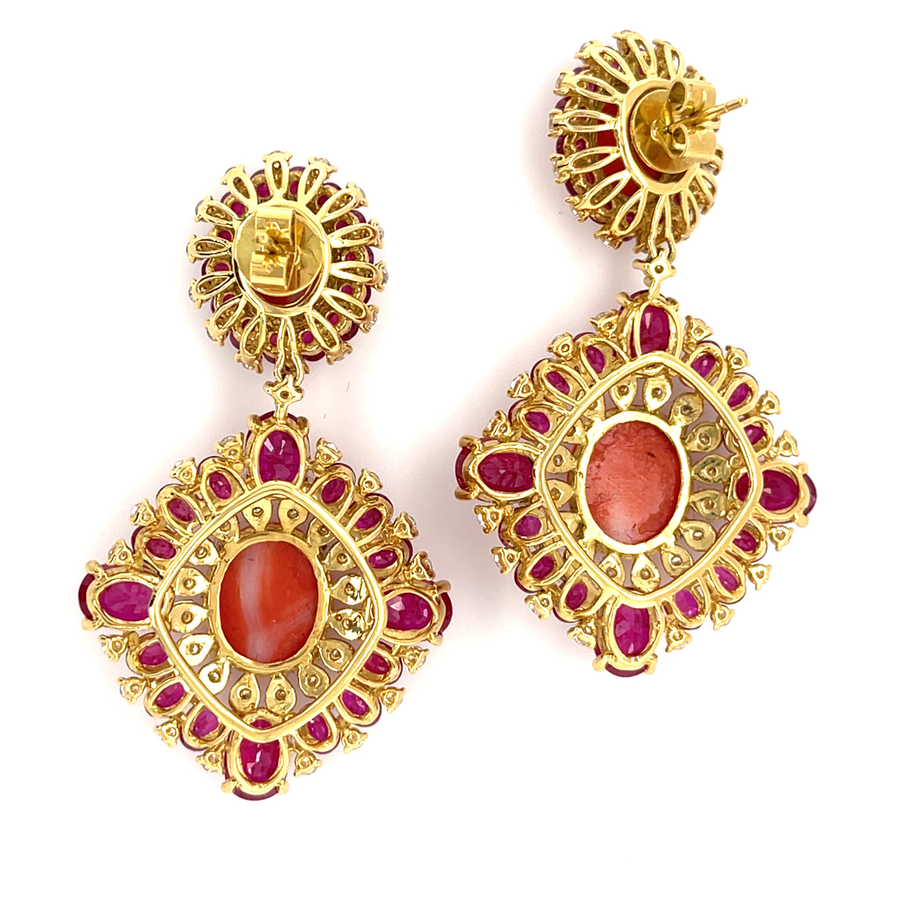Unique 18k Yellow Gold Coral, Ruby, and Diamond Drop Stud Earrings