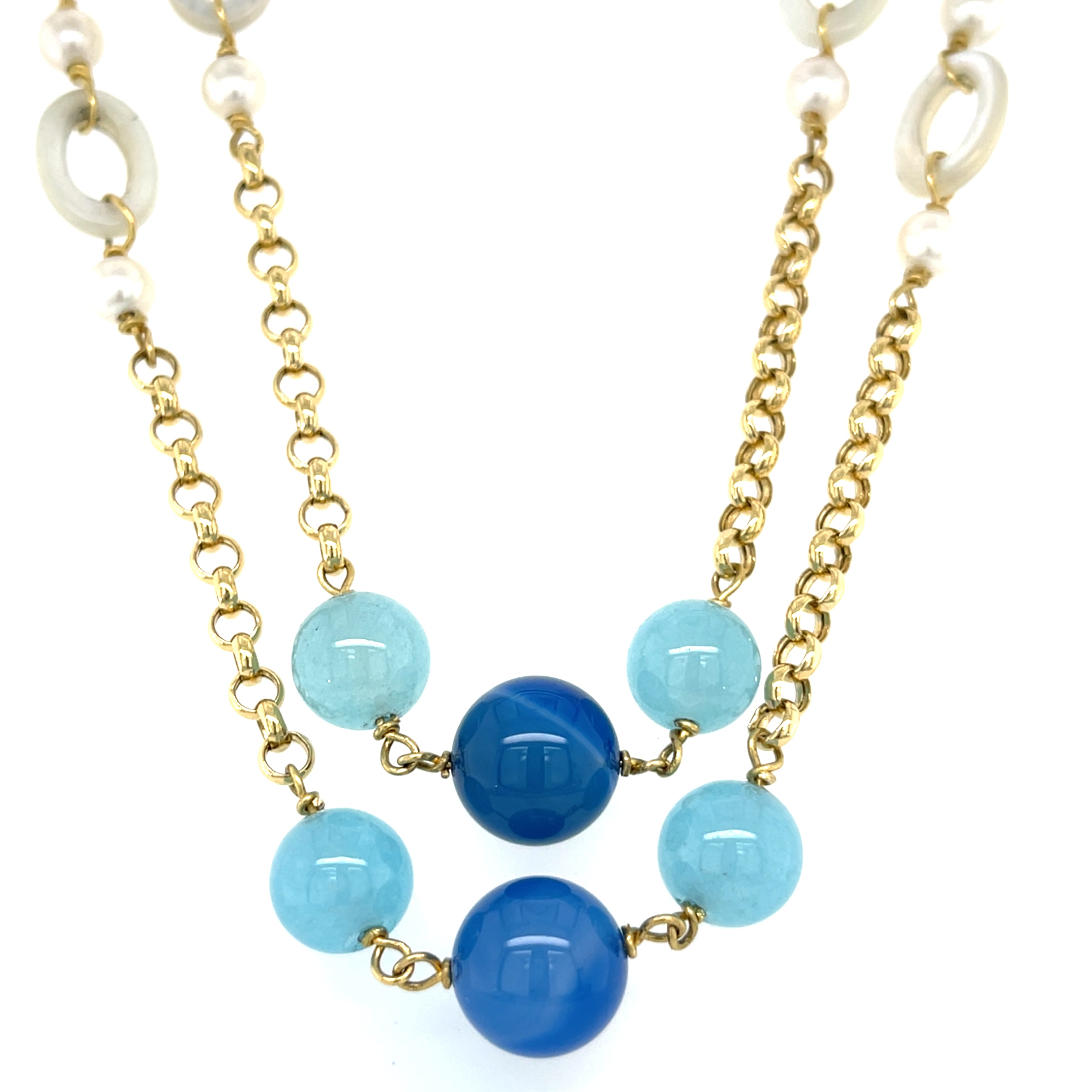 18k Yellow Gold & Cultured Pearl Strand Necklace w/ Dyed Chalcedony, Length 42"