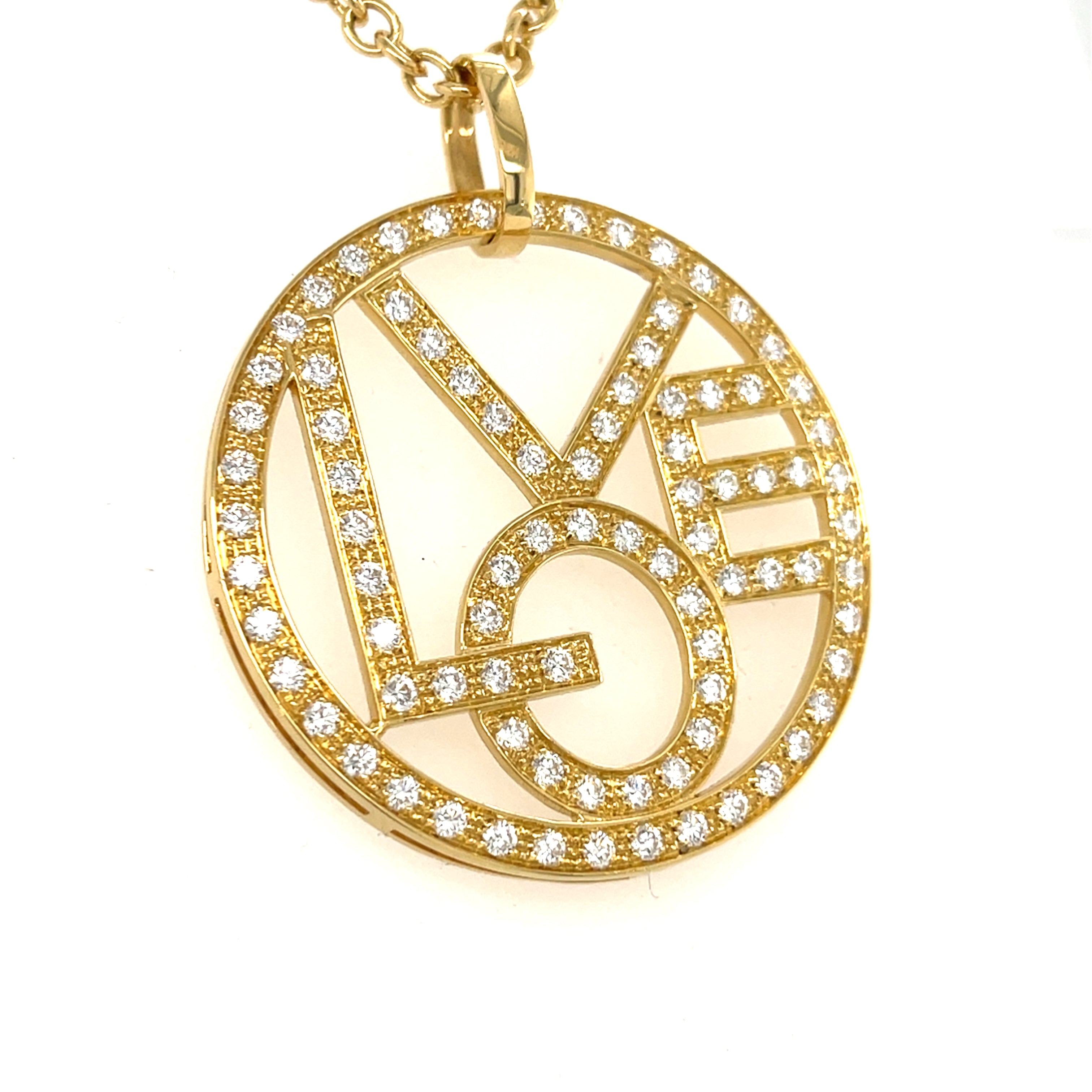18k Yellow Gold "LOVE" Disk Pendant Necklace w/ 6.96ct Diamond Accents, Length 34"