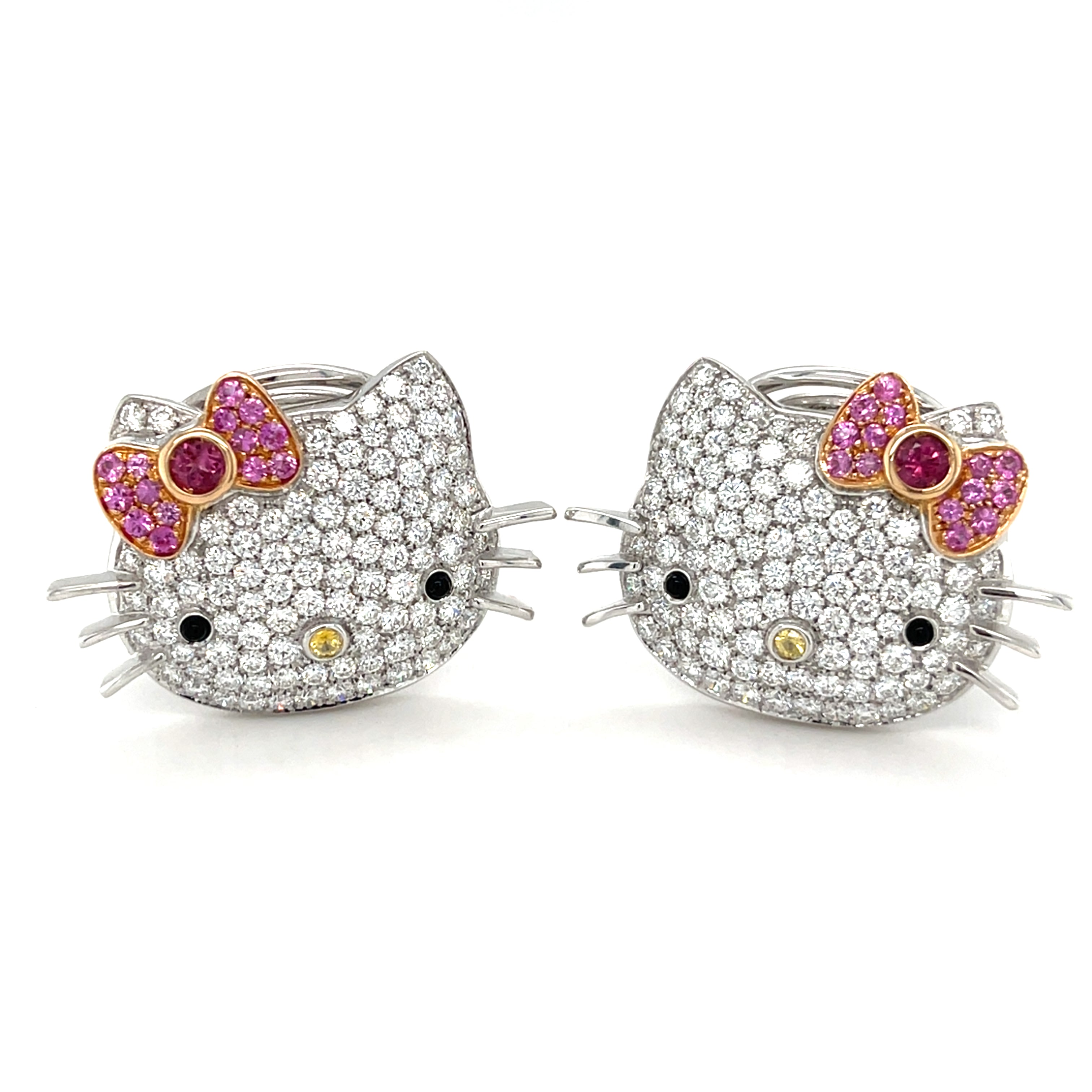 Happy Kitty 18k White Gold & 5.4ct Diamond Huggie Clip-On Cat Earrings, Made in Italy