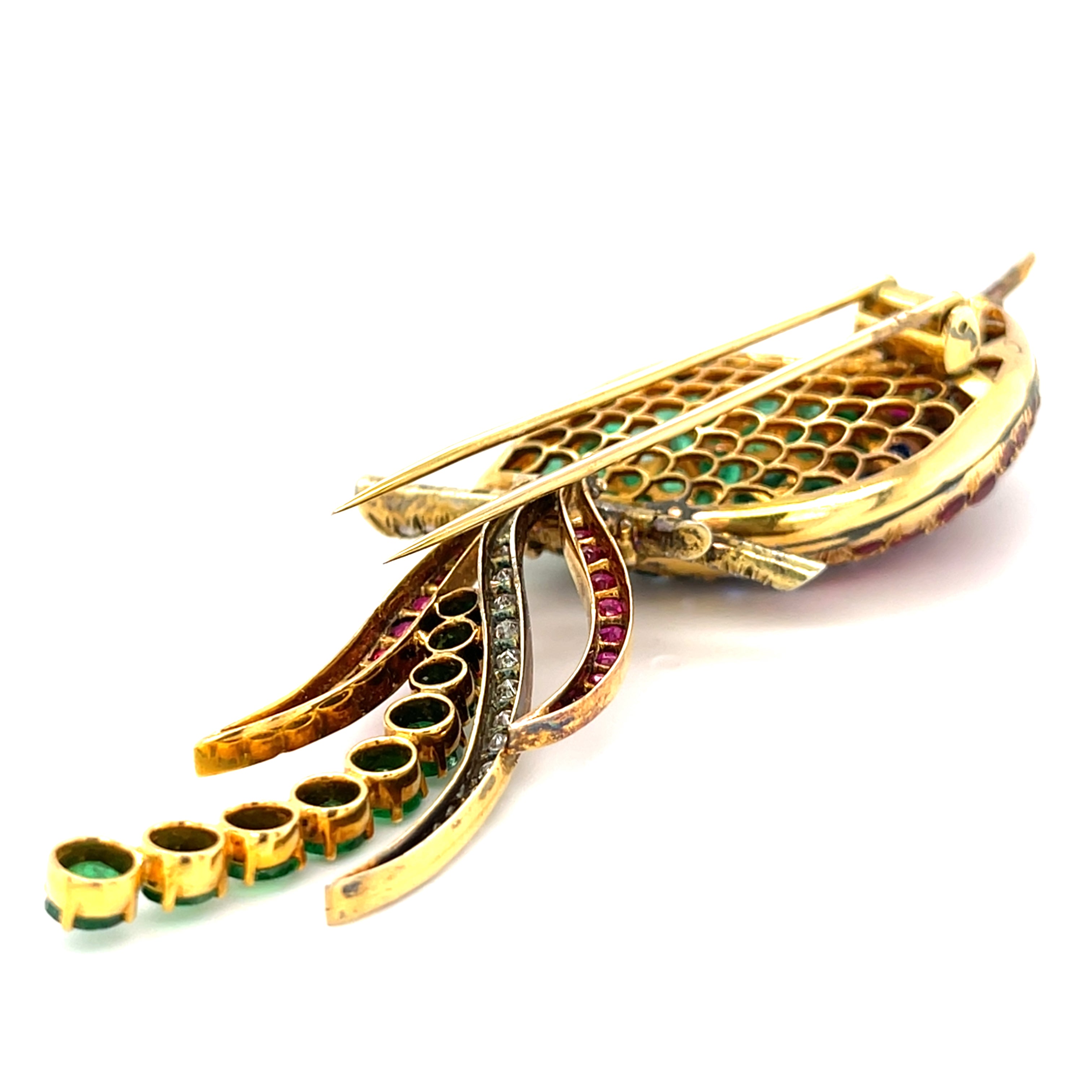 14k Gold & 25ct Multi-Gem Bird Brooch w/ Diamond, Emerald, Sapphire, Ruby